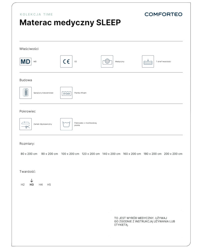The Sleep 80×200 cm mattress is a high-quality medical mattress designed for those seeking a combination of comfort, stable support, and support to alleviate spinal and muscle pain. Equipped with the CE and MD (Medical Device) markings, this mattress meets stringent standards for medical devices and is recommended by physiotherapists and physicians.