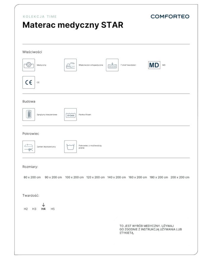 The Star 80×200 cm medical mattress with a firmness rating of H4 is a modern solution designed for those seeking comfort and professional orthopedic support. It’s a perfect combination of classic pocket springs and modern, exceptionally durable XFoam foam, guaranteeing a comfortable and healthy night’s sleep.