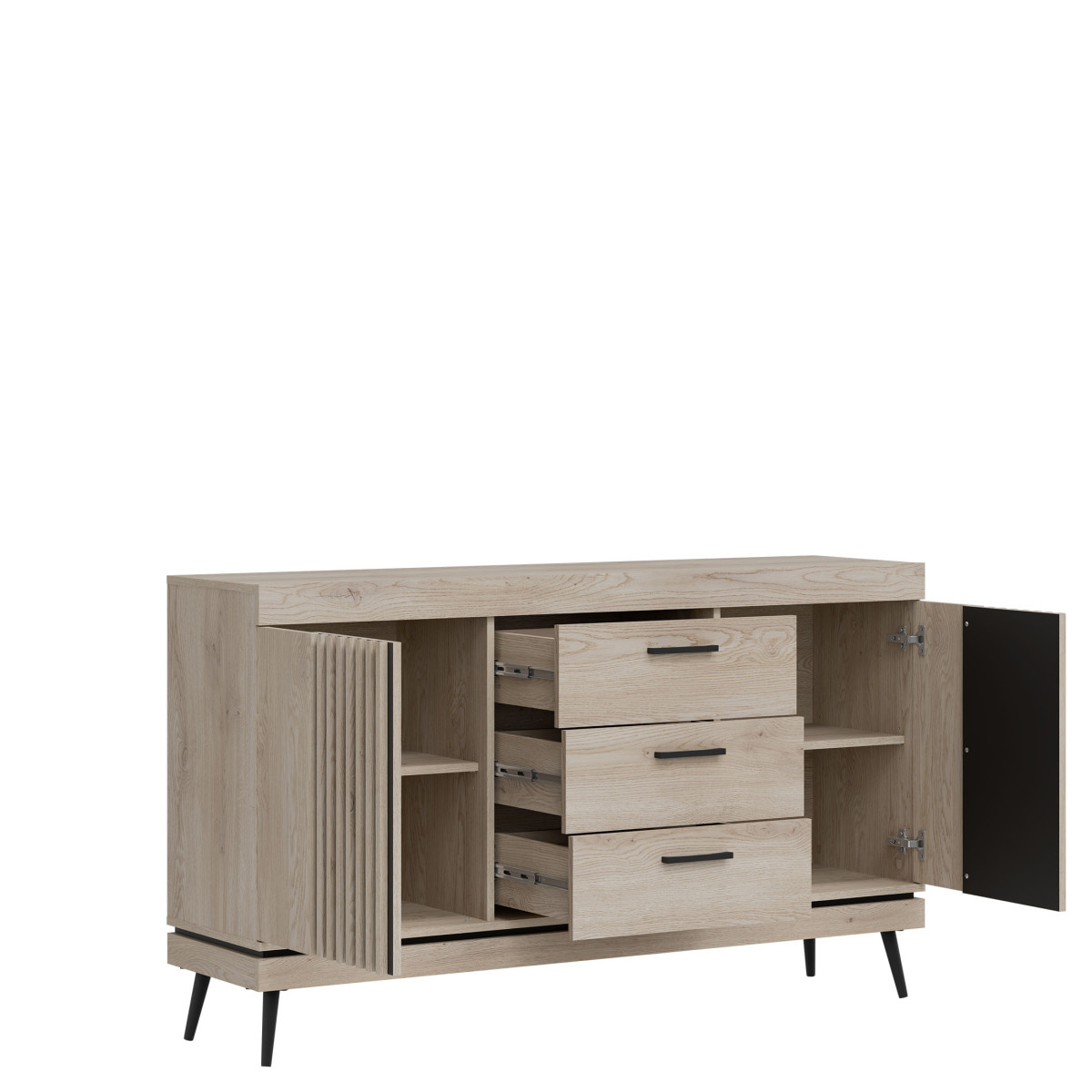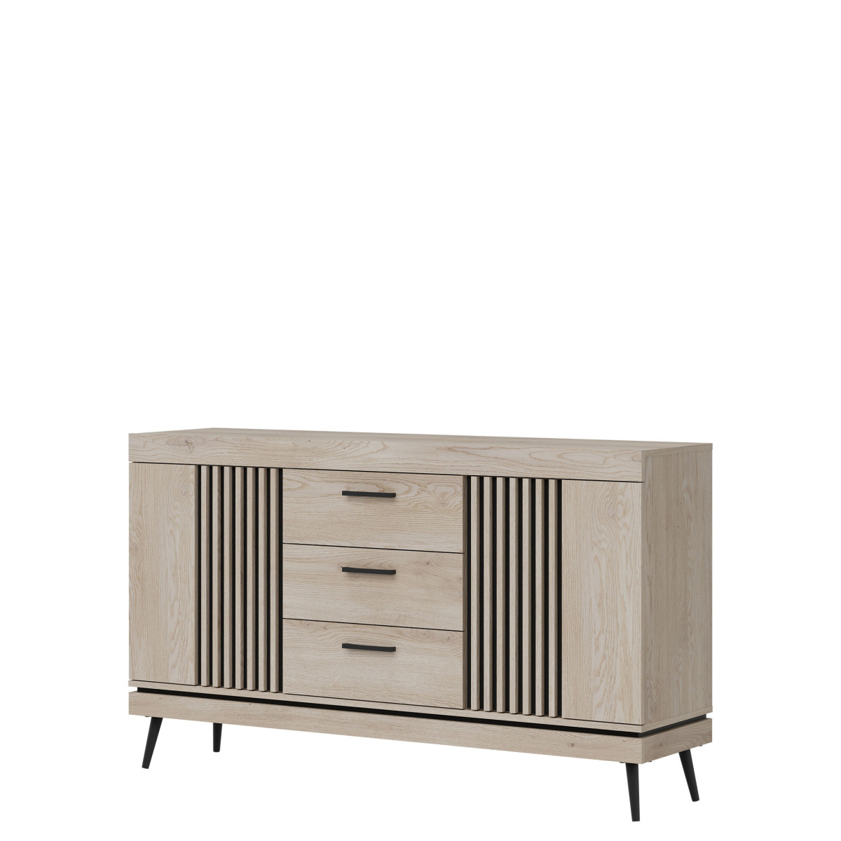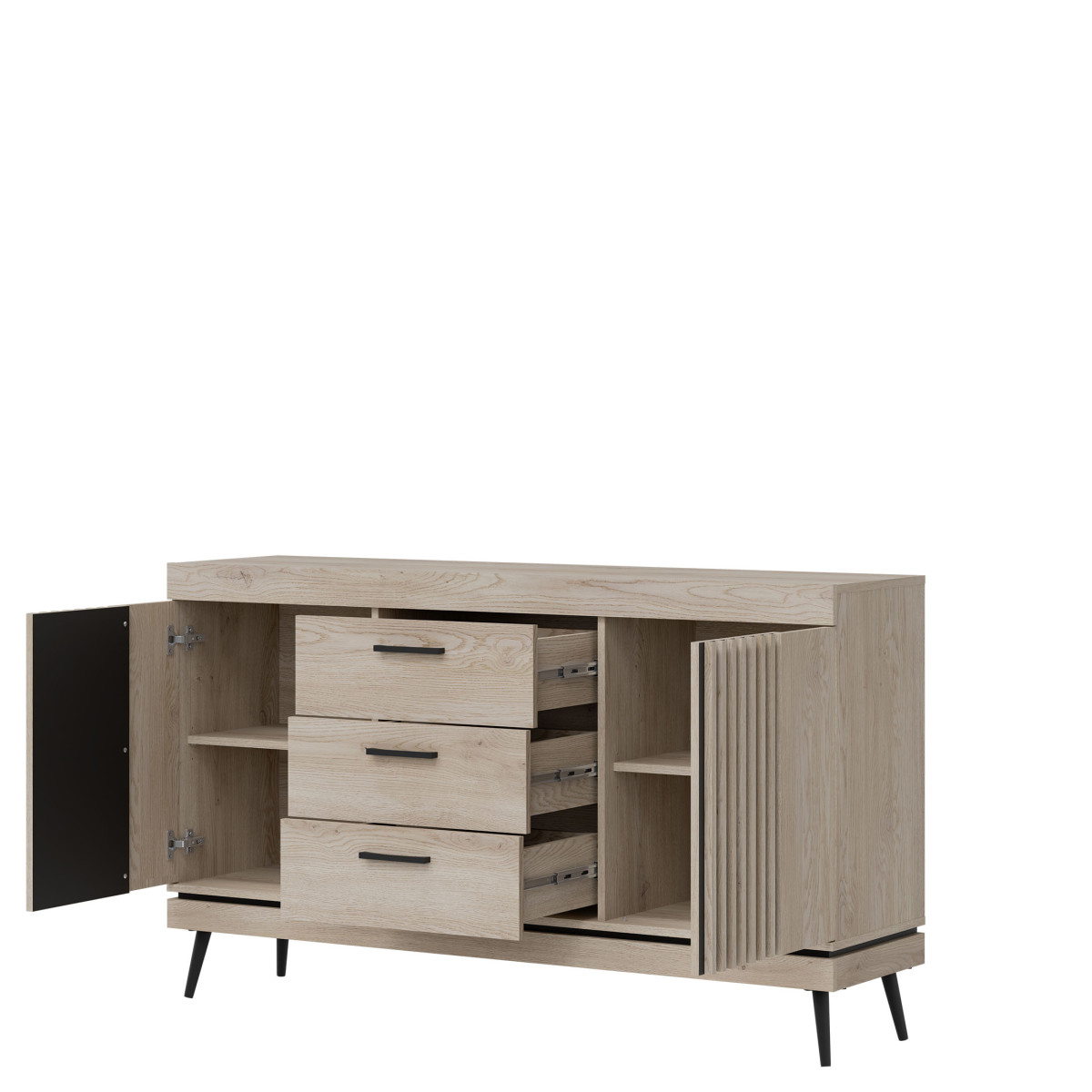 Width 155 cm Depth 40 cm Height 91 cm Product weight with packaging 57.20 kg Manufacturer’s code / symbol MI04 Collection name MATI Name in the b2b system MATI MI04 OAK CREM COTTA/CZ CHEST OF CHESTS KPL Number of product packages 3 Style Modern Equipment Assembly instructions / assembly accessories Assembly For self-assembly Body color Cremona cotta oak / Black Body material / type / thickness 16 mm furniture board Top of body material / type / thickness 16 mm furniture board Bottom of body material / type / thickness 16 mm furniture board Base of body material / type / thickness 16 mm furniture board Shelf color Cremona cotta oak Shelf material / type / thickness 16 mm furniture board Shelf quantity 2 Back wall material / type / thickness 2.5 mm HDF furniture board Back wall visible part Color: Oak cotta Front: Cremona cotta oak / Black Front: Material / Type / Thickness: 16 mm furniture board / lamellas: 16 mm MDF furniture board Front hinge: ⌀ 35 mm adjustable in three planes Front handle / Finish / Color: Plastic / Black Soft-close door system Standard Full extension drawer guides Leg / Finish / Color: Non-adjustable / Metal / Black Leg height: 150 mm Number of doors: 2 Number of drawers: 3 Number of closed niches: 4