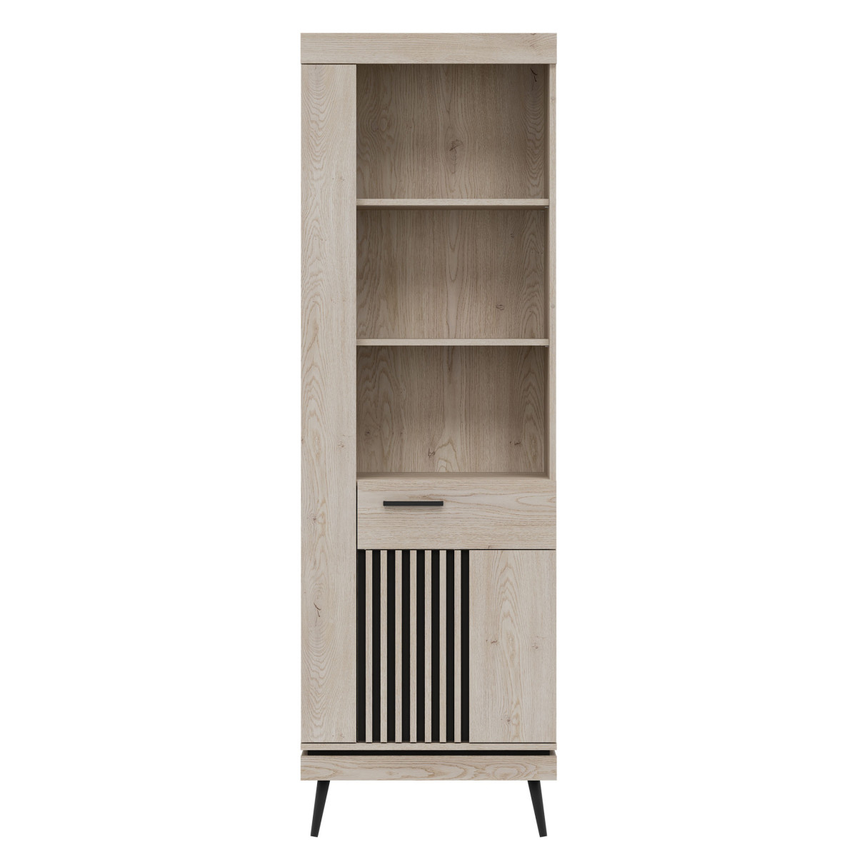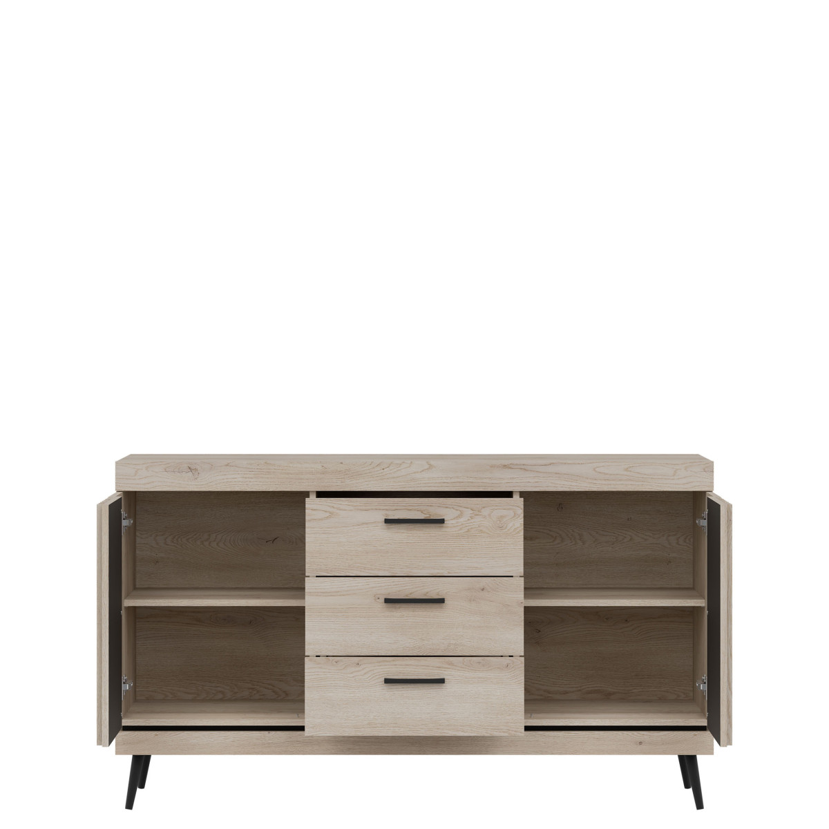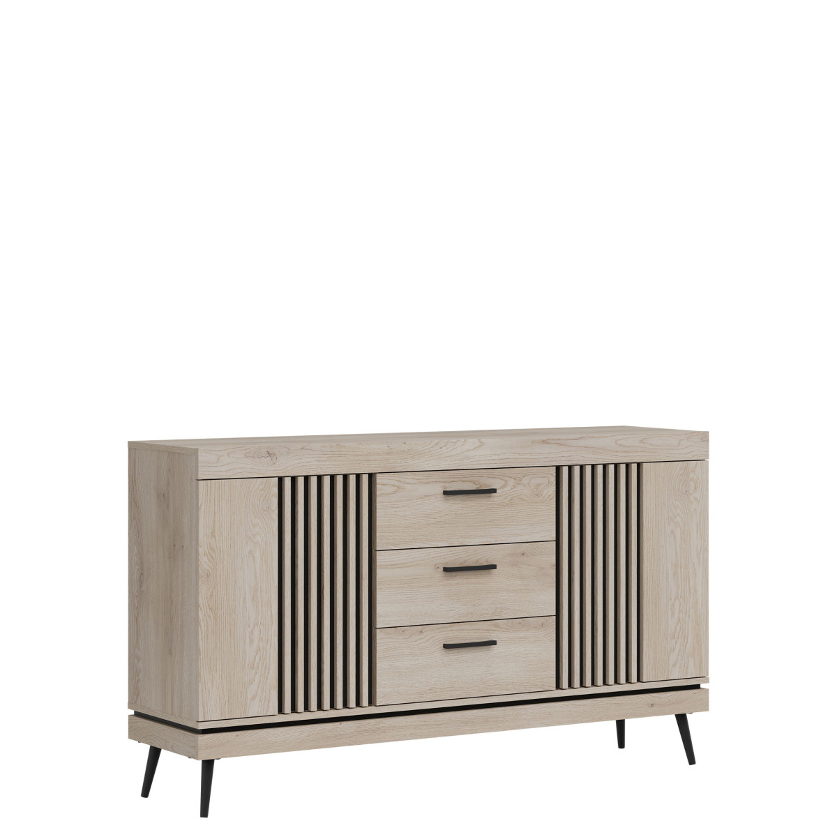 Width 155 cm Depth 40 cm Height 91 cm Product weight with packaging 57.20 kg Manufacturer’s code / symbol MI04 Collection name MATI Name in the b2b system MATI MI04 OAK CREM COTTA/CZ CHEST OF CHESTS KPL Number of product packages 3 Style Modern Equipment Assembly instructions / assembly accessories Assembly For self-assembly Body color Cremona cotta oak / Black Body material / type / thickness 16 mm furniture board Top of body material / type / thickness 16 mm furniture board Bottom of body material / type / thickness 16 mm furniture board Base of body material / type / thickness 16 mm furniture board Shelf color Cremona cotta oak Shelf material / type / thickness 16 mm furniture board Shelf quantity 2 Back wall material / type / thickness 2.5 mm HDF furniture board Back wall visible part Color: Oak cotta Front: Cremona cotta oak / Black Front: Material / Type / Thickness: 16 mm furniture board / lamellas: 16 mm MDF furniture board Front hinge: ⌀ 35 mm adjustable in three planes Front handle / Finish / Color: Plastic / Black Soft-close door system Standard Full extension drawer guides Leg / Finish / Color: Non-adjustable / Metal / Black Leg height: 150 mm Number of doors: 2 Number of drawers: 3 Number of closed niches: 4
