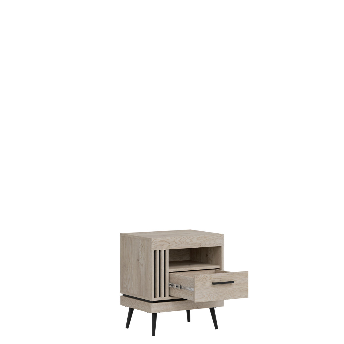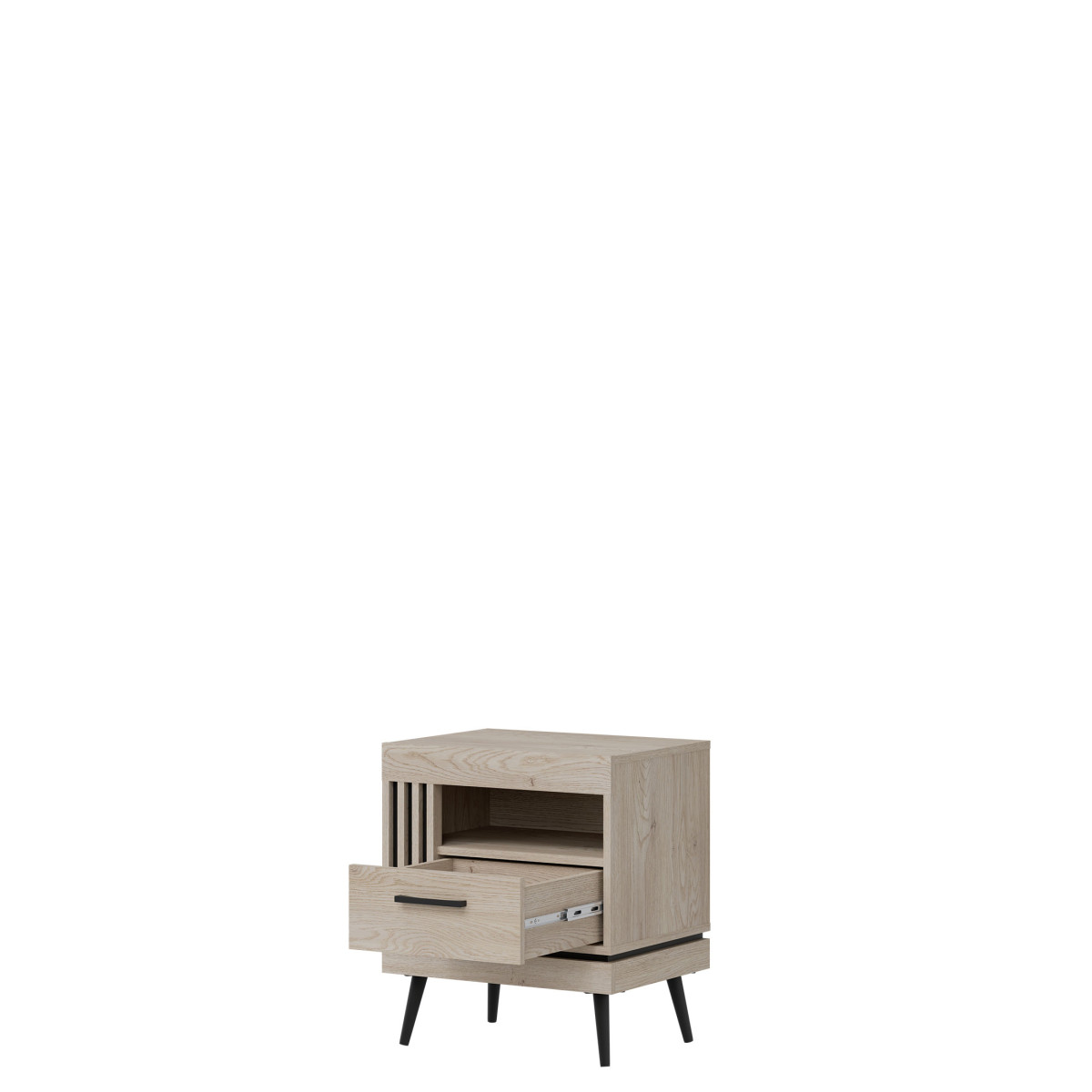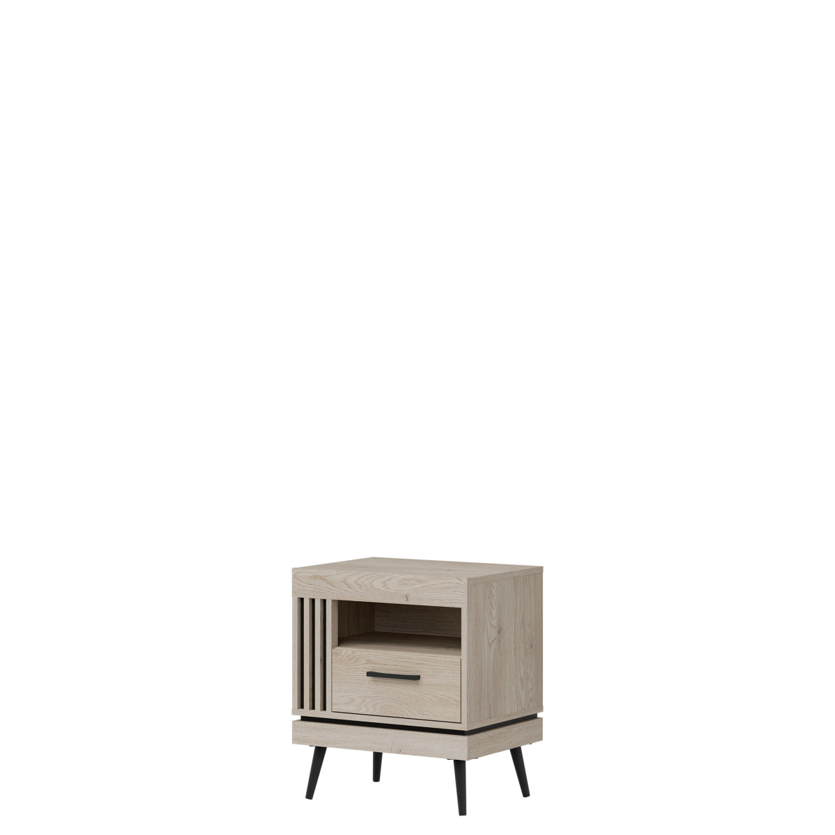 The stylish and functional MI19 nightstand in Cremona Cotta oak with black legs perfectly complements a bedroom from the Mati collection. Its minimalist design and warm oak tone, combined with elegant black legs, create a harmonious whole that perfectly complements the beds from the same collection. Equipped with one spacious drawer, it offers convenient storage for small items. Solid construction ensures durability and an elegant look that will enhance any interior.