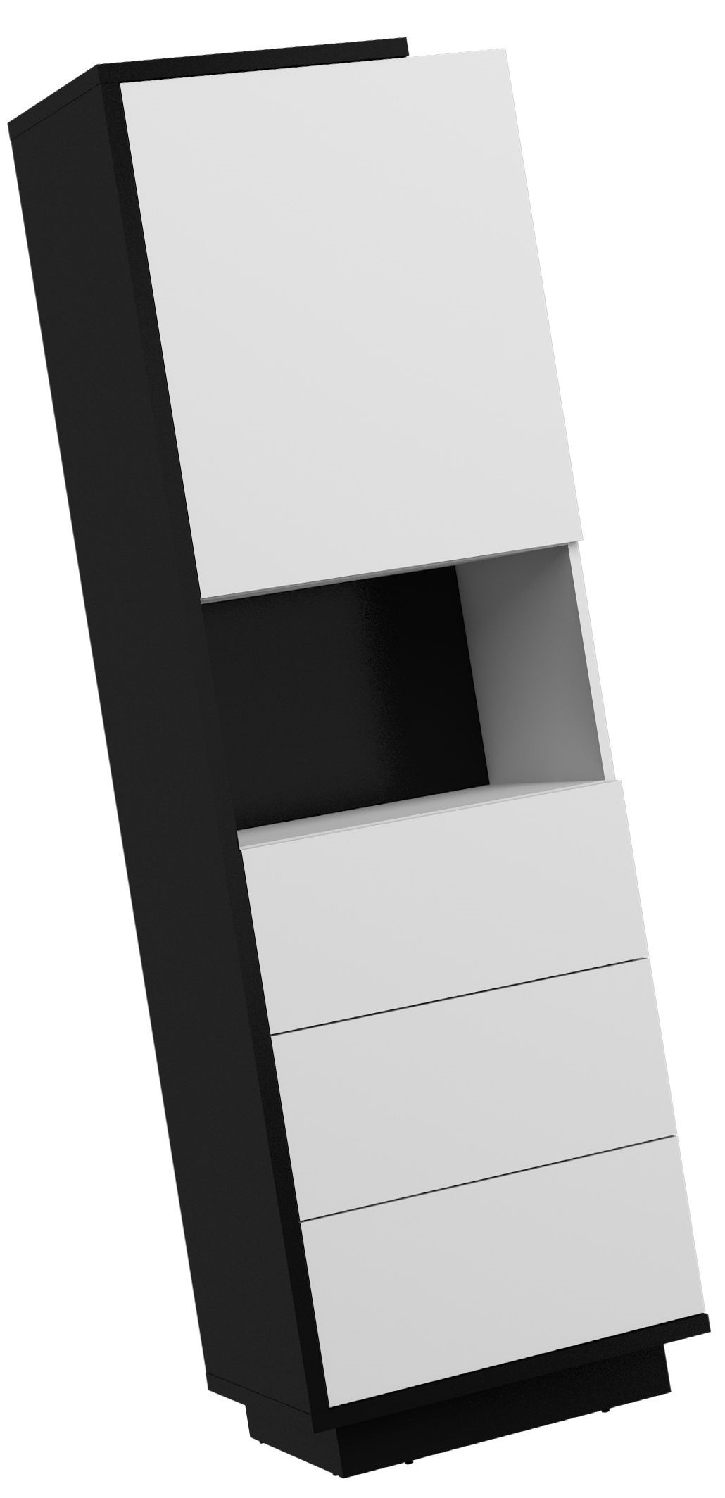 BRITA 18 baldai, aukšta lentyna su stalčiais, durelėmis, lentyna, juodai balta blizgi