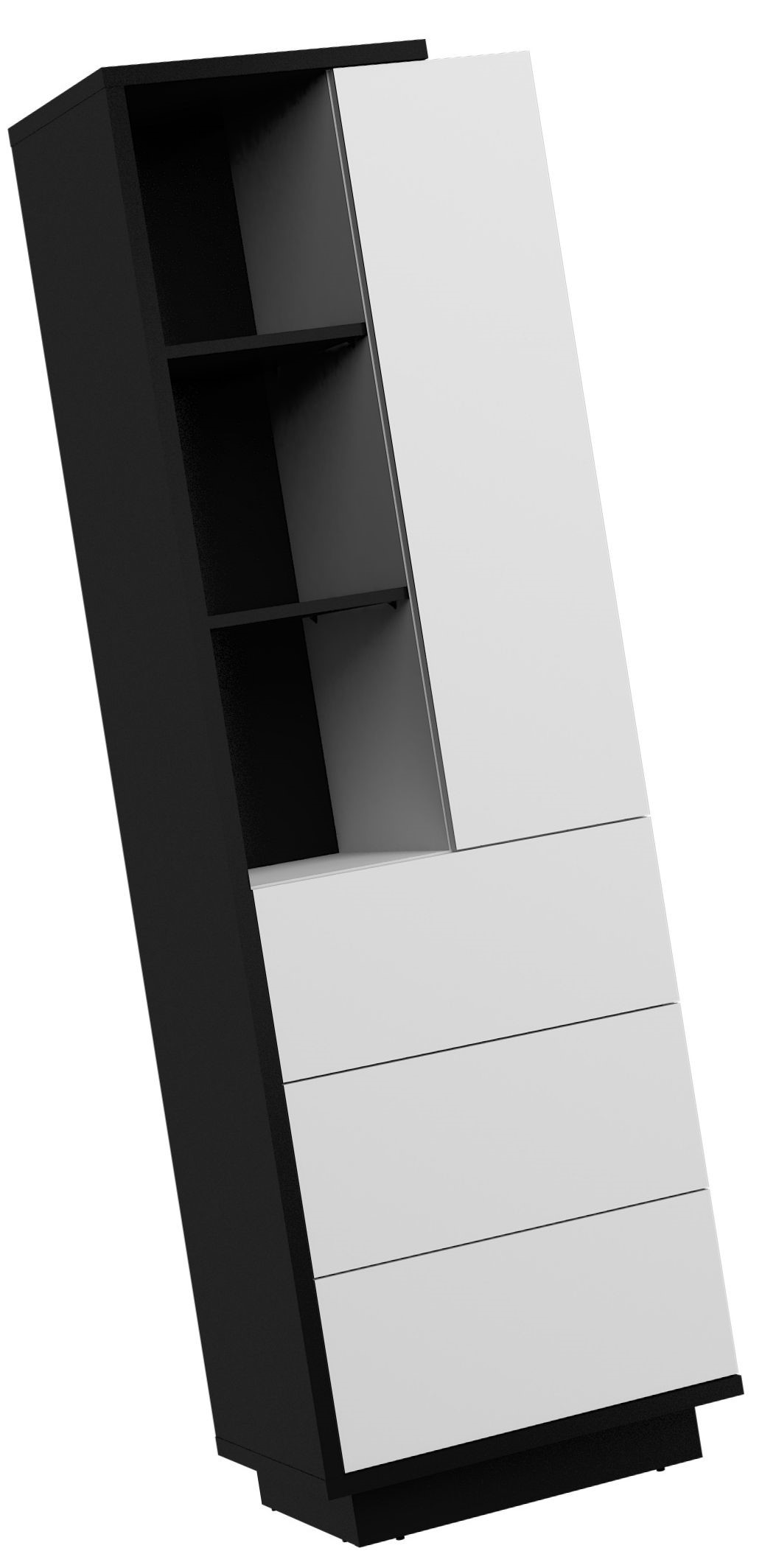 BRITA 19 baldai, aukšta lentyna su lentynomis, stalčius, durys, juodai balta blizgi spalva