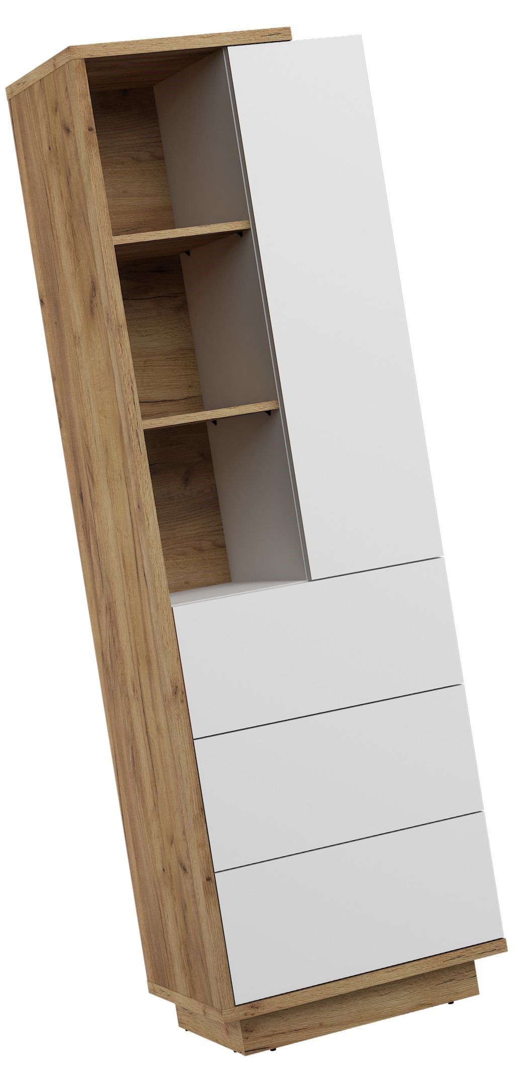 BRITA 19 baldai, aukšta knygų lentyna su lentynomis, stalčiumi, durelėmis, auksinio ąžuolo spalvos, balta
