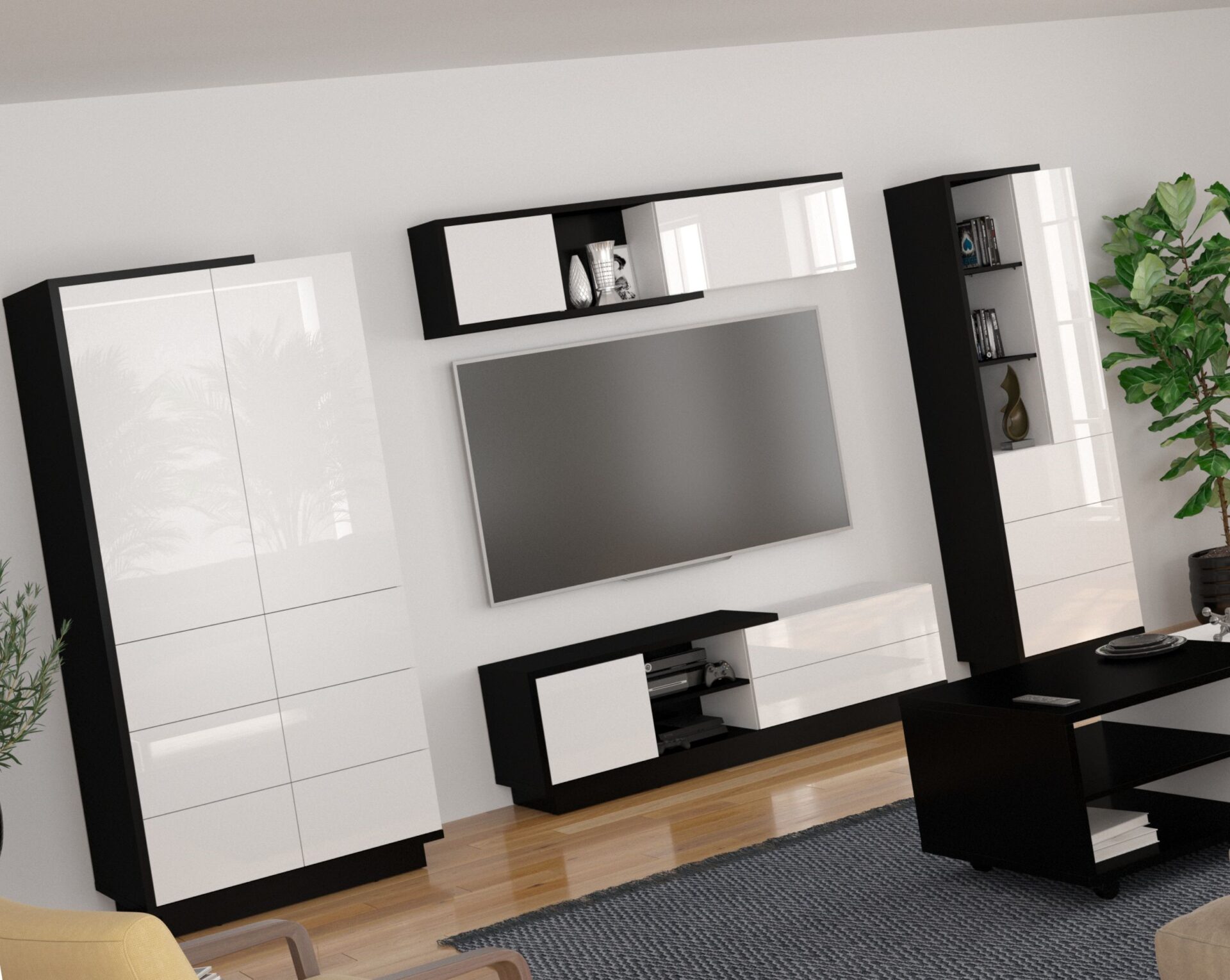 Be the first to review “BRITA baldai #2 spinta TV spintelė lentyna knygų lentyna juoda balta blizgi”