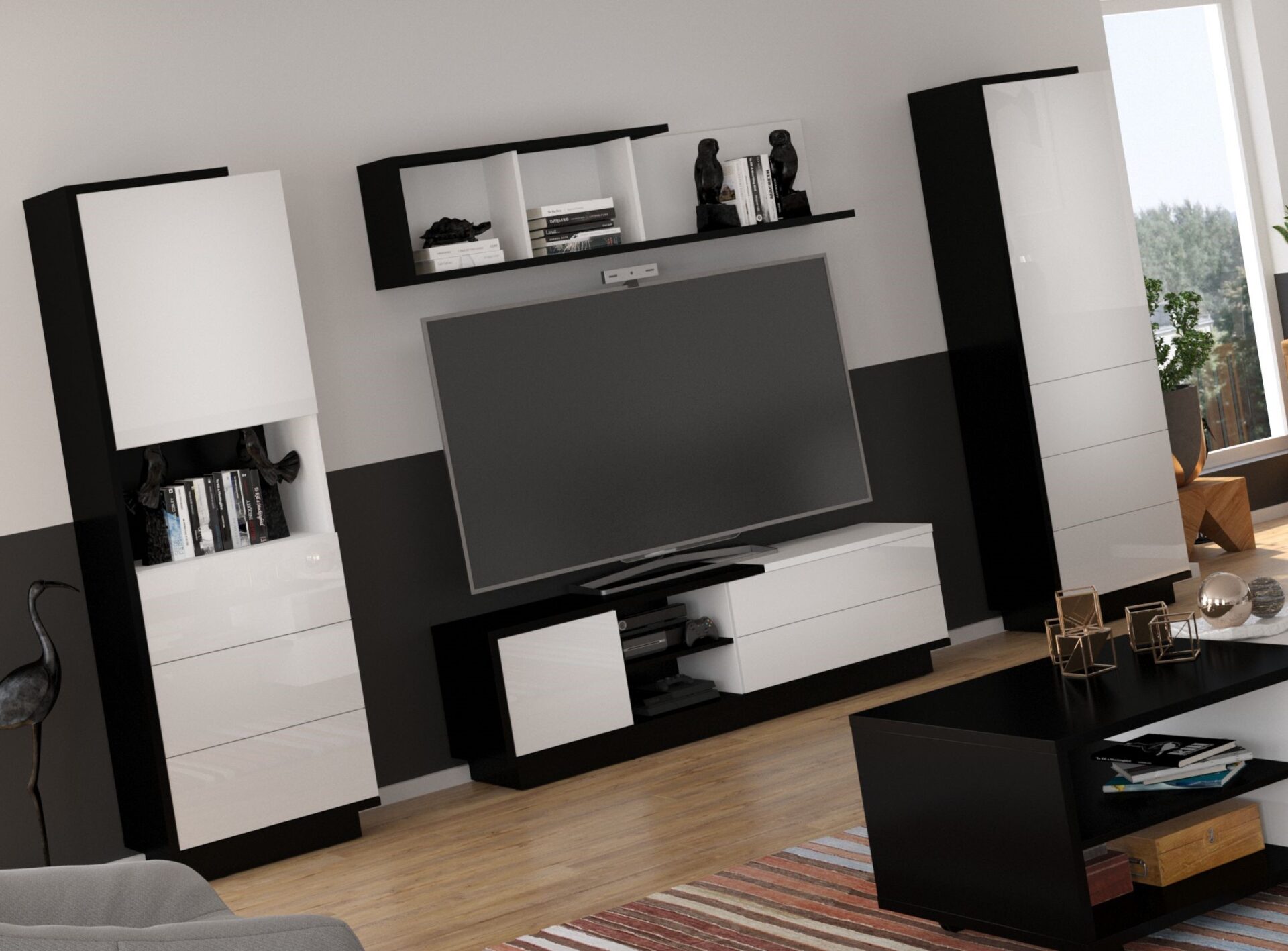 BRITA baldai #3 sieninė spintelė, knygų lentyna, televizoriaus spintelė, lentyna, juodai balta blizgi