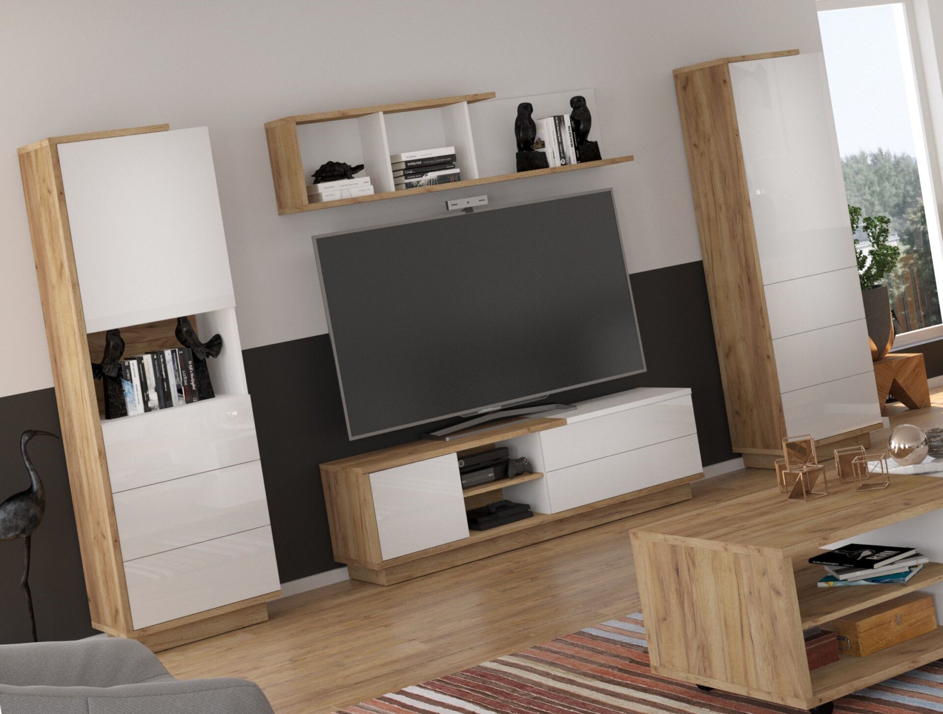 BRITA baldai #3 sieninė sekcija knygų lentyna TV spintelė lentyna ąžuolas aukso balta
