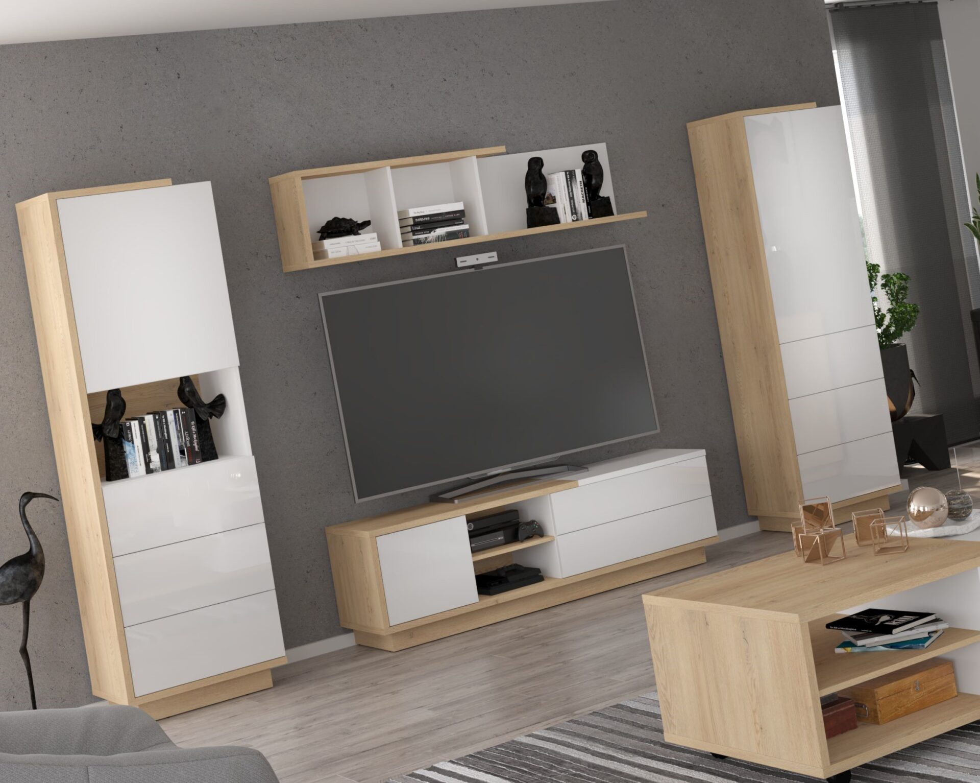 BRITA baldai #3 sieninė spintelė, knygų lentyna, TV spintelė, lentyna, ąžuolas „Cremona“, balta blizgi spalva