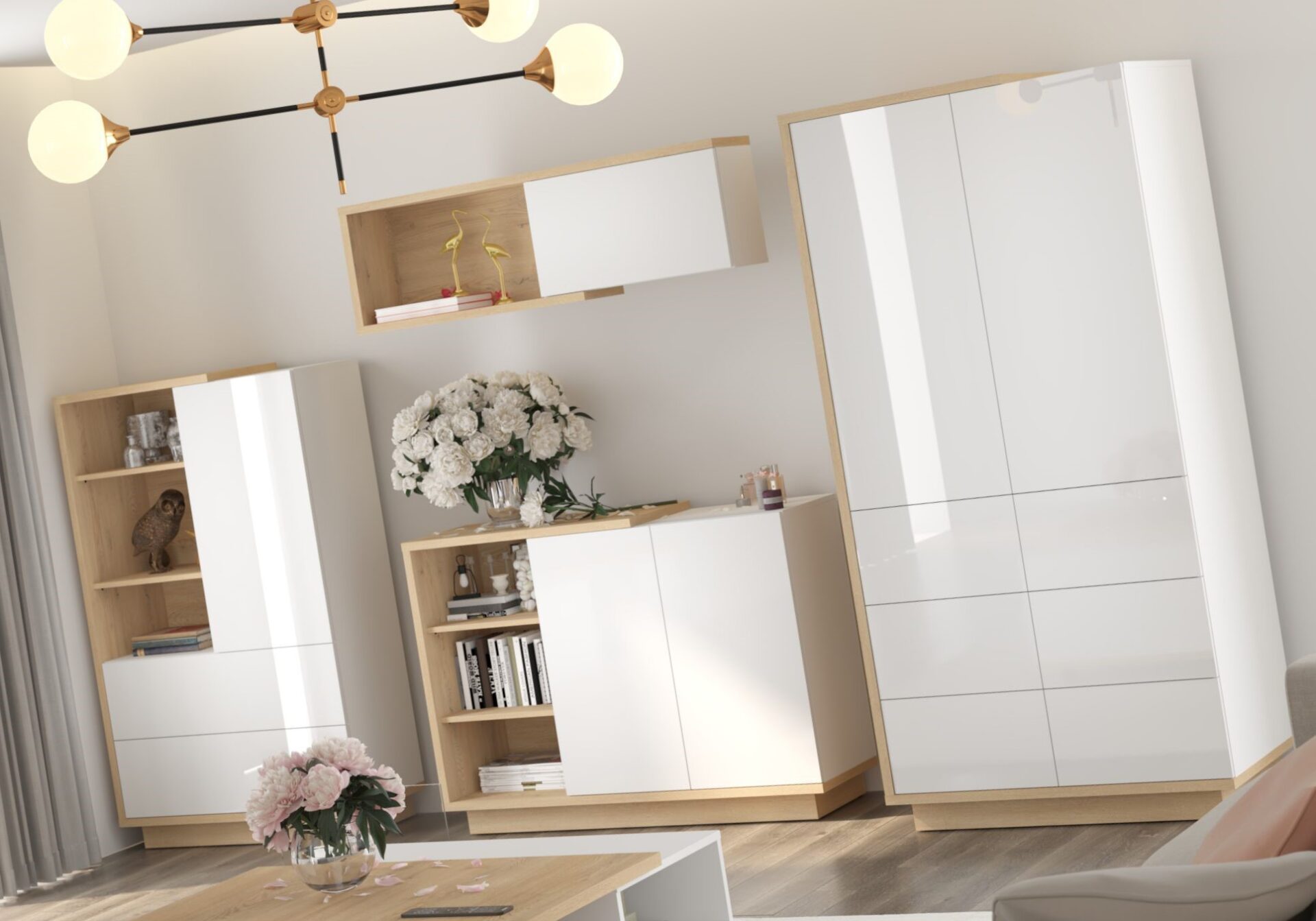 The set includes: BRITA 05 2-door chest of drawers 120/89/40 – 48 kg – 2p; BRITA 17 1-door shelving unit 2S 90/147/40 – 65 kg – 2p; BRITA 23 2-door wardrobe 90/191/60 – 91 kg – 3p; BRITA 24 1-door wall cabinet 120/38/25 – 17 kg – 1p. The furniture is made of 16mm and 25mm thick chipboard with ABS edging. The drawers and doors have push-to-open opening. The pedestal is 8.5 cm high. Colors: cremona oak / white / glossy white