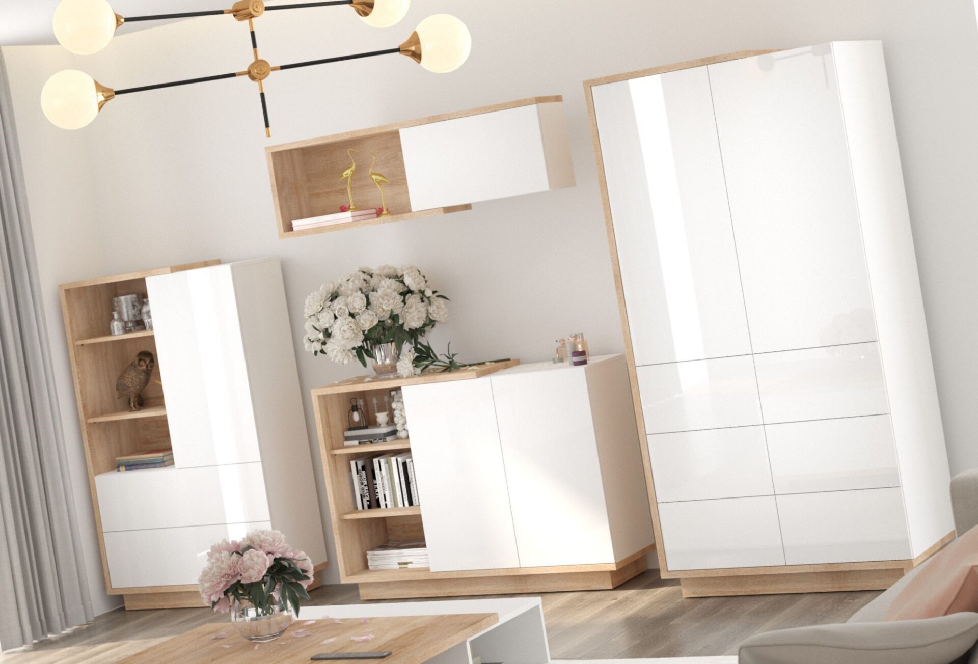 The set includes: BRITA 05 2-door chest of drawers 120/89/40 – 48 kg – 2p; BRITA 17 1-door shelving unit 2S 90/147/40 – 65 kg – 2p; BRITA 23 2-door wardrobe 90/191/60 – 91 kg – 3p; BRITA 24 1-door wall cabinet 120/38/25 – 17 kg – 1p. The furniture is made of 16mm and 25mm thick chipboard with ABS edging. The drawers and doors have push-to-open opening. The pedestal is 8.5 cm high. Colors: Sonoma oak / white / glossy white