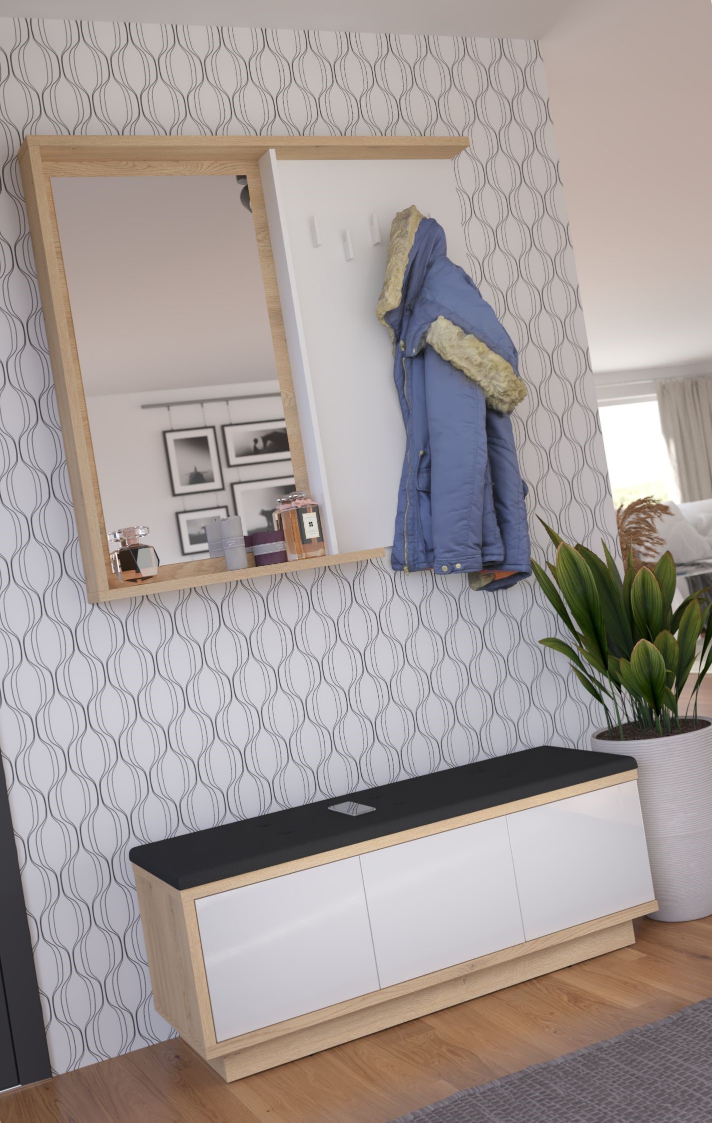 BRITA #5 prieškambario baldai su veidrodžiu, spintelė su sėdyne, ąžuolas „Cremona“, balta