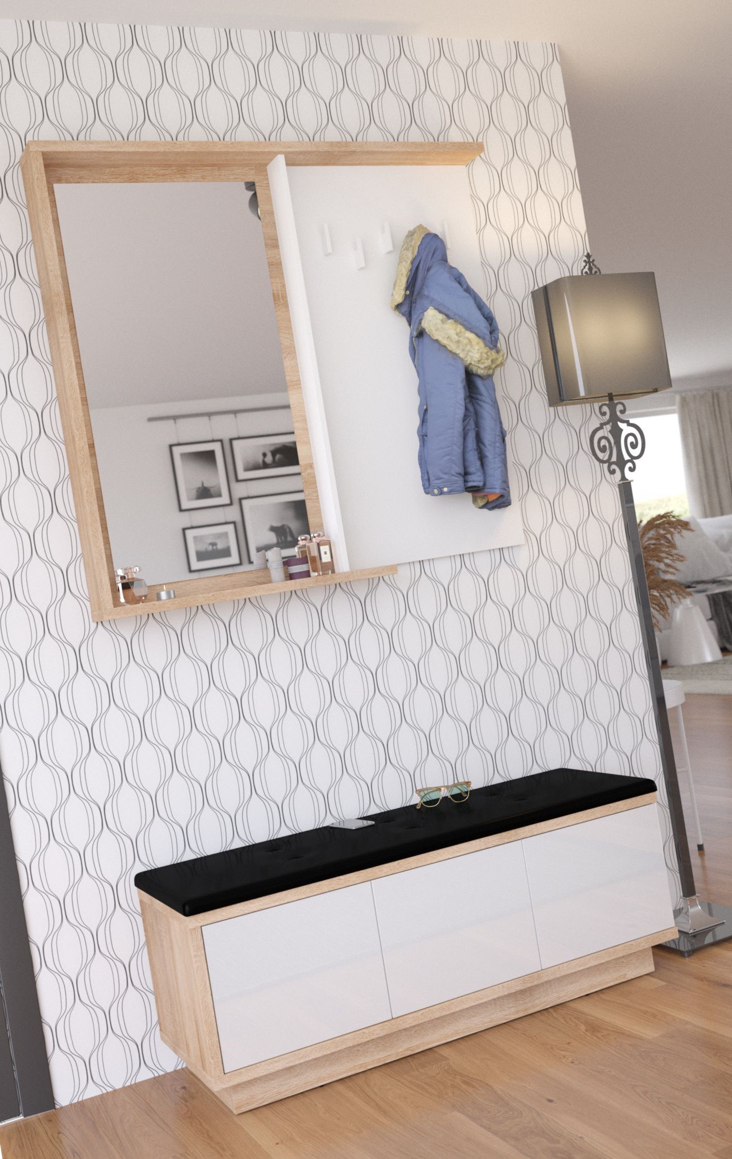 BRITA baldai #5 prieškambaris su veidrodžiu, spintelė su sėdyne, Sonoma ąžuolas, balta