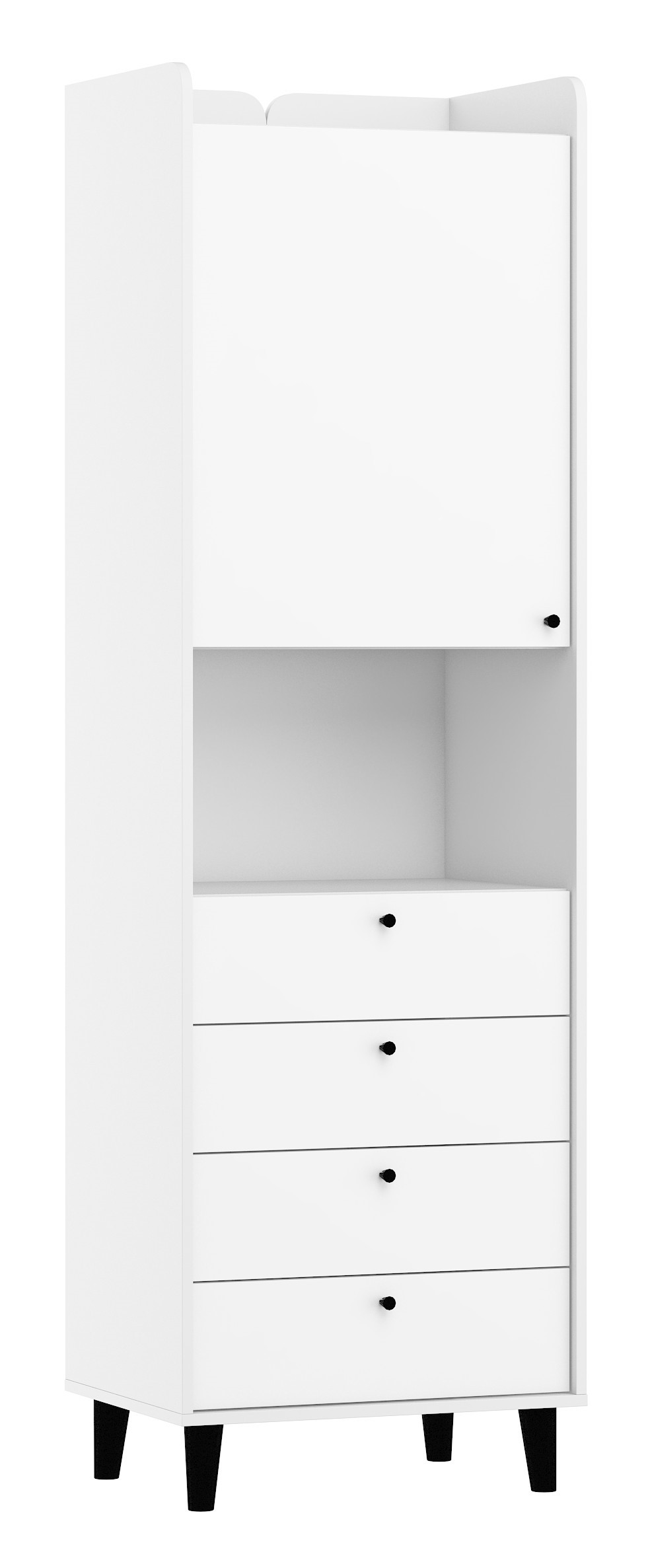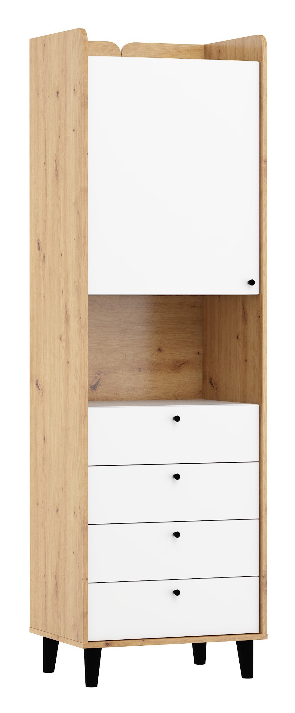 The furniture is constructed of 16mm and 22mm thick chipboard with ABS edging. The drawers and doors feature a soft-close mechanism. The wooden legs in various heights are 12 cm, 30 cm, and 62 cm.