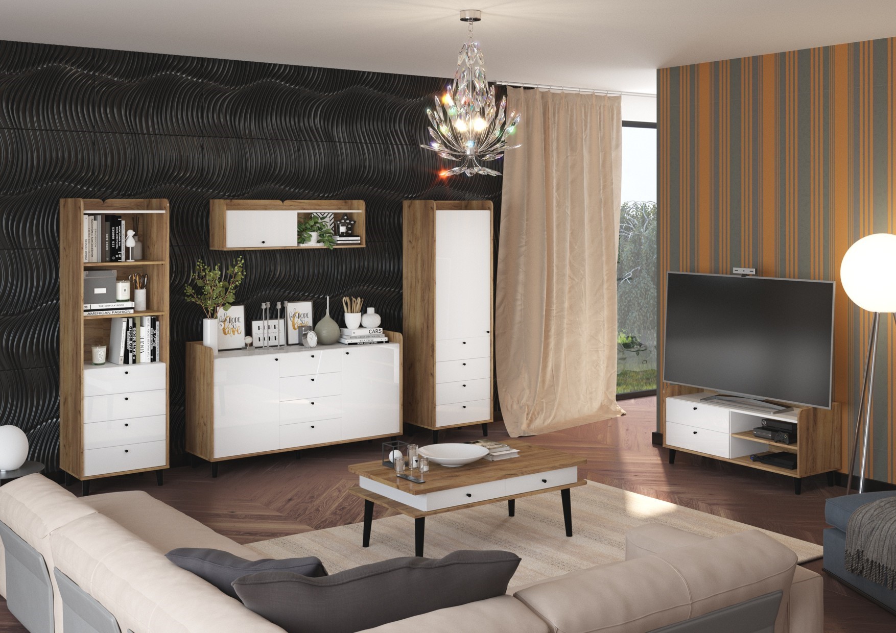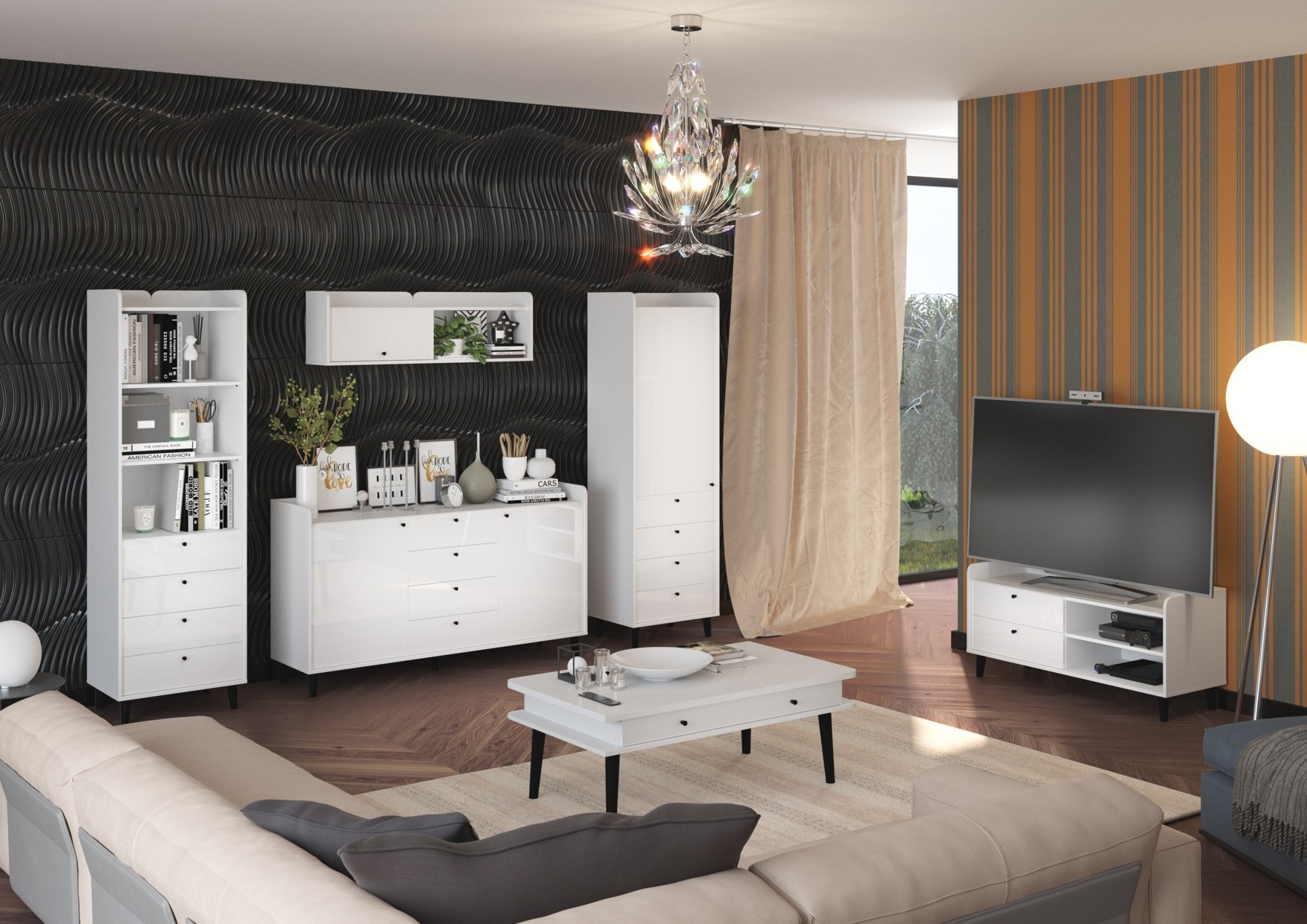 The furniture is made of 16mm and 22mm thick chipboard with ABS edging. The drawers and doors have a soft-close system. The wooden legs in the various elements are 12 cm, 30 cm, and 62 cm high.
