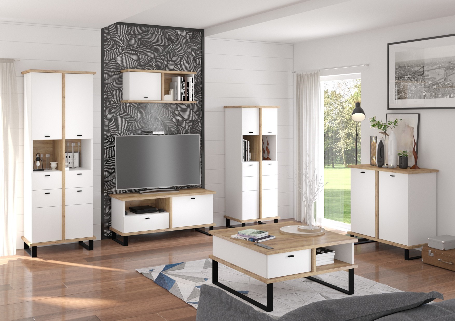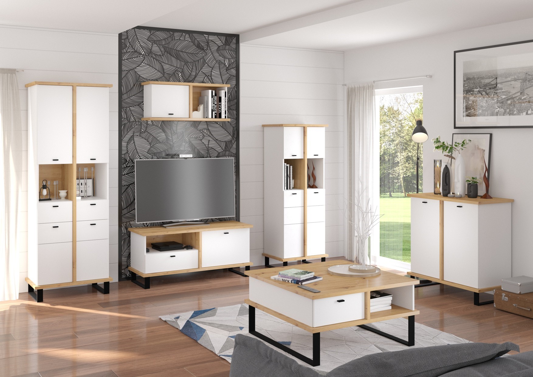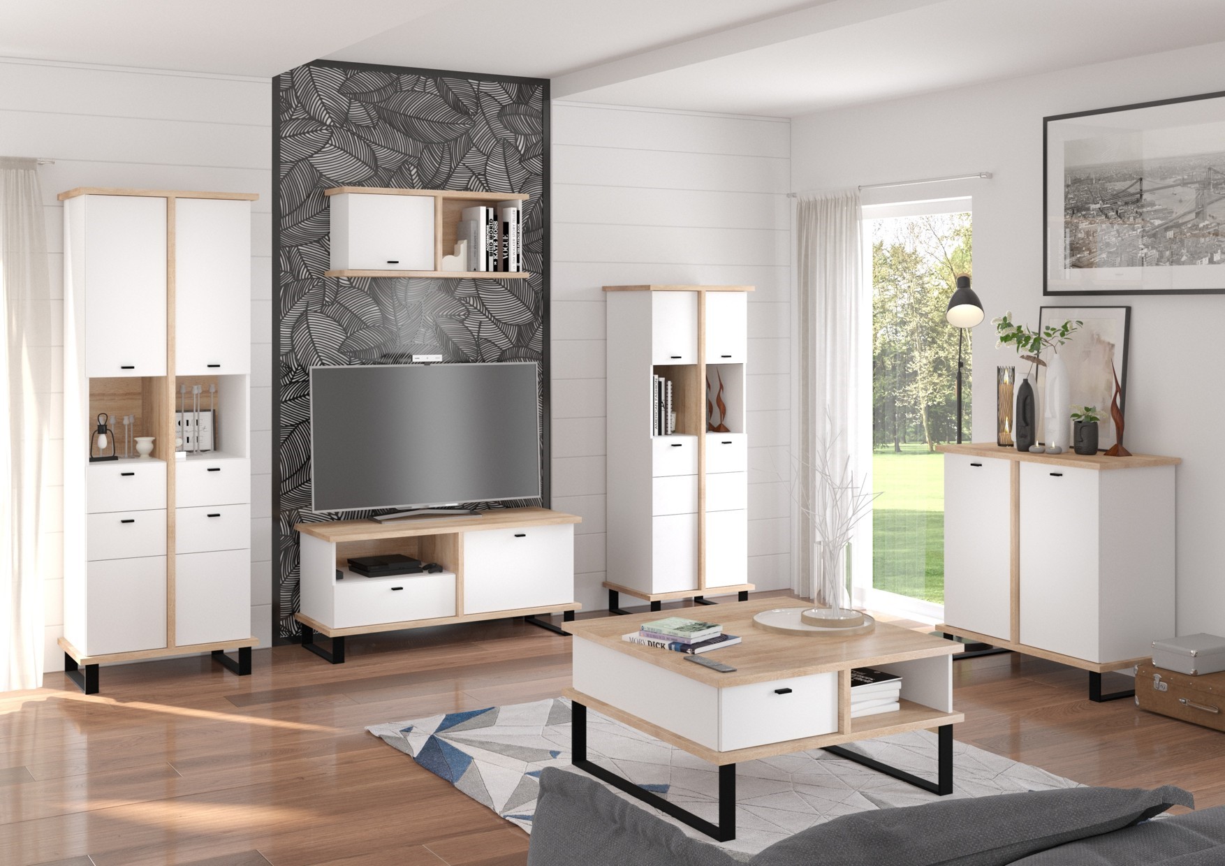 The furniture is made of 16mm and 25mm thick chipboard with ABS edging. The drawers and doors have a soft-close system. The metal legs in various heights are 12 cm, 22 cm, and 73 cm.