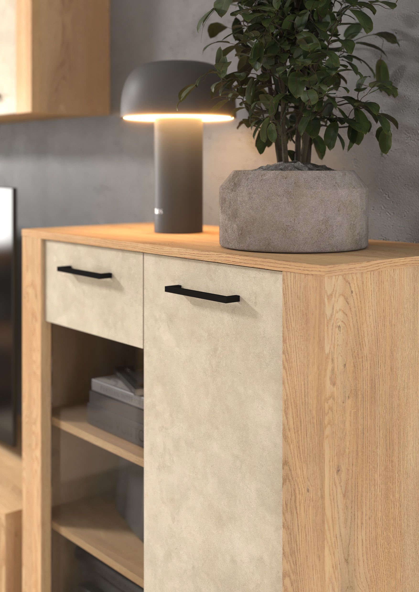 DELIS 04 baldų komoda su durelėmis svetainei, miegamajam, ąžuolo spalvos, kremonos pilka, m