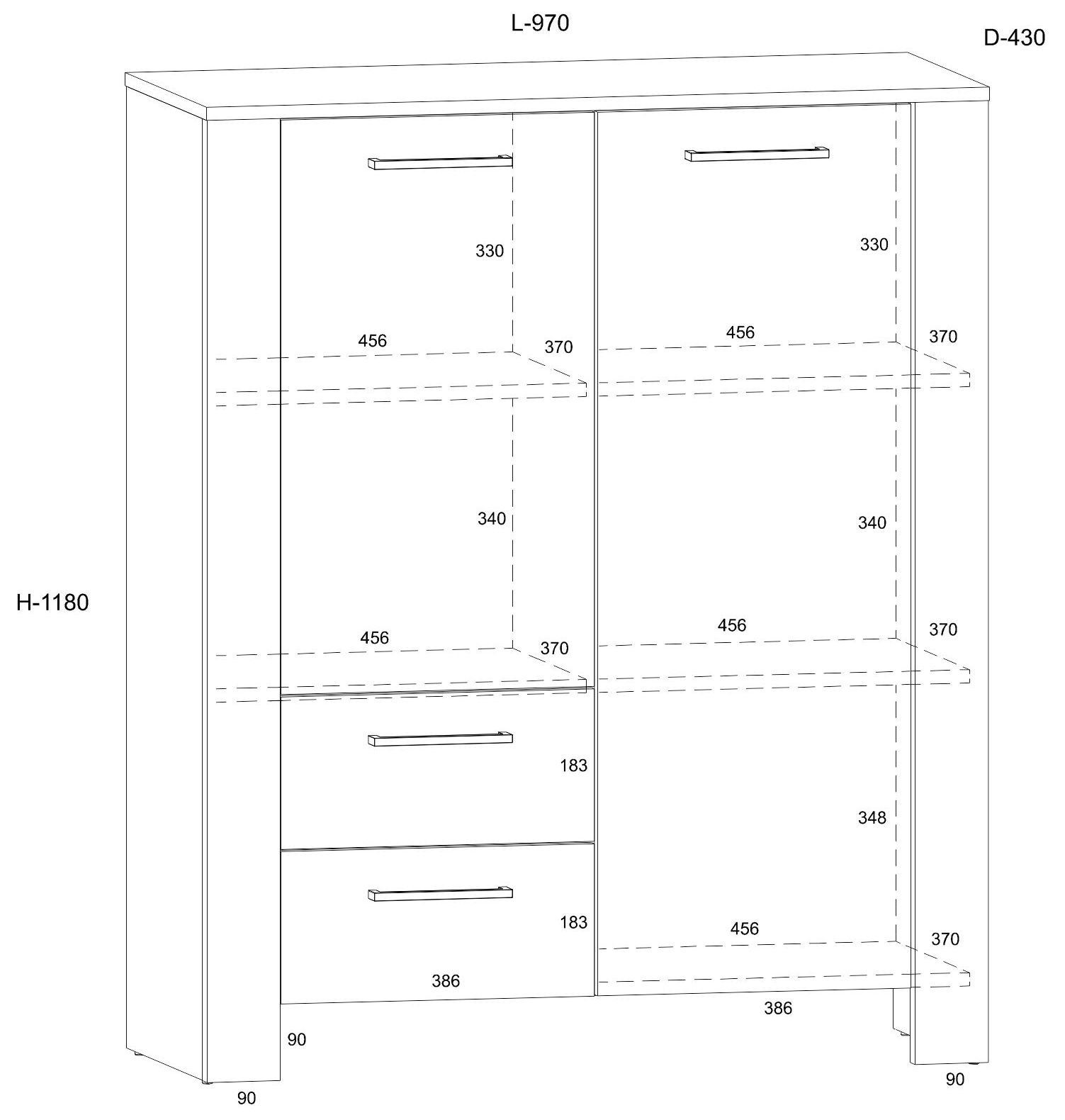 DELIS 08 bookcase with doors and drawers for the living room. 16 mm and 25 mm board, ABS edge, soft-close, FULL OPEN guides. Color: Cremona Oak / Granada Almond.