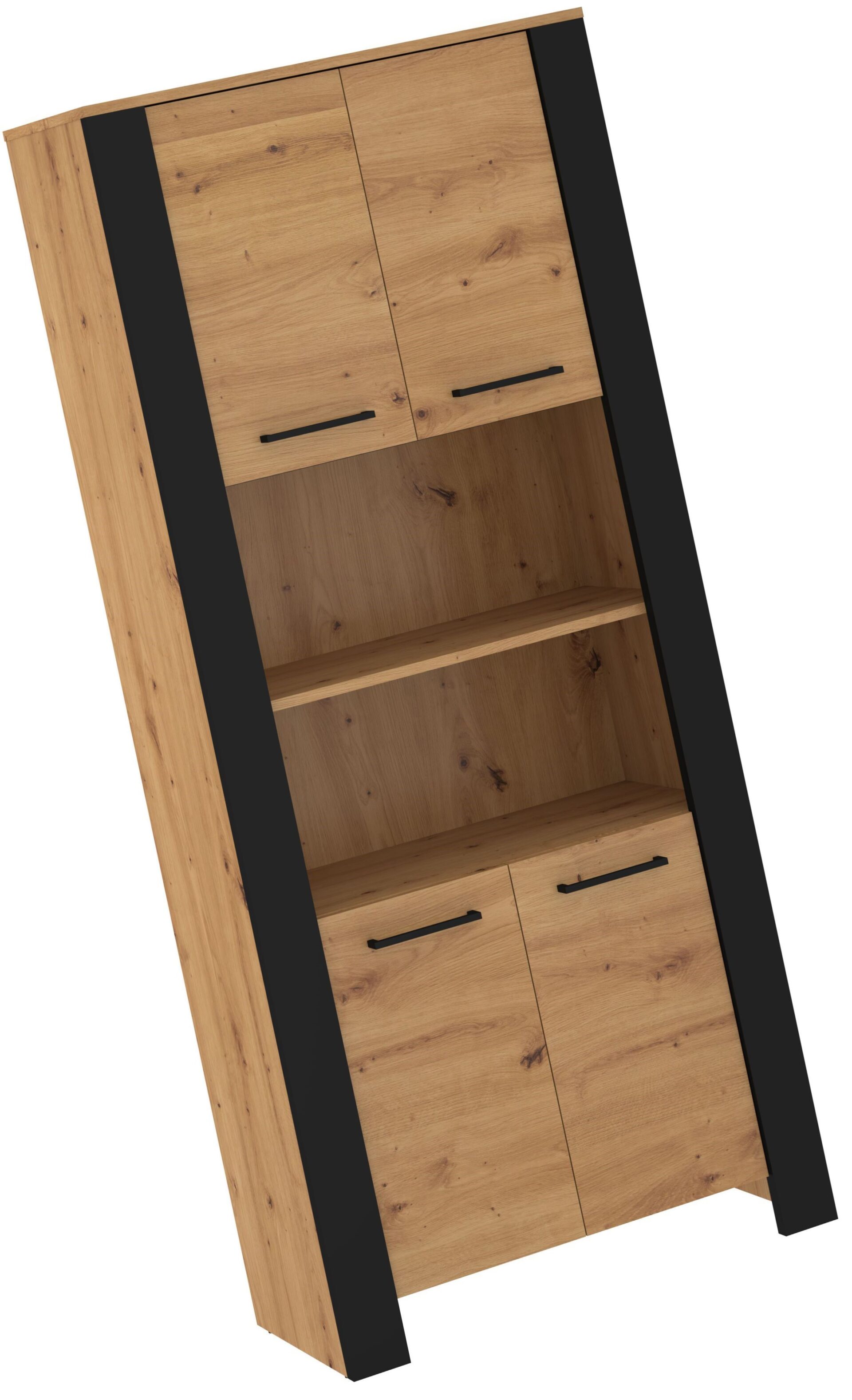 DELIS 09 tall bookcase with doors and shelves for the living room. 16 mm and 25 mm board, ABS edge, soft-close. Color: artisan oak / black.