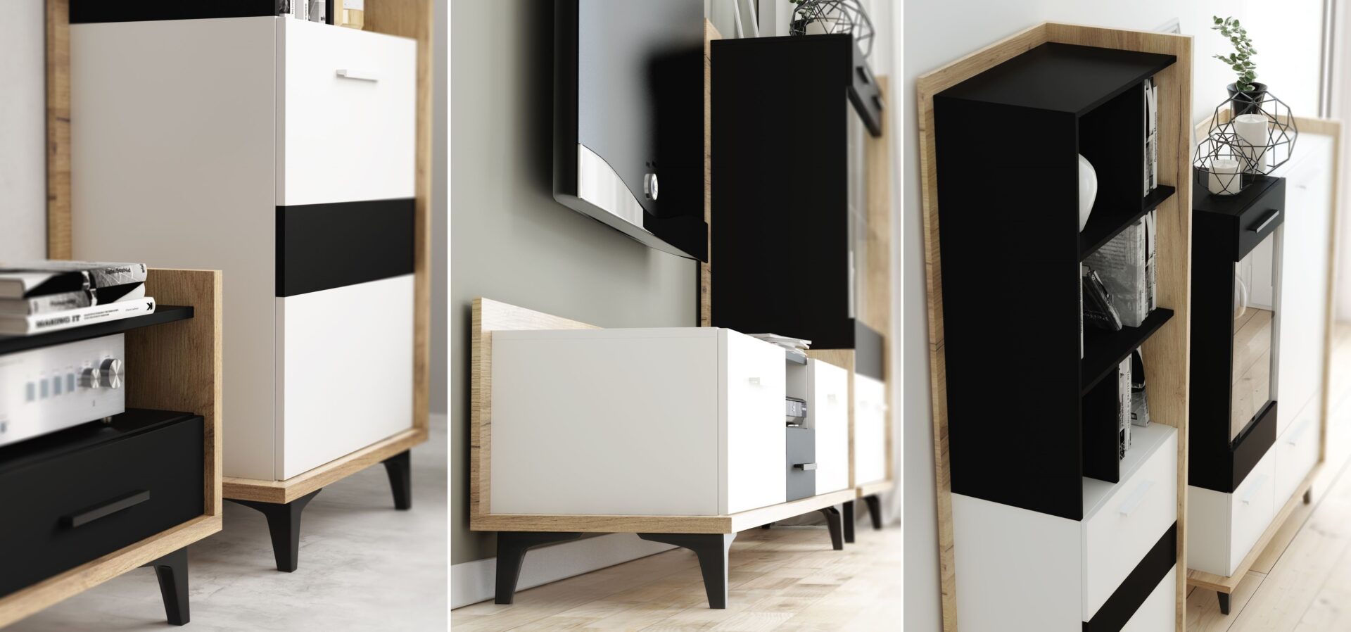The set includes: DOX 06 furniture, 65/195/42 shelf – 51.5 kg – 3 pieces, DOX 07 furniture, 65/195/42 shelf – 52.5 kg – 3 pieces, DOX 08 furniture, 125/49/42 TV stand – 28.5 kg – 2 pieces, DOX 04 furniture, 95/37/27 hanging shelf – 14 kg – 1 piece. Additional information about the DOX system: 16mm, 25mm laminated board, soft-close opening, ABS edge, 12cm ABS legs, Colors: gold craft oak / white / black