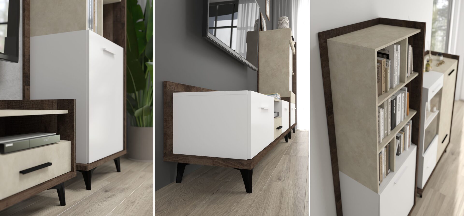 The set includes: DOX 06 furniture, 65/195/42 shelf – 51.5 kg – 3 pieces, DOX 07 furniture, 65/195/42 shelf – 52.5 kg – 3 pieces, DOX 08 furniture, 125/49/42 TV stand – 28.5 kg – 2 pieces, DOX 04 furniture, 95/37/27 hanging shelf – 14 kg – 1 piece. Additional information about the DOX system: 16mm, 25mm laminated board, soft-close opening, ABS edge, 12cm ABS legs, Colors: Grange Oak / White / Granada Almond