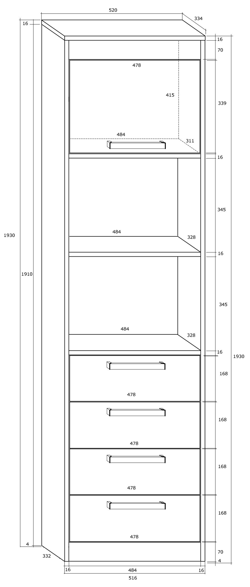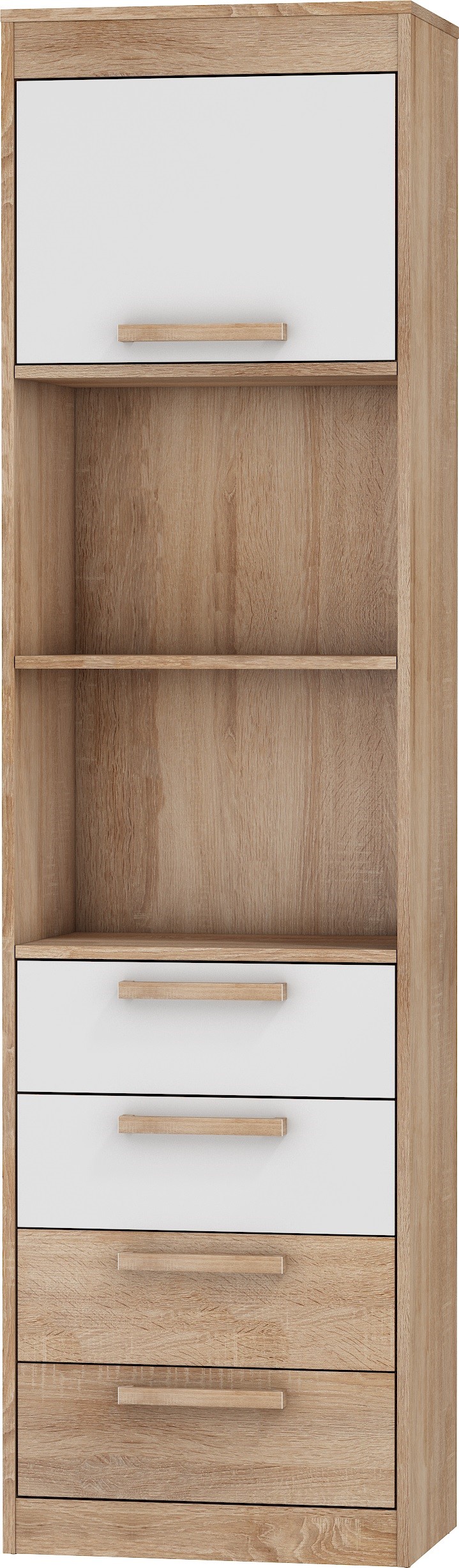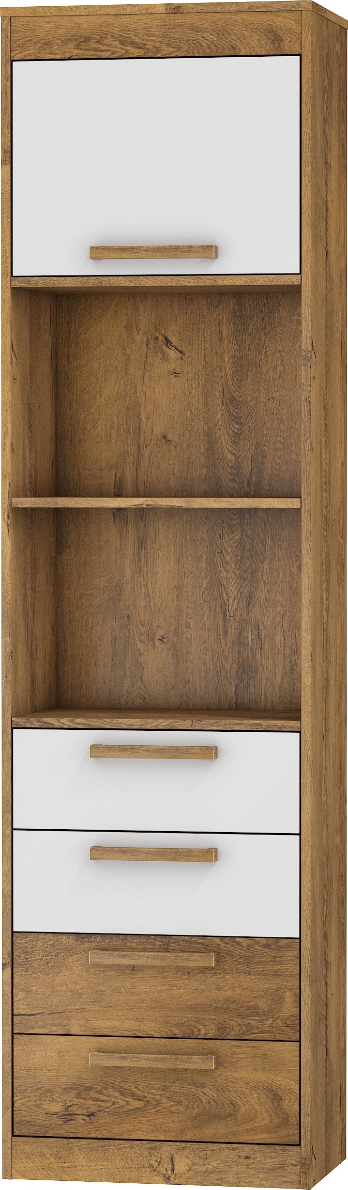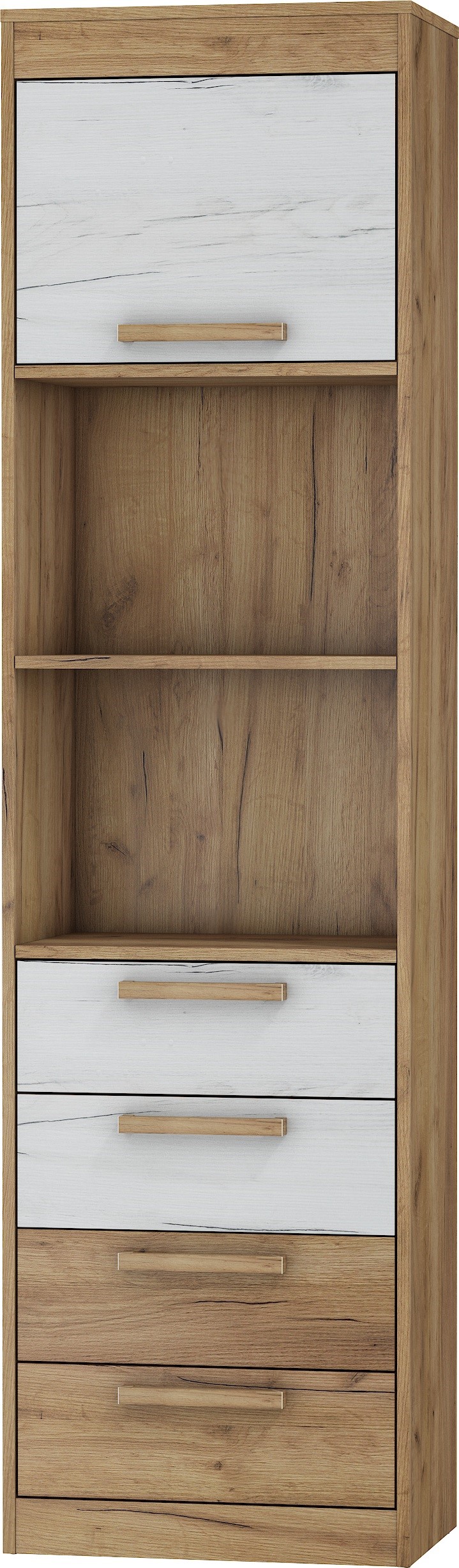 The furniture is constructed of 16mm and 25mm thick chipboard with ABS edging. The drawers and doors feature a soft-close system. Available colors: Artisan Oak / Gloss White, Light Sonoma Oak / Gloss White, Burgundy Oak / Gloss White, Gold Craft Oak / White Craft Oak