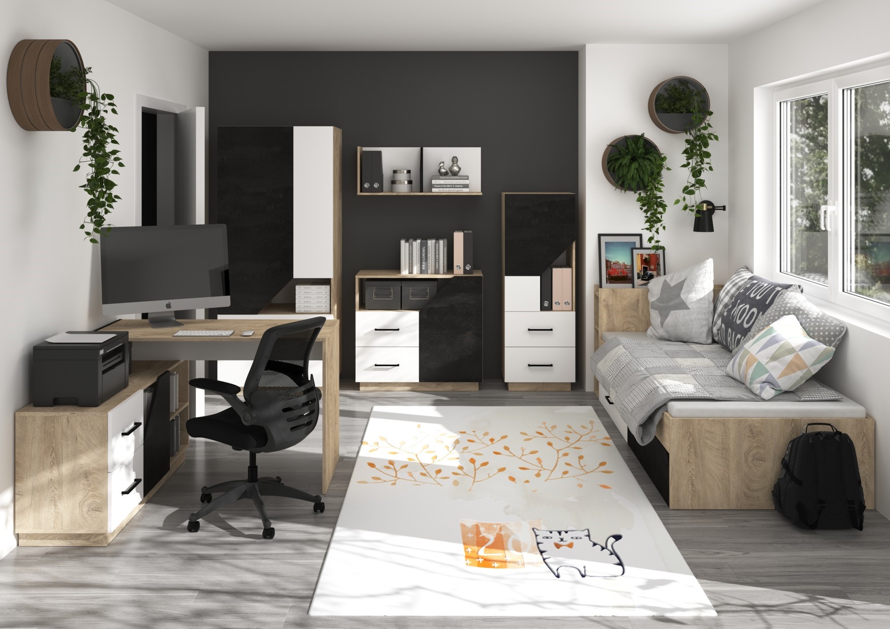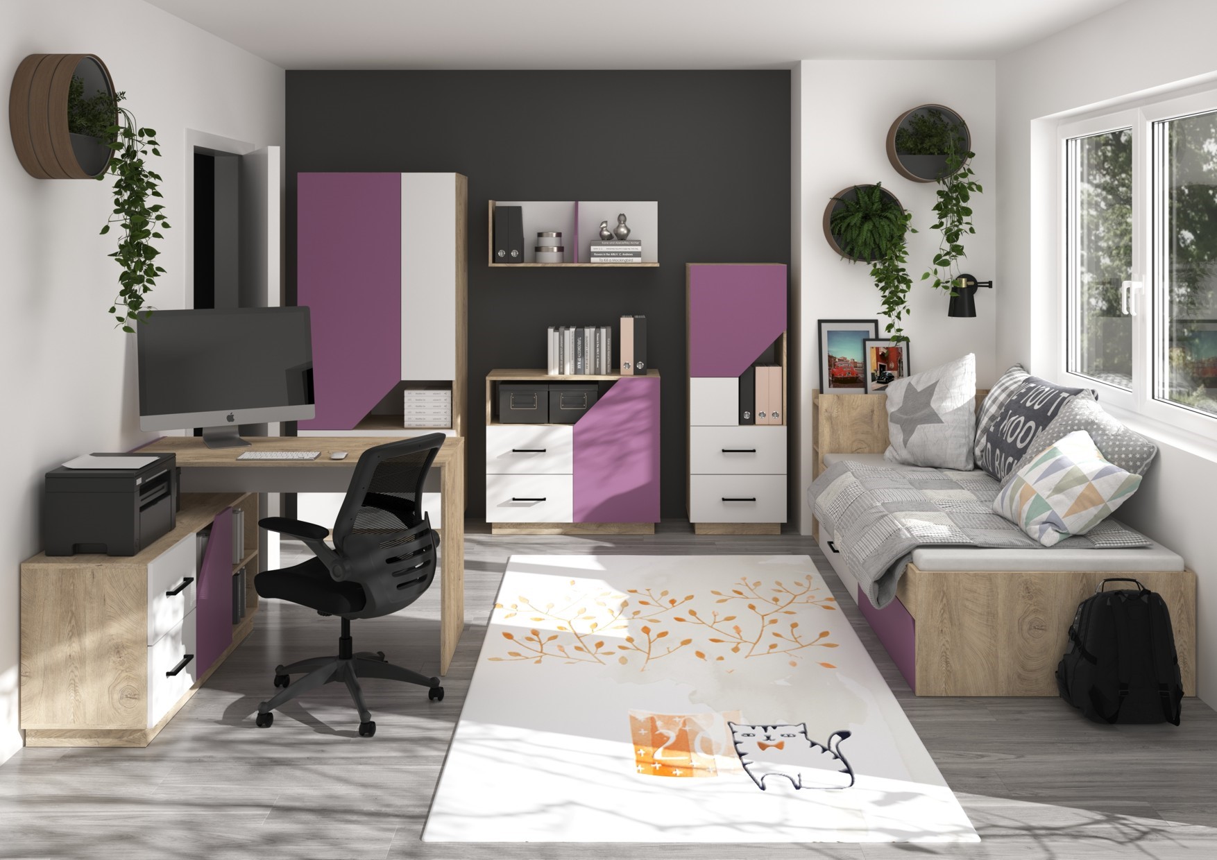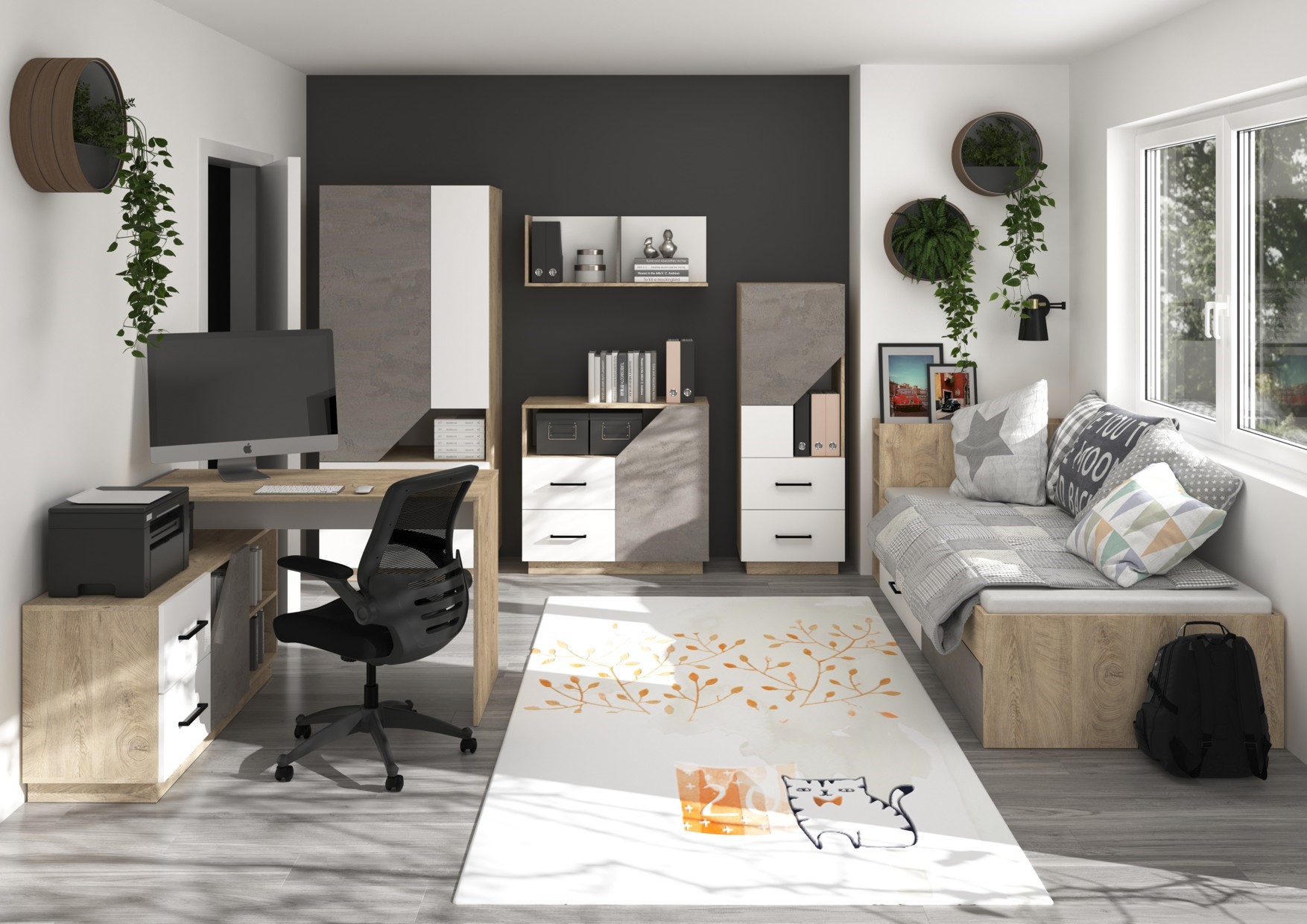 The set includes: EPA 02 Corner Gaming Desk [120/76/120] EPA 04 Chest of Drawers [90/82/43] EPA 07 Youth Bed Without Mattress [224/76/97] EPA 09 Hanging Shelf [90/35/25] EPA 12 Toy Bookcase [50/140/43] EPA 22 Wardrobe 80 [80/187/57]