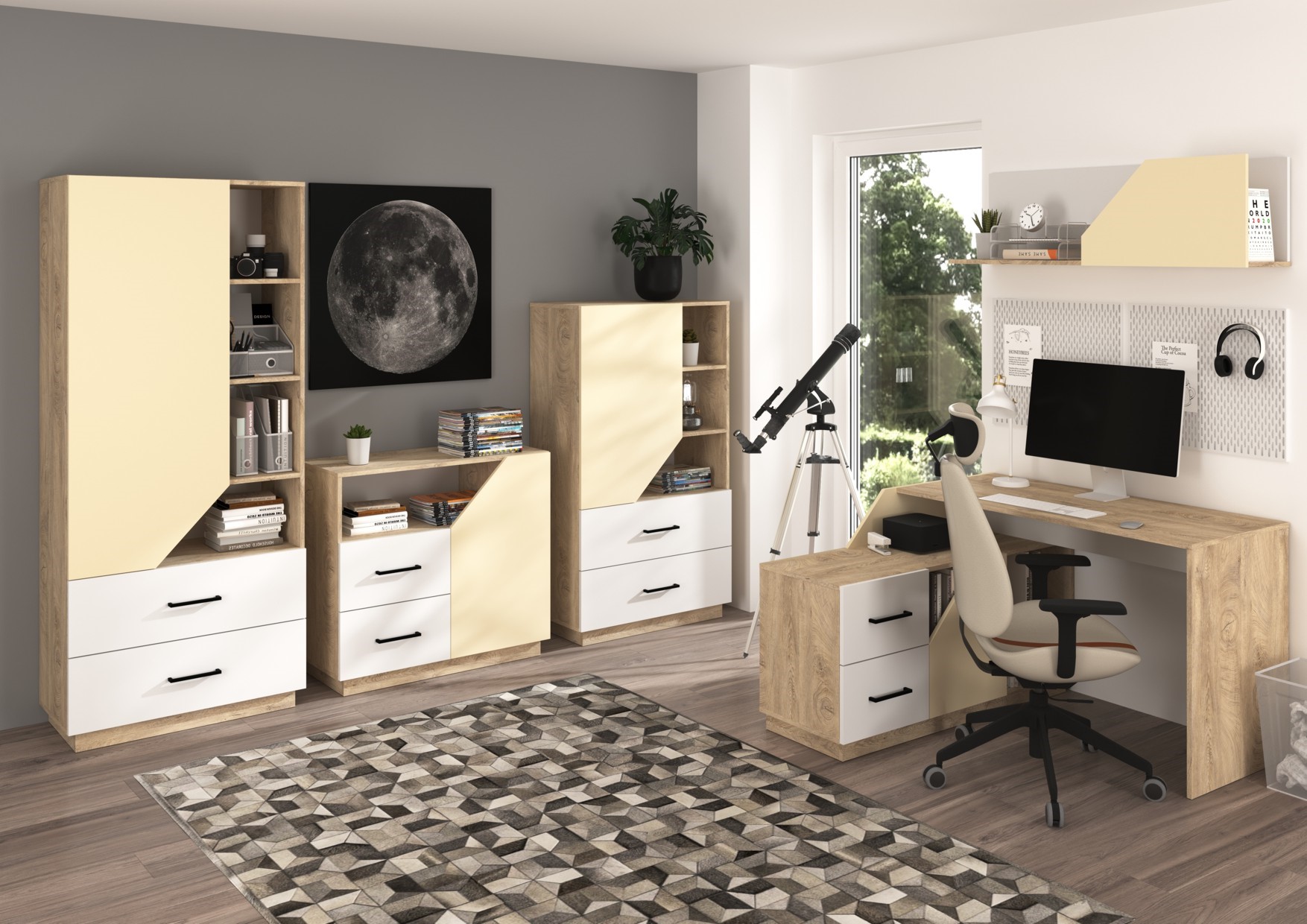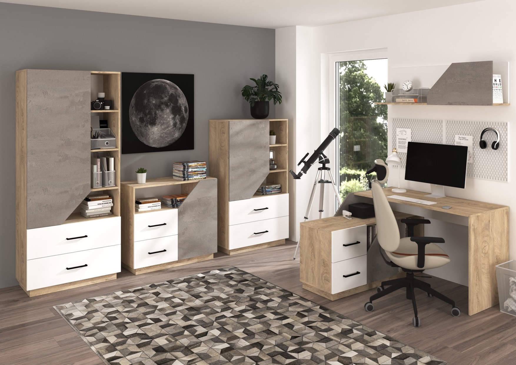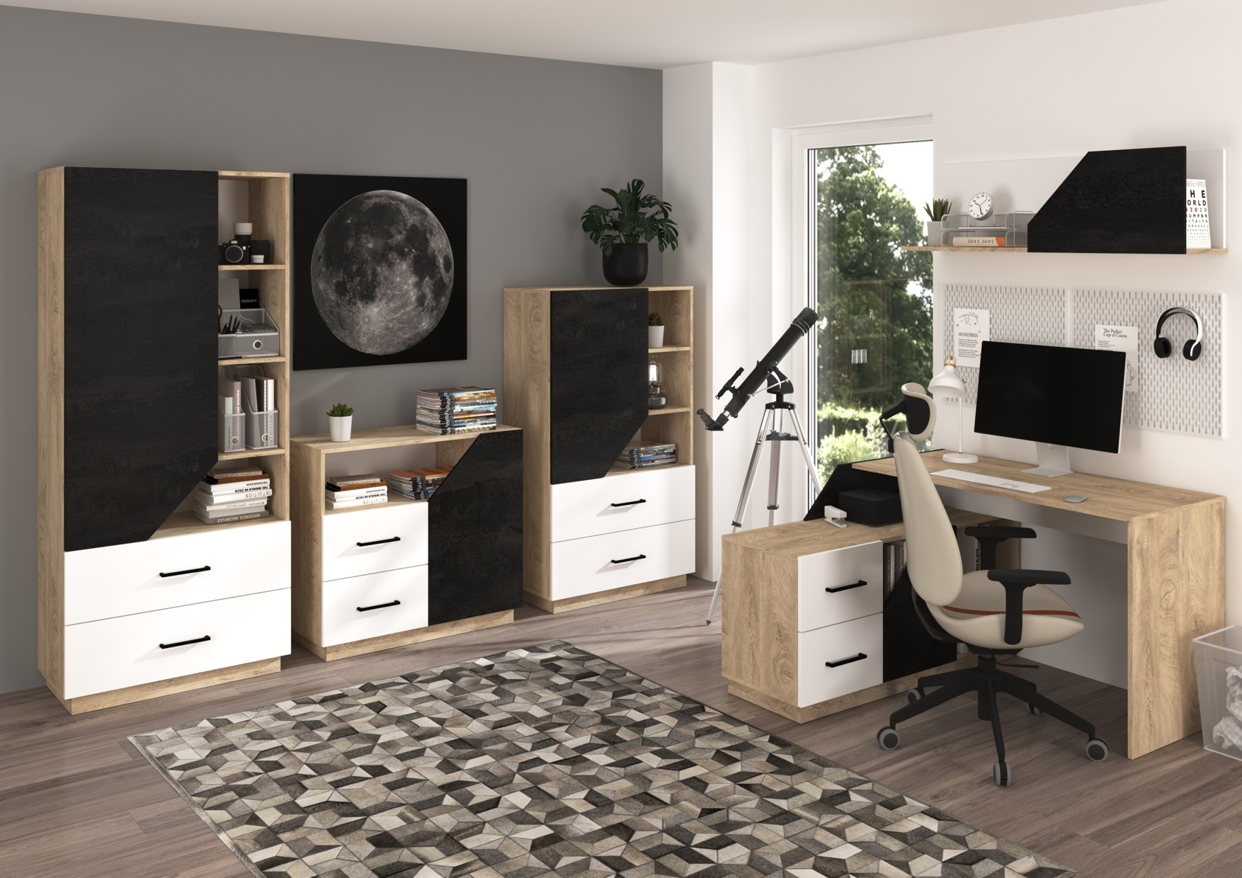 The set includes: EPA 02 Corner Gaming Desk [120/76/120] EPA 04 Chest of Drawers [90/82/43] EPA 10 Wall Shelf [120/35/27] EPA 13 Toy Bookcase [80/140/43] EPA 19 Toy Bookcase [80/187/43]