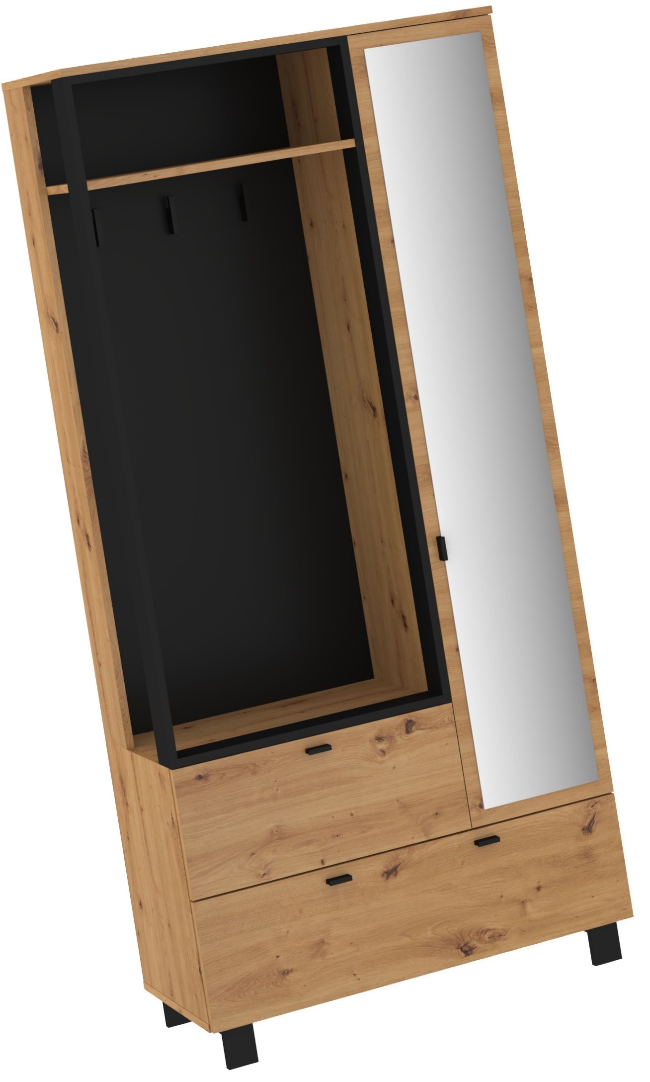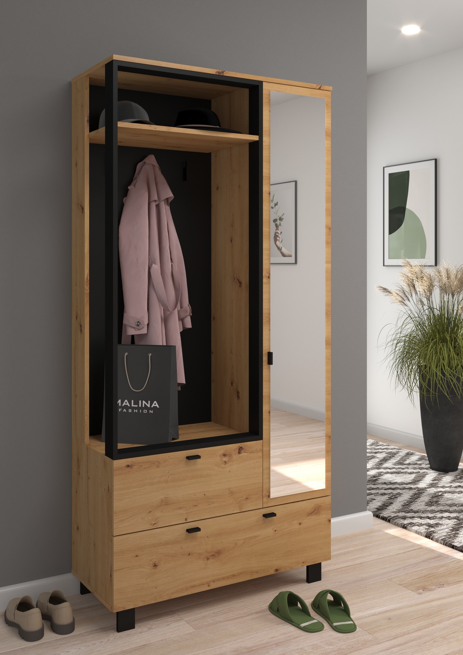 GAVES 05 baldų prieškambario spinta su veidrodžiu, palėpėje, artisan ąžuolas, juodas