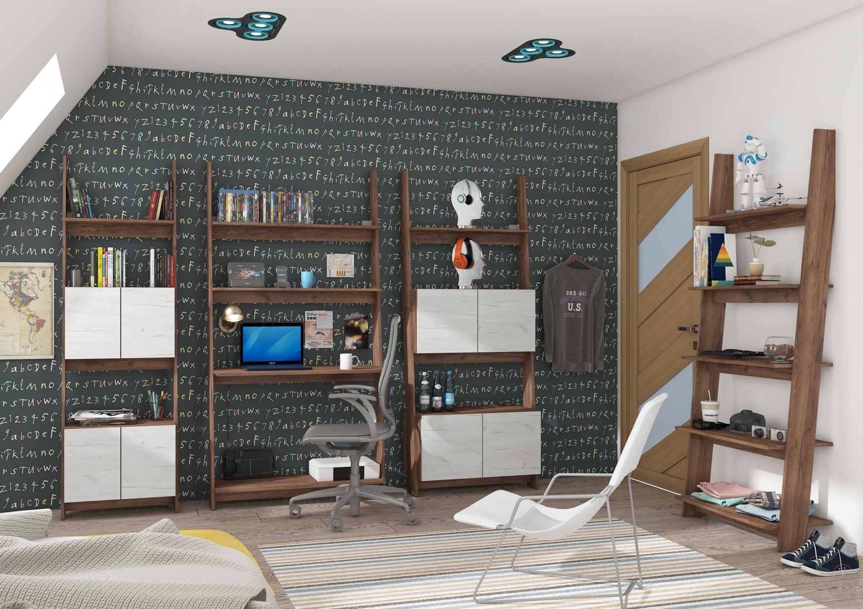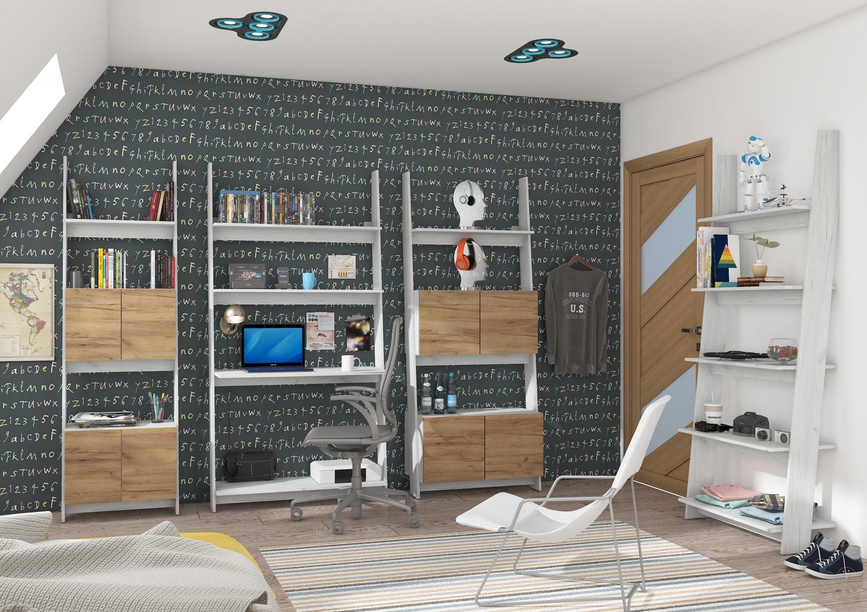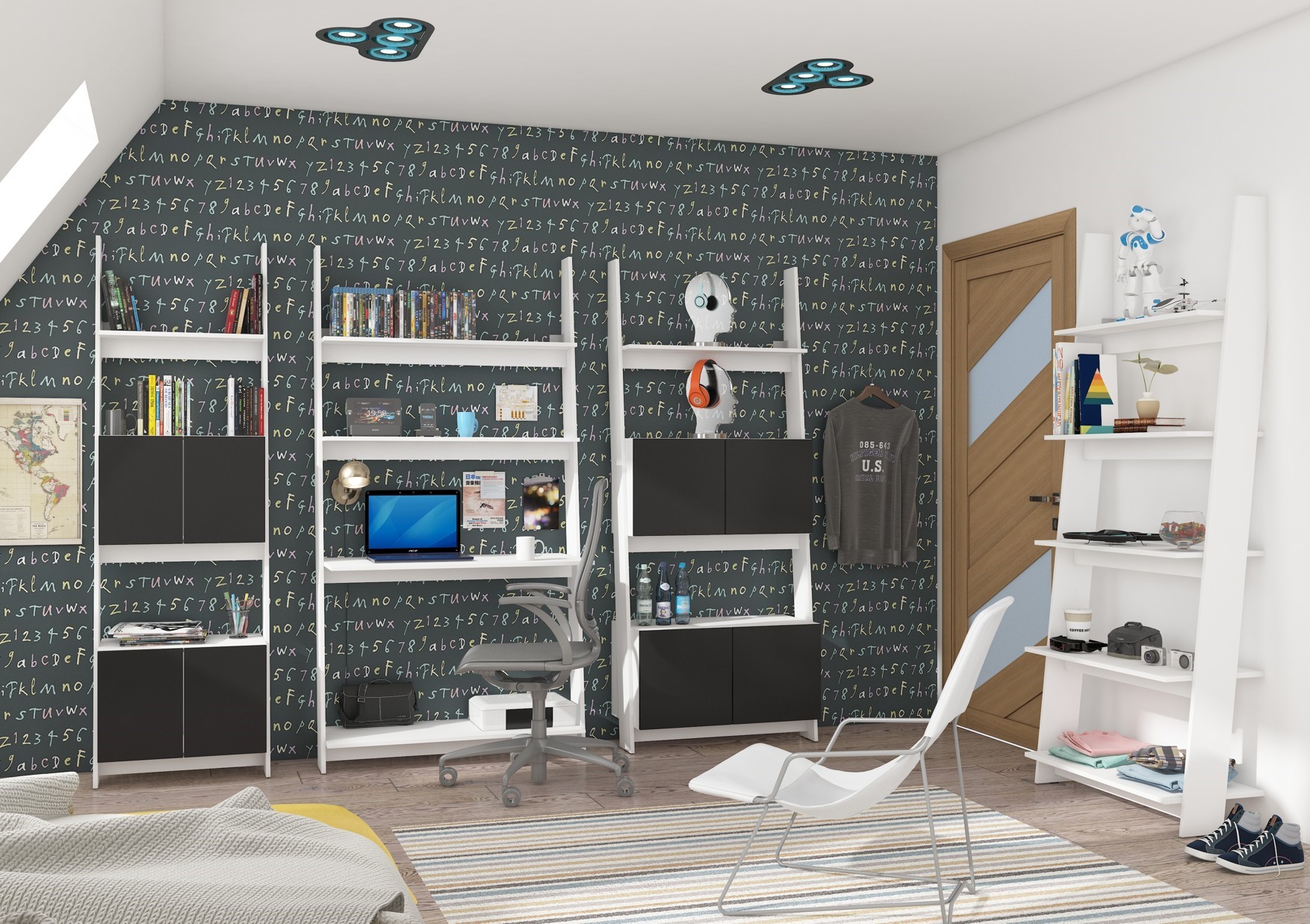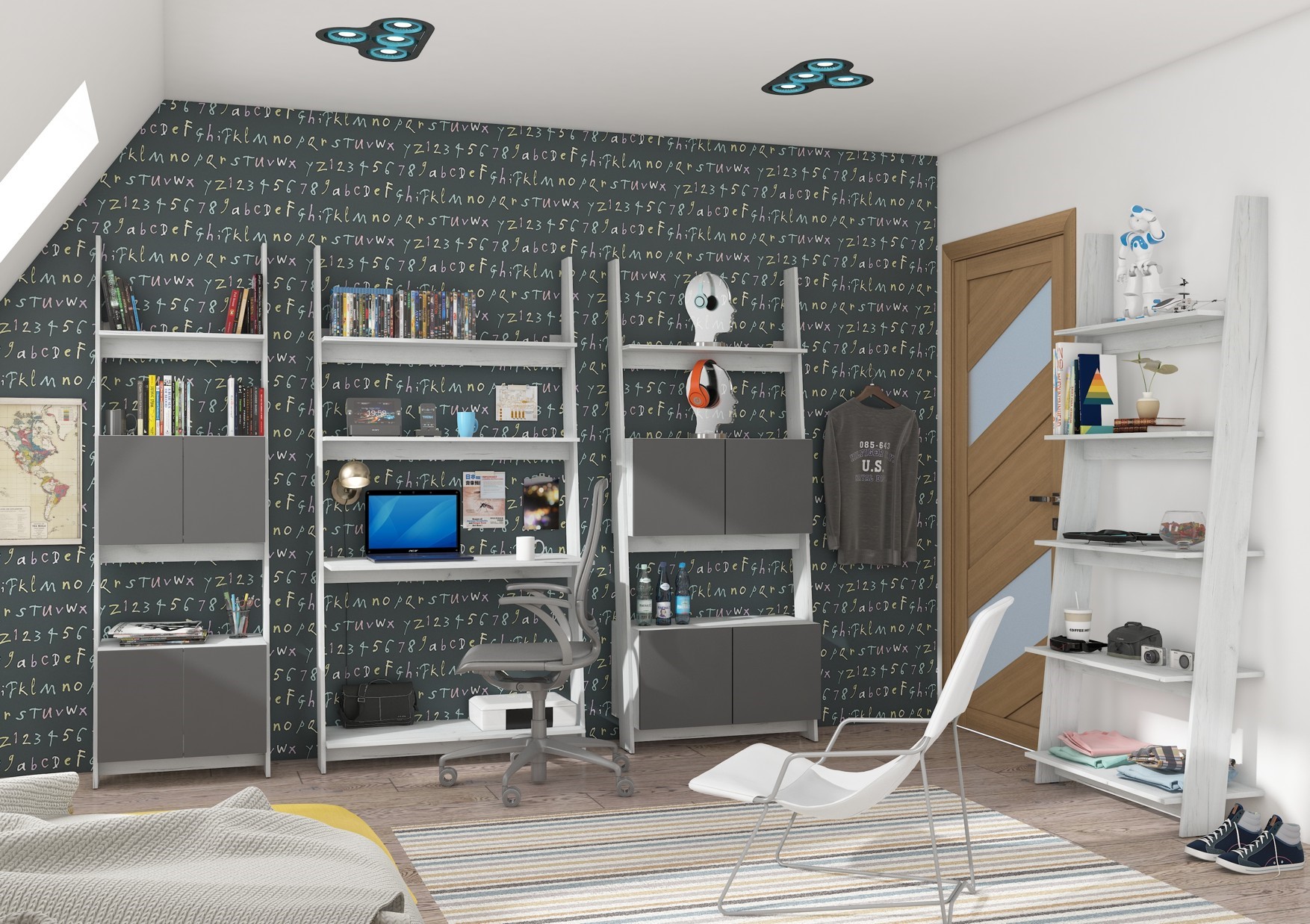 The set includes: KERK 05 60-unit 2-door bookcase [60/196/39], KERK 01 desk [100/196/50], KERK 08 80-unit 2-door bookcase [80/196/39], KERK 06 80-unit bookcase [80/196/37]