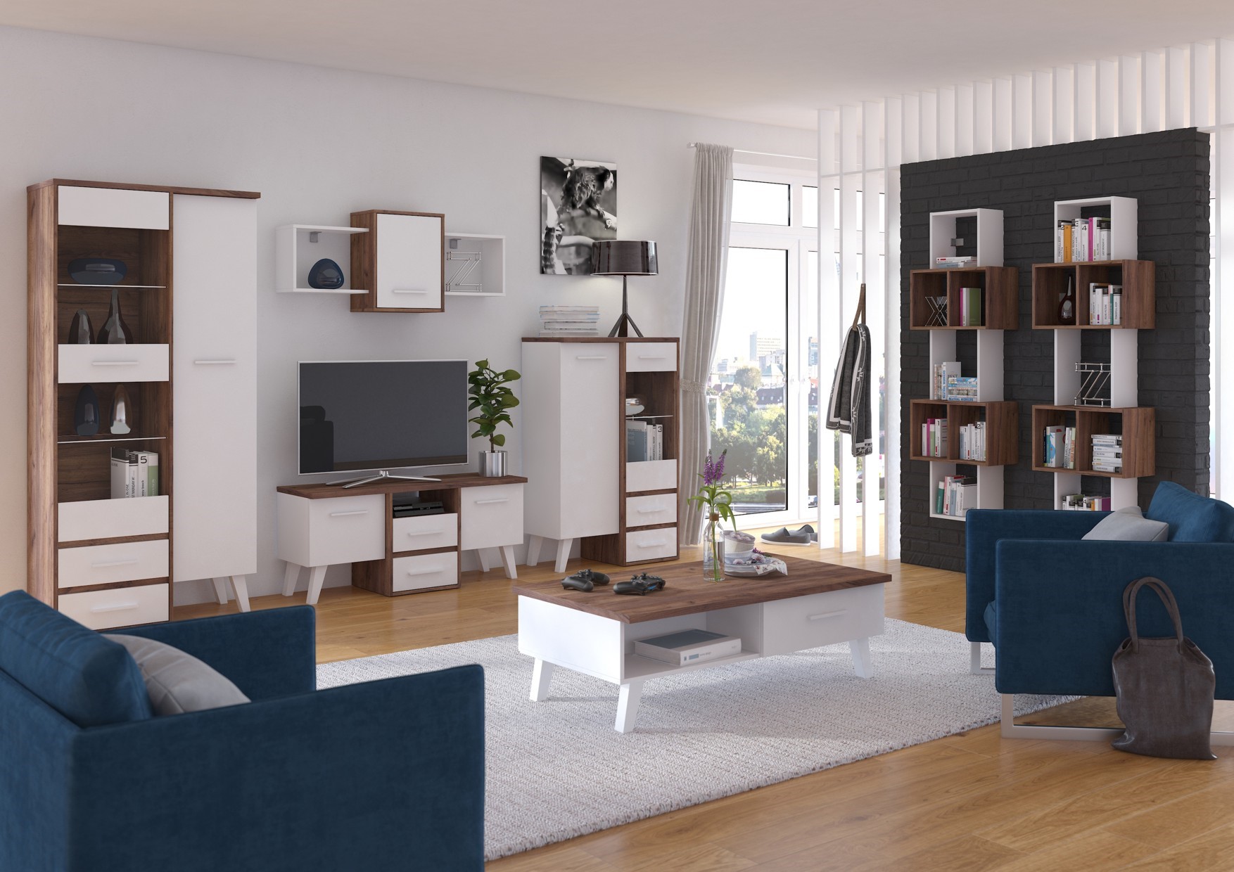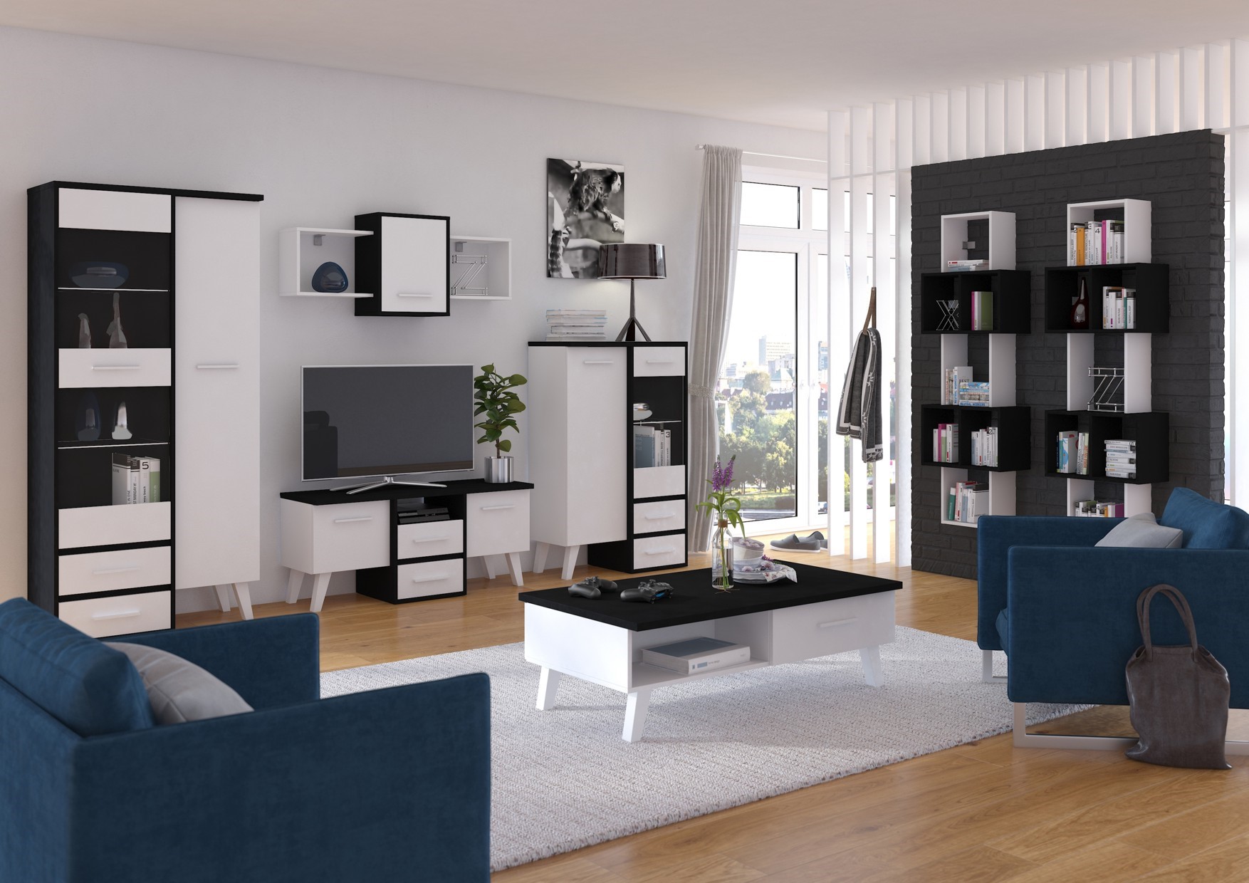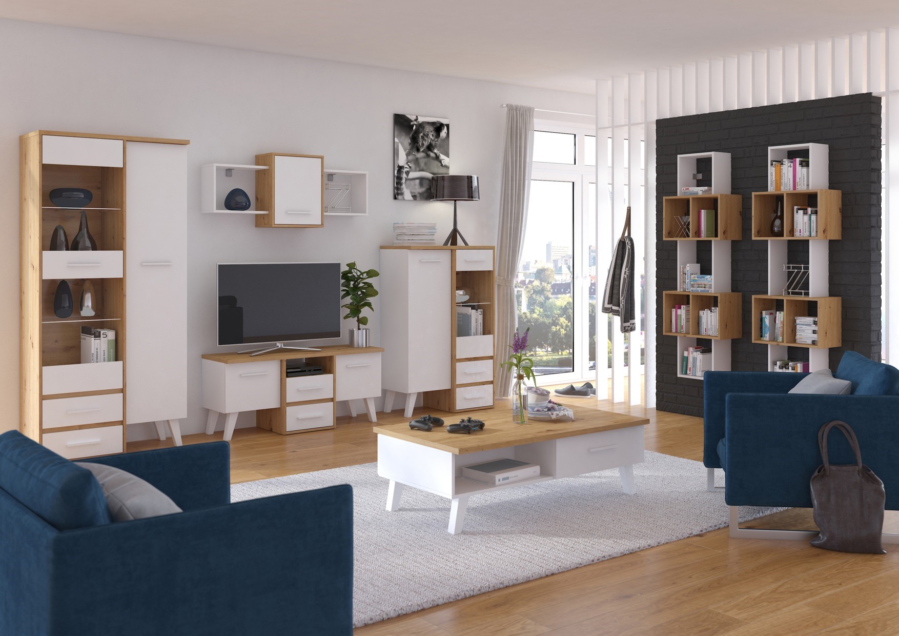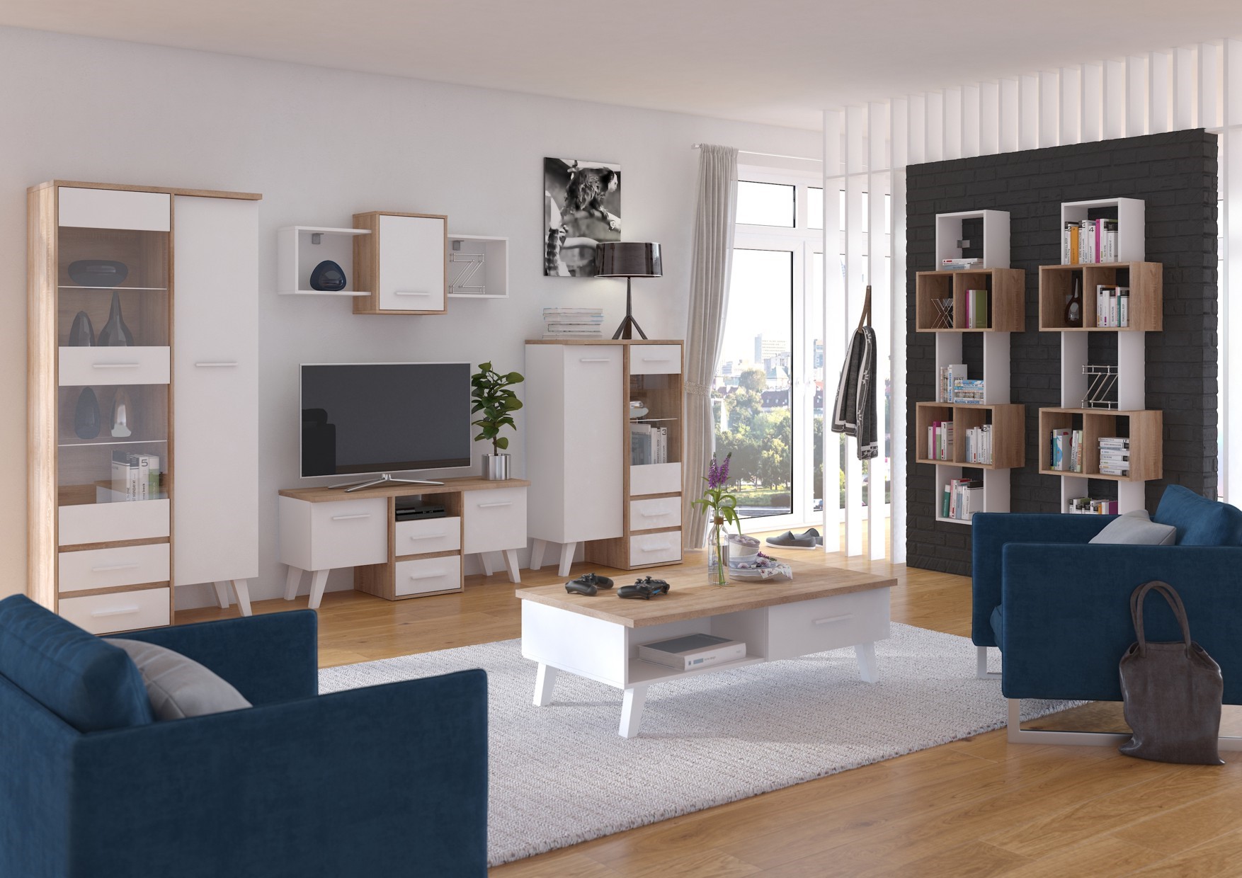 The furniture is made of 16mm and 25mm thick chipboard with ABS edging. The drawers and doors have a soft-close mechanism. Wooden legs, height: 18cm. System color options: Light Sonoma Oak / White, Artisan Oak / White, Gold Craft Oak / White, Tobaco Craft Oak / White, Dark Sonoma Oak / White, Black / White