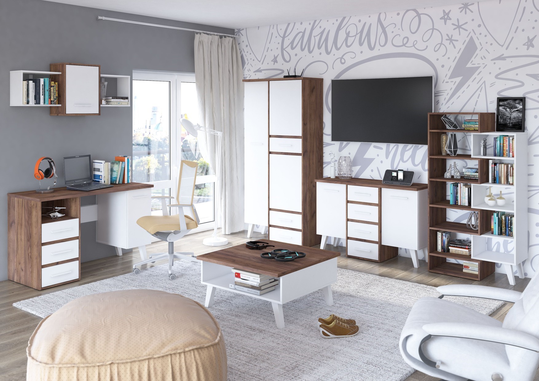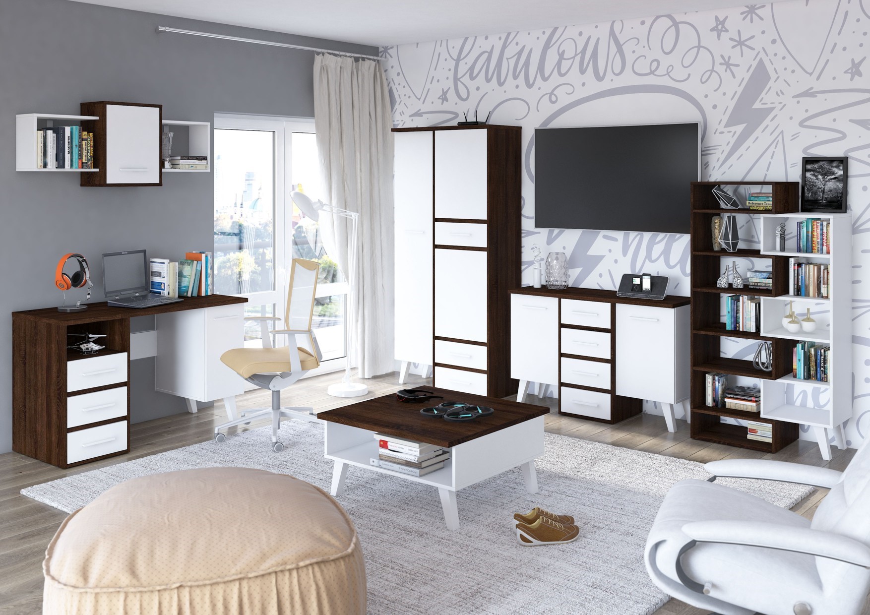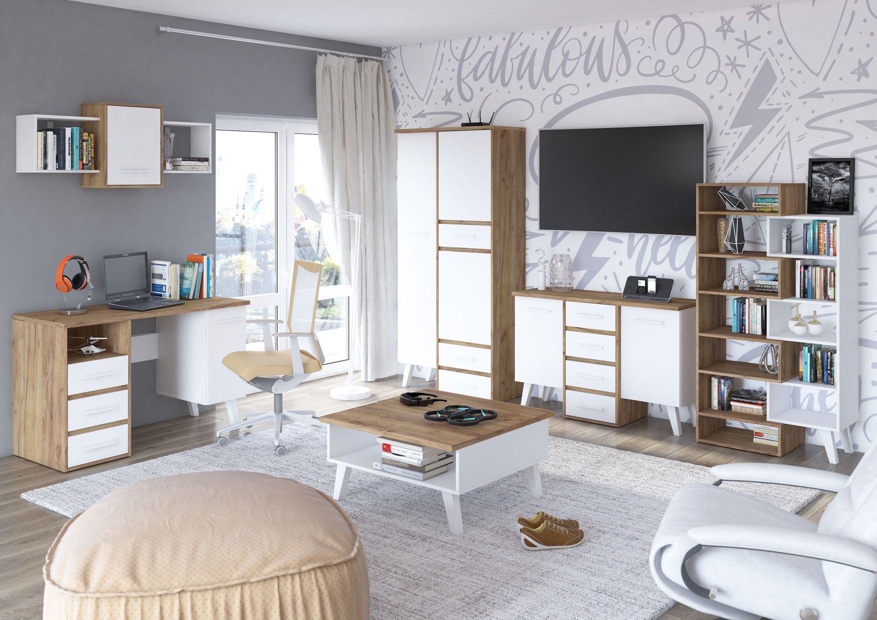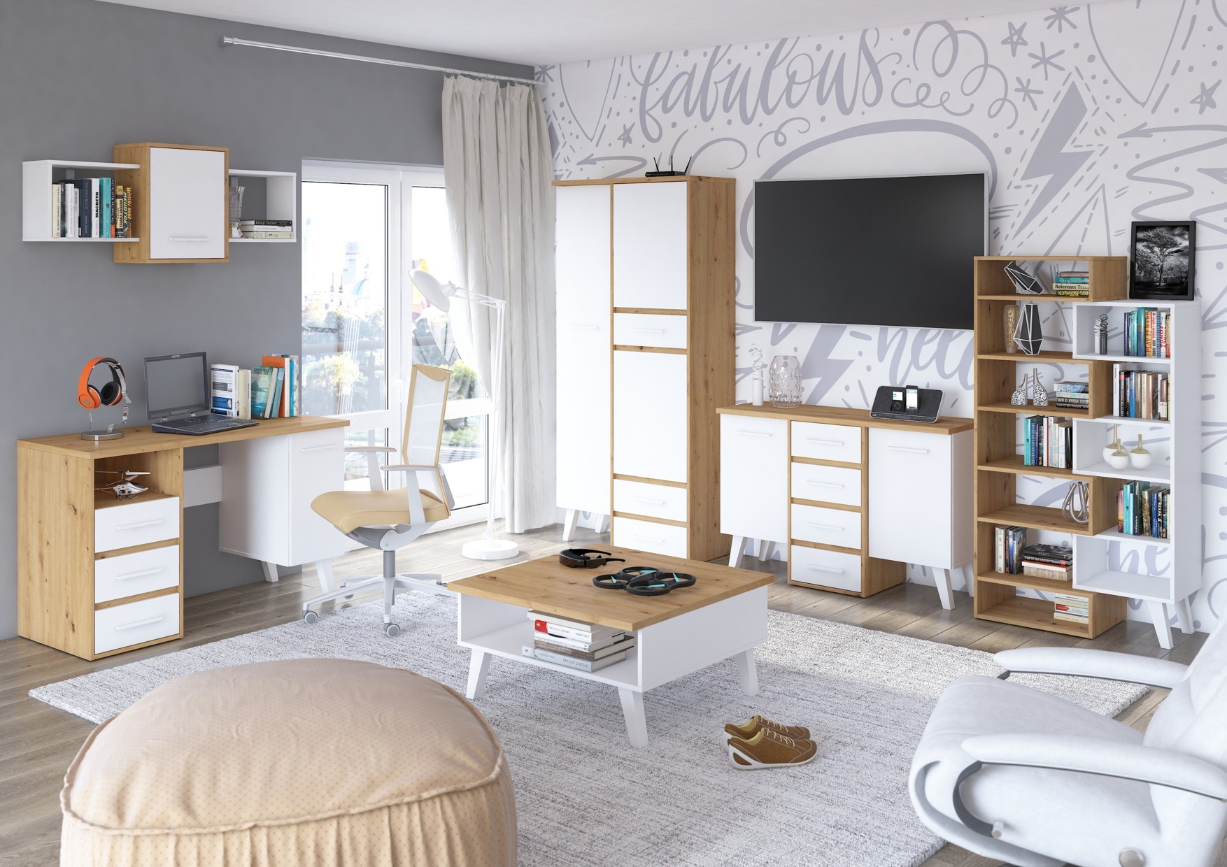 The furniture is made of 16mm and 25mm thick chipboard with ABS edging. The drawers and doors have a soft-close mechanism. Wooden legs, height: 18cm. System color options: Light Sonoma Oak / White, Artisan Oak / White, Gold Craft Oak / White, Tobaco Craft Oak / White, Dark Sonoma Oak / White, Black / White