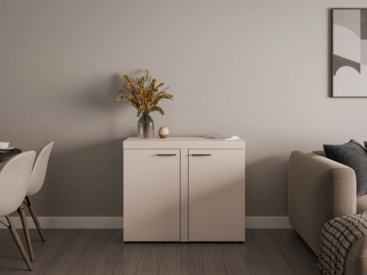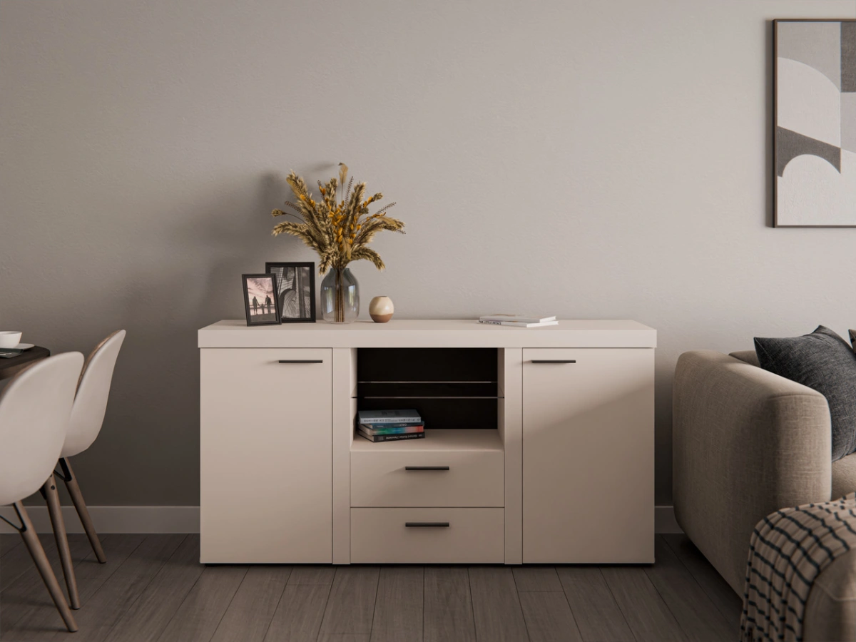 The wall unit is available in sand beige fronts and frames. It includes a large display cabinet, a small display cabinet, a TV stand, and a shelf.
