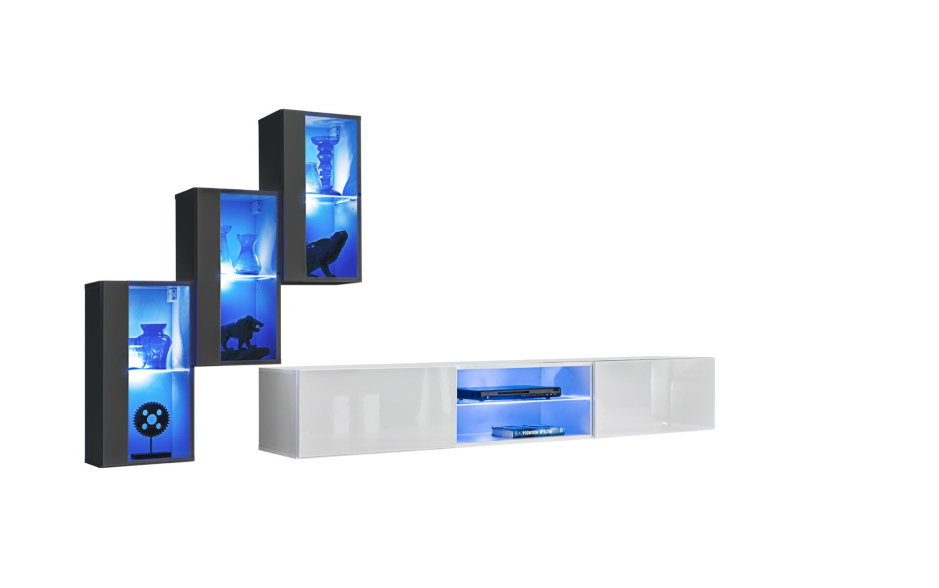 3x Wall-hung display cabinets: partially glazed doors, with a single glass shelf illuminated by blue LED lighting. TV/radio cabinet: central compartment with a glass shelf illuminated by blue LED lighting, flaps on the sides supported by gas struts, with a single compartment behind each. The fronts open with a push-click mechanism.