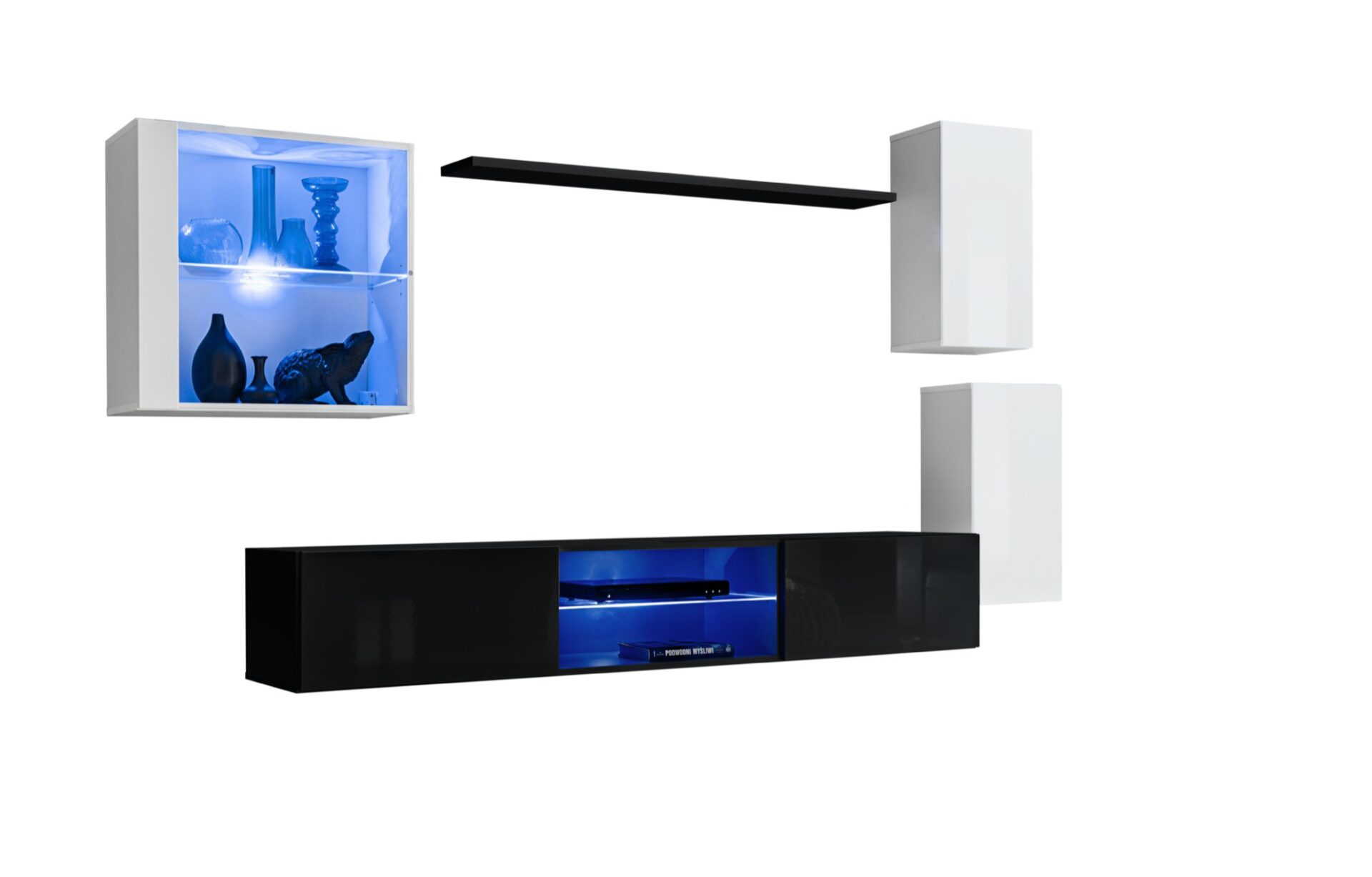 Wall-hung display cabinet: partially glazed doors, with a single shelf illuminated by blue LED lighting. Wall-hung shelf. 2x Wall-hung cabinet: doors, with a single shelf behind them (2 spaces). TV/Radio/TV cabinet: central compartment with a glass shelf illuminated by blue LED lighting, flaps supported by gas struts on the sides, with a single compartment behind each. Fronts open with a push-click mechanism.