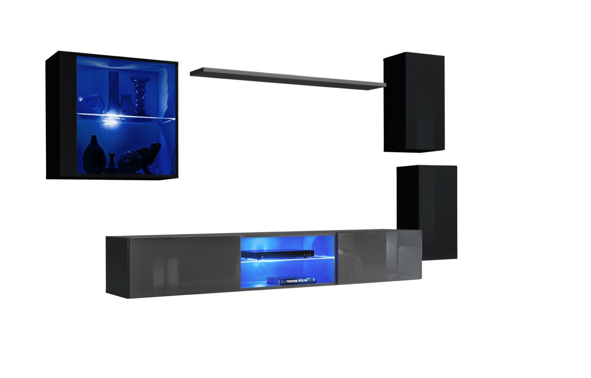 Wall-hung display cabinet: partially glazed doors, with a single shelf illuminated by blue LED lighting. Wall-hung shelf. 2x Wall-hung cabinet: doors, with a single shelf behind them (2 spaces). TV/Radio/TV cabinet: central compartment with a glass shelf illuminated by blue LED lighting, flaps supported by gas struts on the sides, with a single compartment behind each. Fronts open with a push-click mechanism.