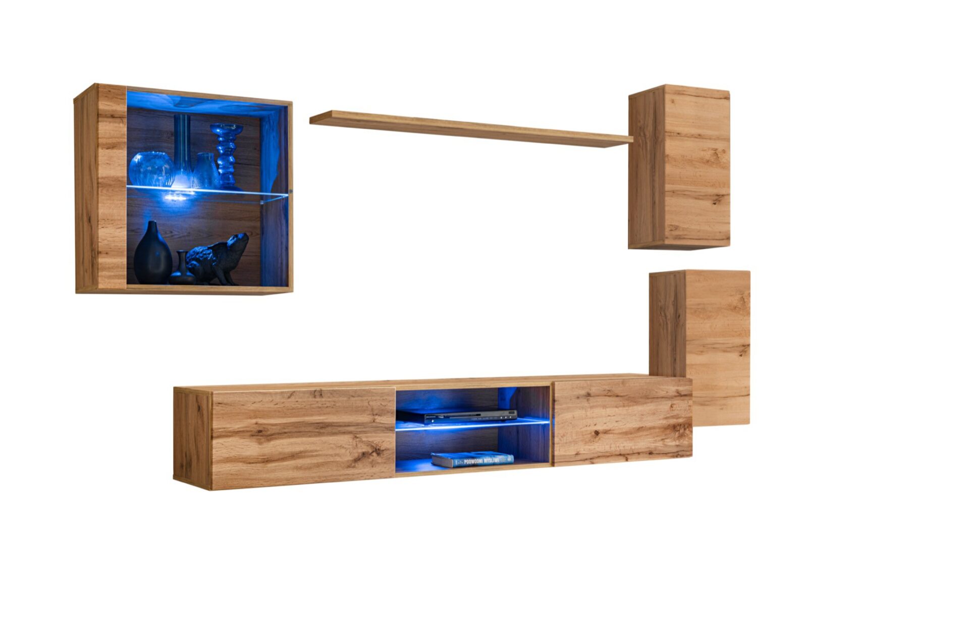 Wall-hung display cabinet: partially glazed doors, with a single shelf illuminated by blue LED lighting. Wall-hung shelf. 2x Wall-hung cabinet: doors, with a single shelf behind them (2 spaces). TV/Radio/TV cabinet: central compartment with a glass shelf illuminated by blue LED lighting, flaps supported by gas struts on the sides, with a single compartment behind each. Fronts open with a push-click mechanism.