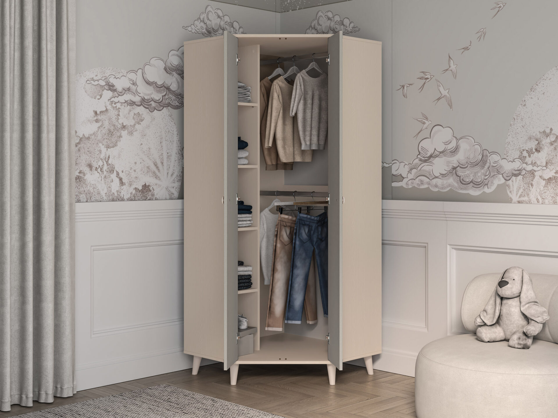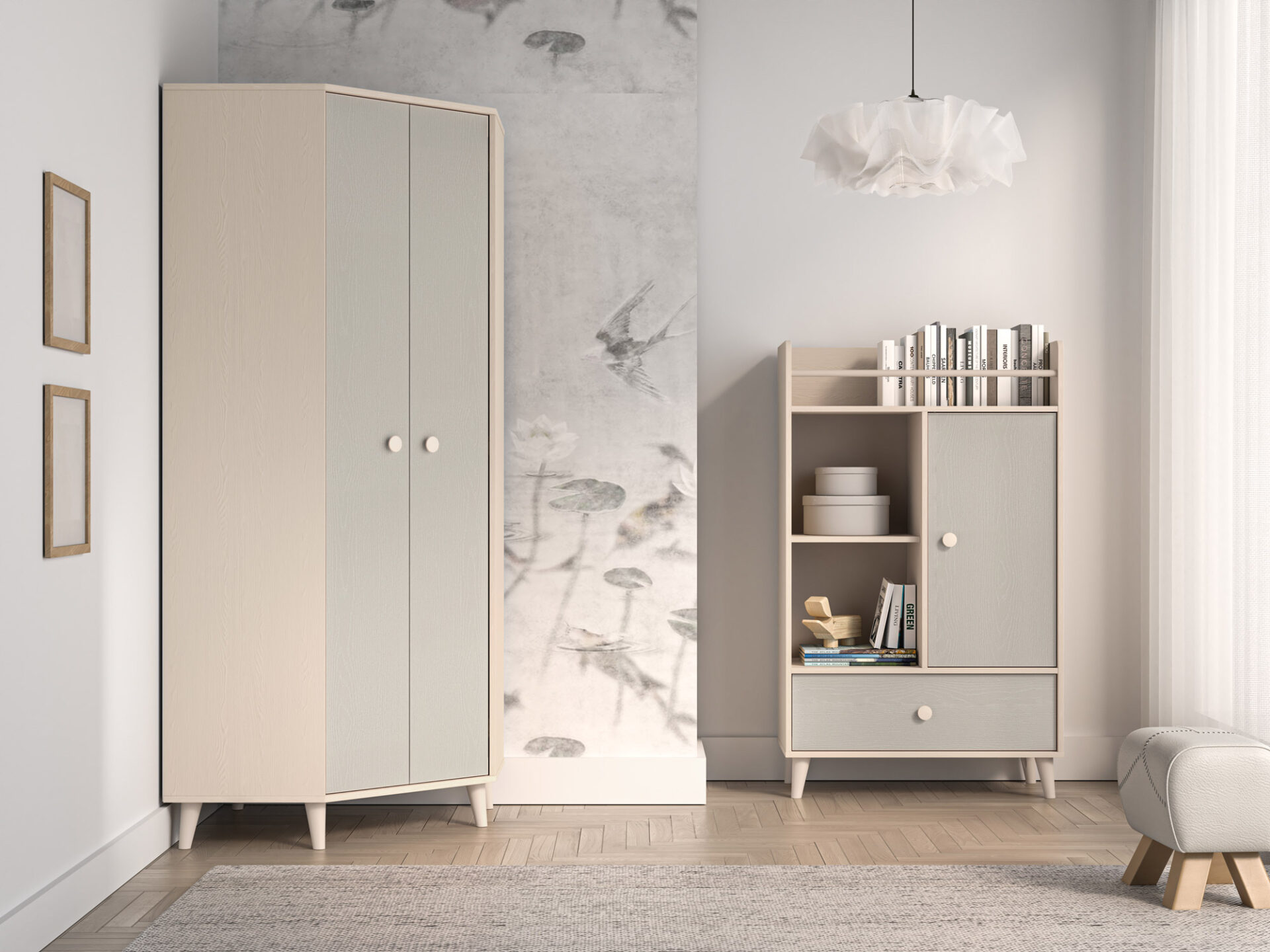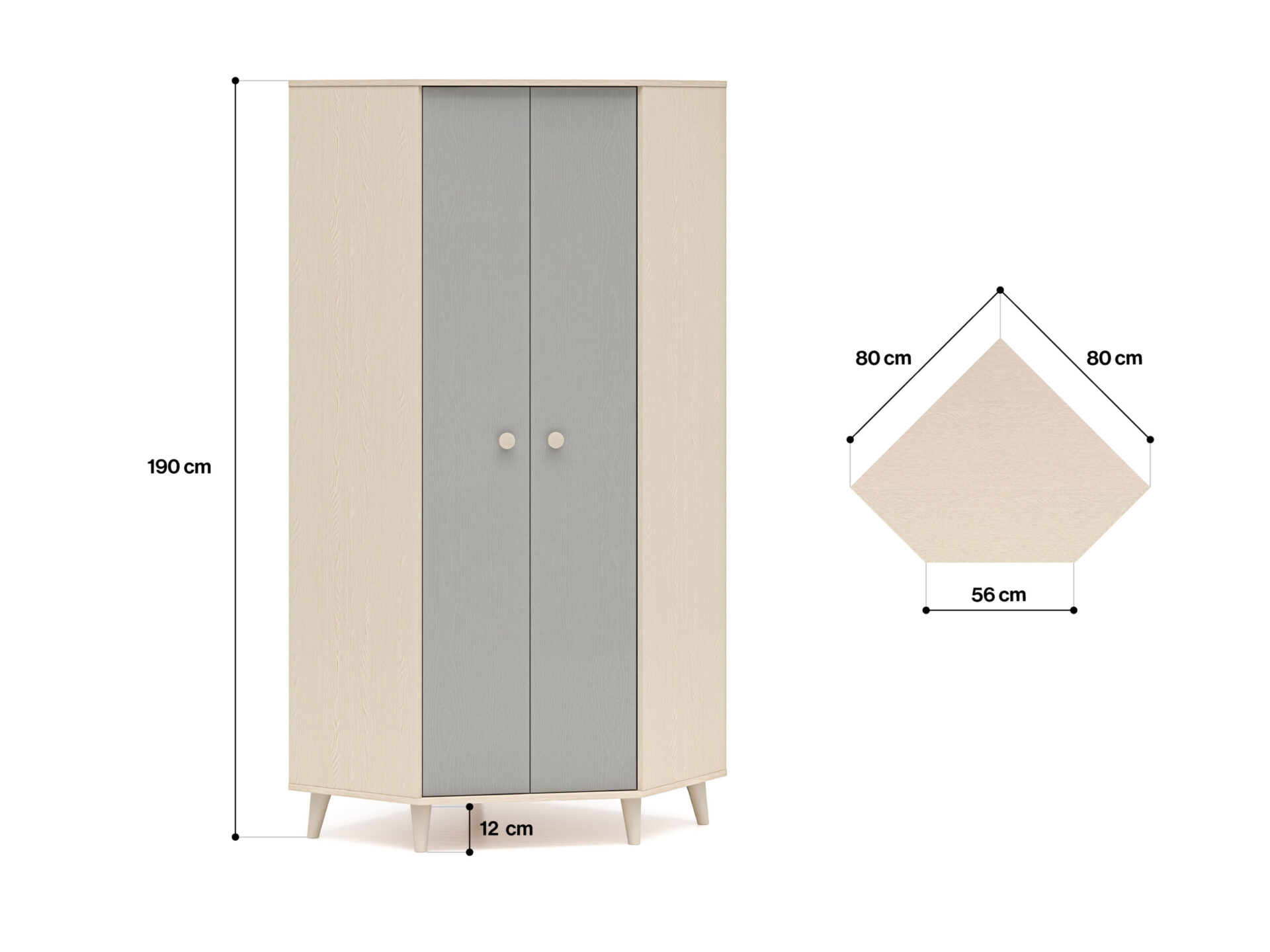 The Mevel 01 two-door corner wardrobe provides ample storage space. The spacious space is equipped with two convenient hanging rails at different heights and five spacious niches, allowing for comfortable storage of a large number of clothes. The wardrobe will perfectly fill the corner of your child’s room, maximizing the use of even the smallest space.