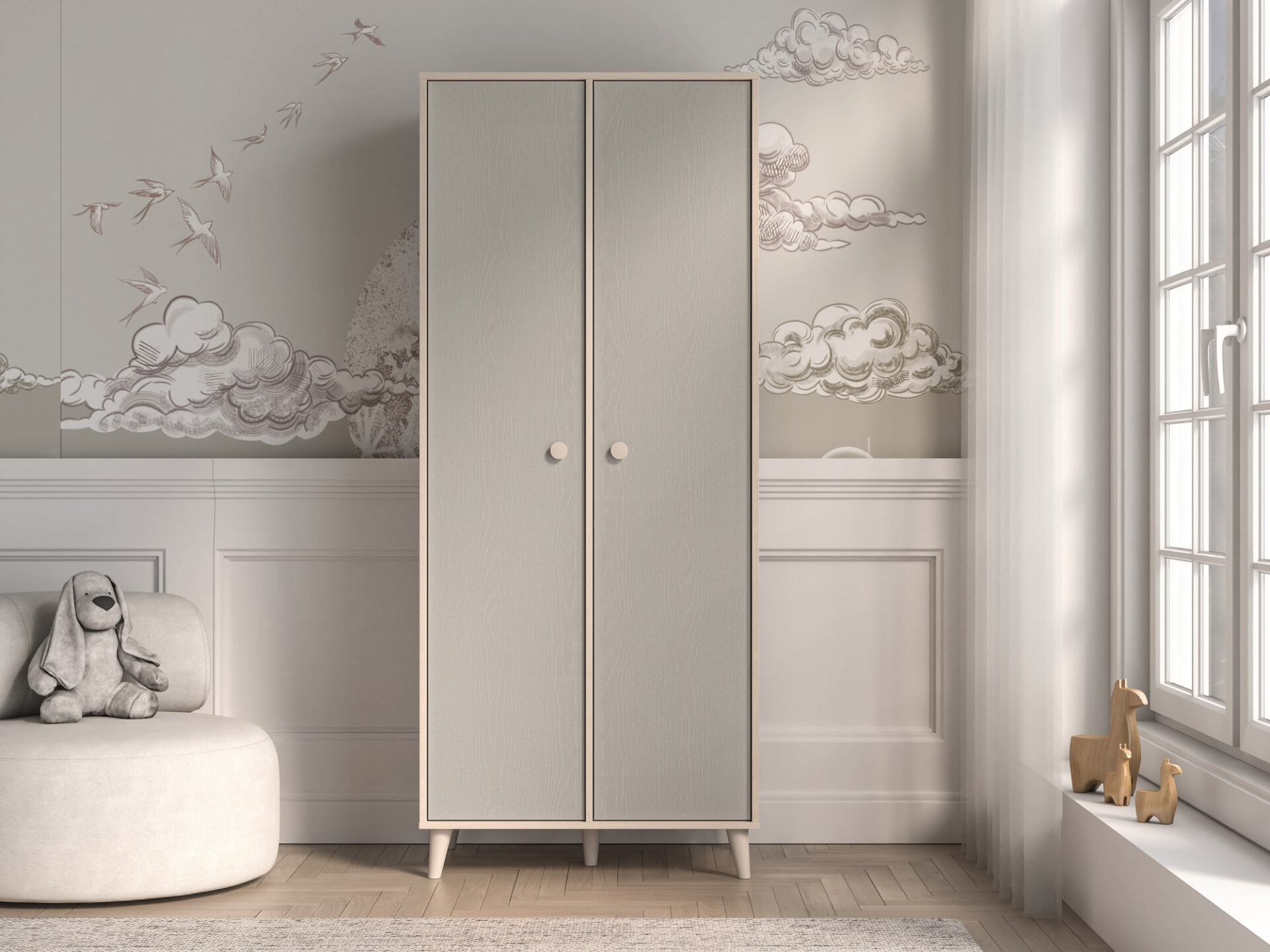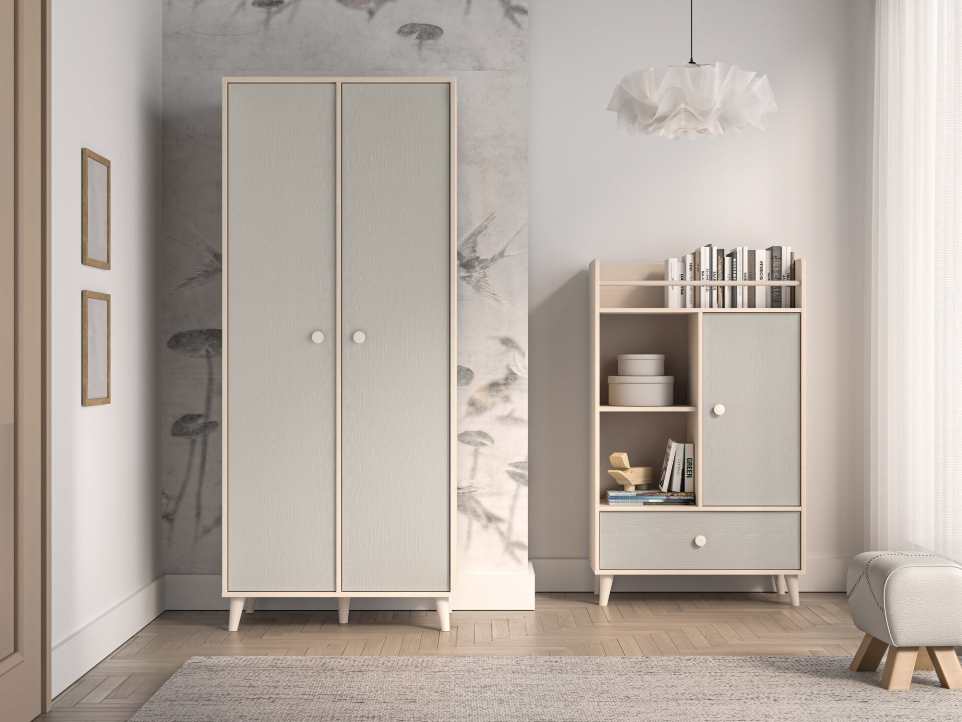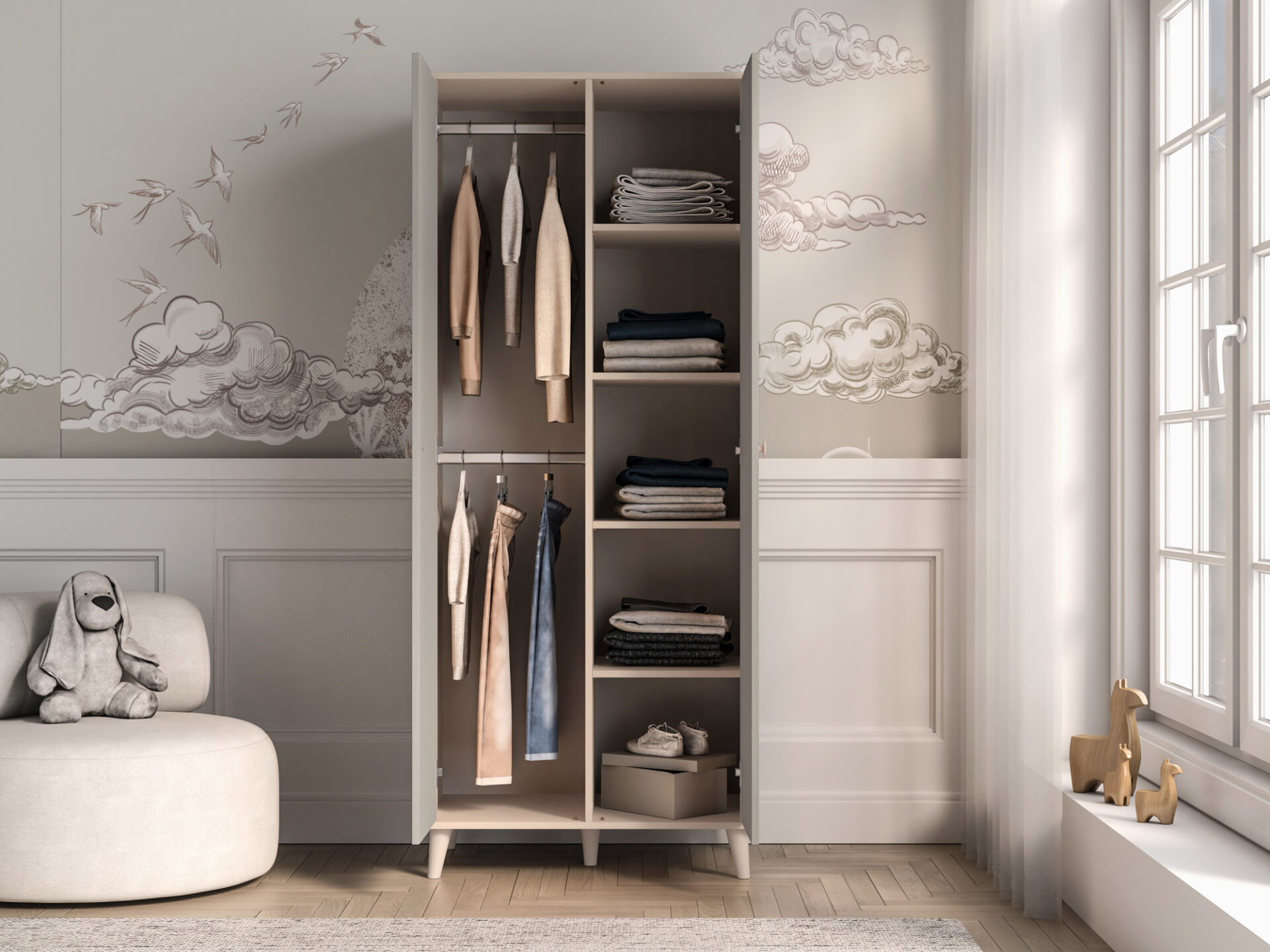 The Mevel 02 double-door wardrobe provides ample storage space. The spacious space behind the double doors is equipped with two ergonomic rails at different heights, allowing for ample storage. The right side of the wardrobe features five spacious shelves, allowing for greater organization during everyday use.