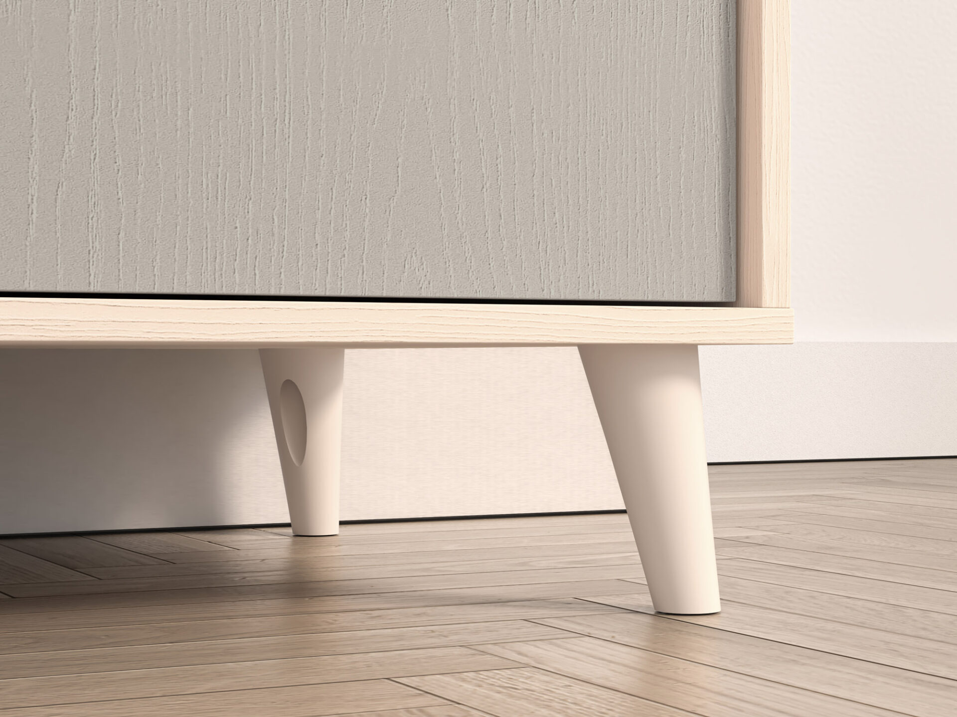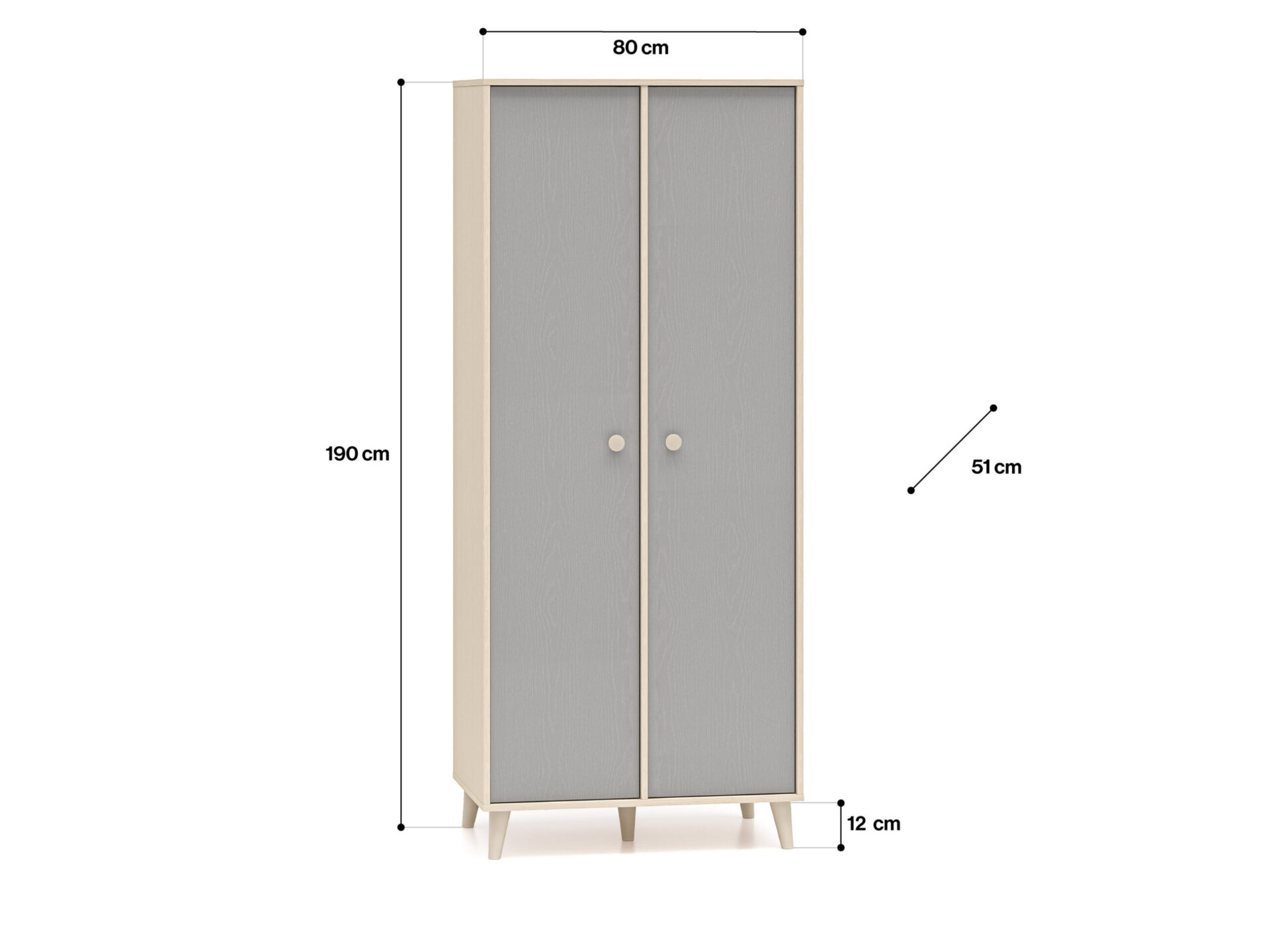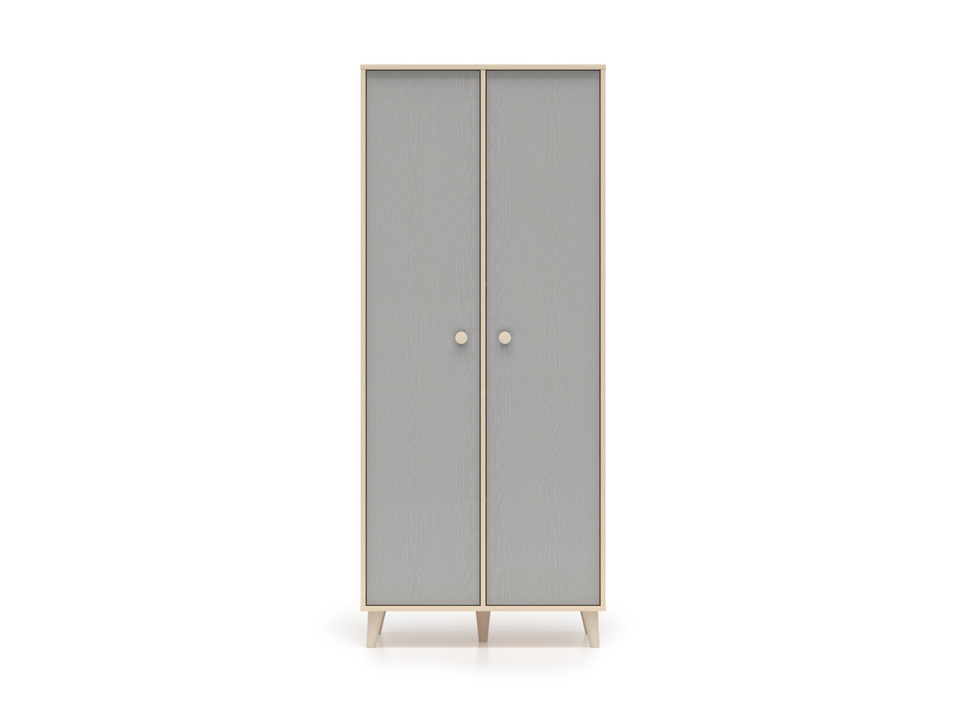 The Mevel 02 double-door wardrobe provides ample storage space. The spacious space behind the double doors is equipped with two ergonomic rails at different heights, allowing for ample storage. The right side of the wardrobe features five spacious shelves, allowing for greater organization during everyday use.