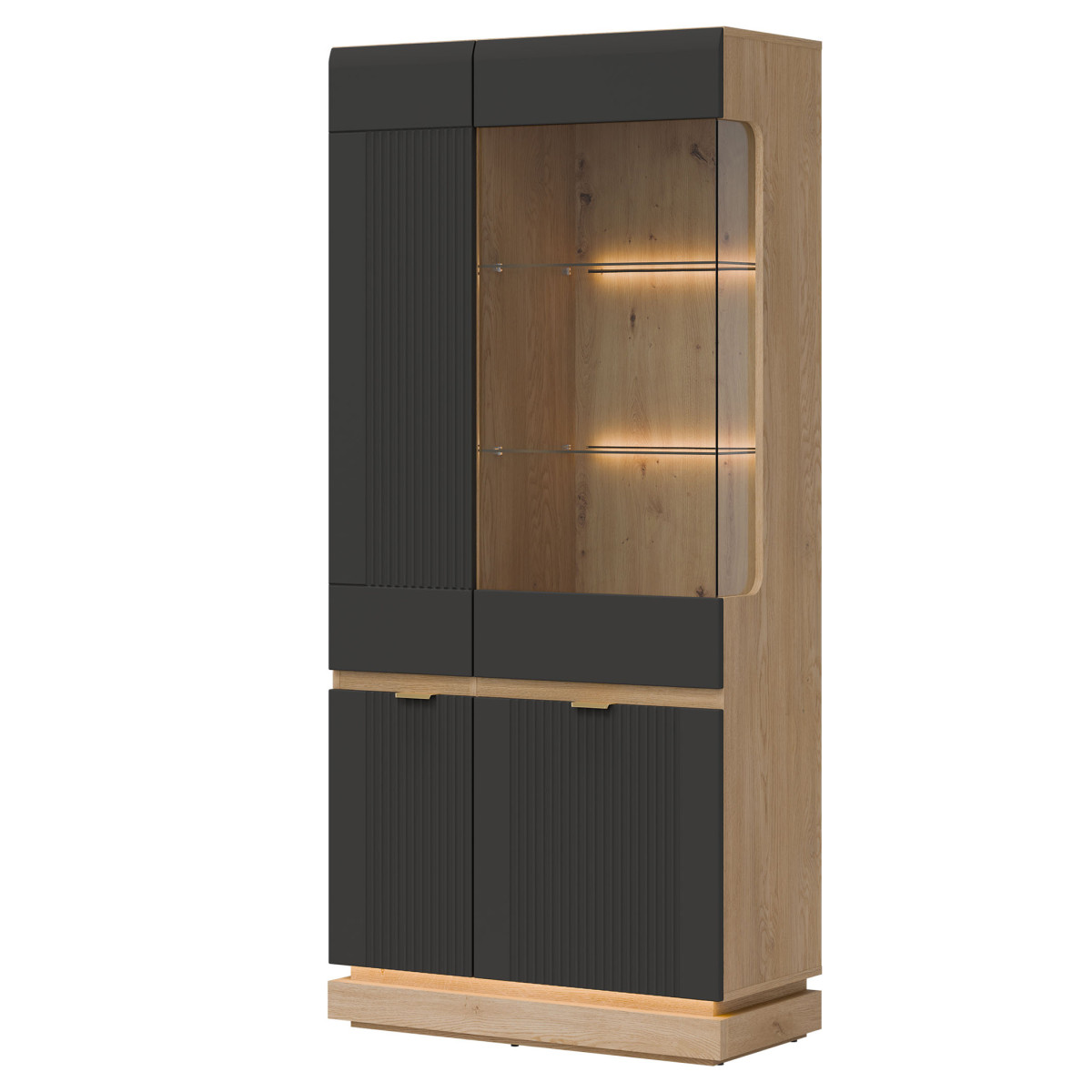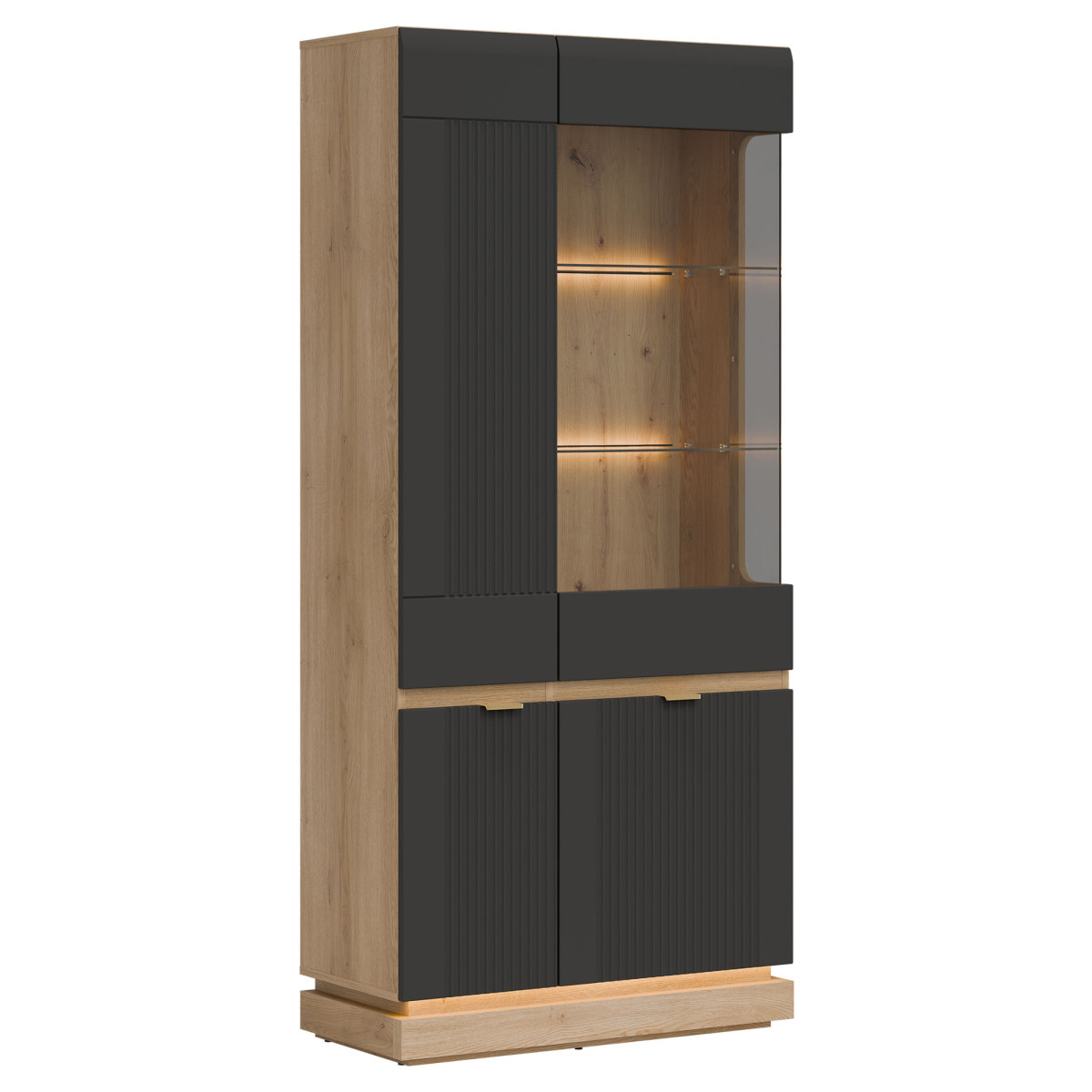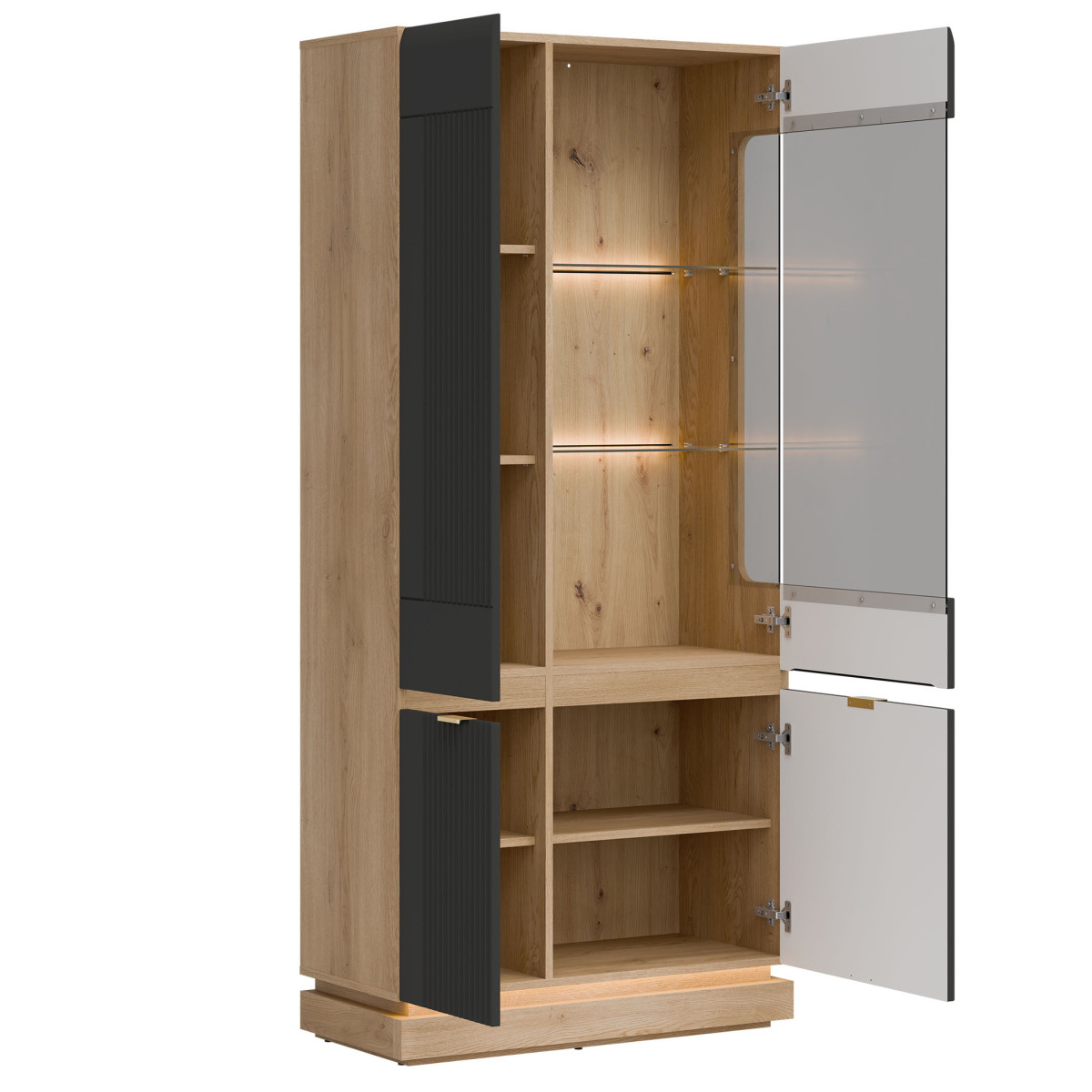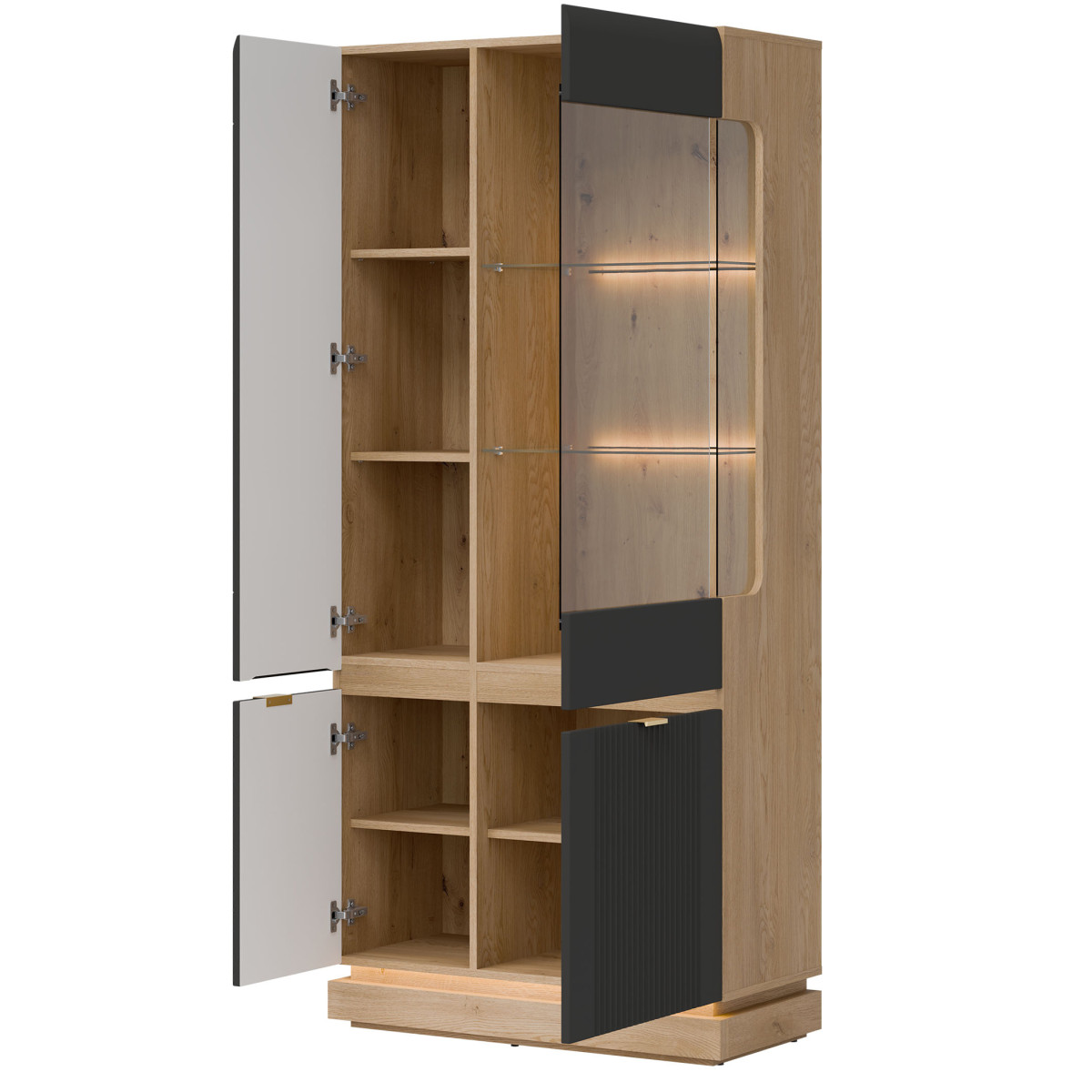 The ML06 display cabinet from the MILTON collection is an expanded version of the ML05 model, combining modern design with maximum functionality. The matte MDF fronts – available in a variety of colors – are adorned with subtle, vertical milling at the bottom, lending an elegant touch. Minimalist gold handles provide a stylish finishing touch, while optional LED lighting in the display area emphasizes the modern form and creates a cozy atmosphere. The glass-fronted upper section is perfect for displaying decorations, glassware, or collectibles, while the lockable lower cabinets offer ample storage space, helping to keep everything organized. The Cremona Torro Oak finish adds visual warmth and beautifully complements any color of the fronts, creating a cohesive and elegant composition. Thanks to the soft-close system, the display cabinet is comfortable and silent to use. This piece will fit perfectly in a living room, dining room, or modern kitchen, bringing harmony, class, and timeless style to the interior.