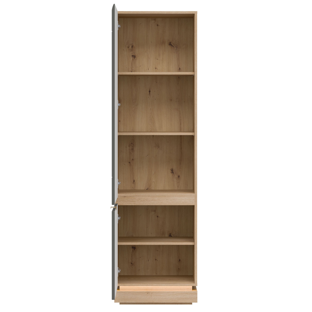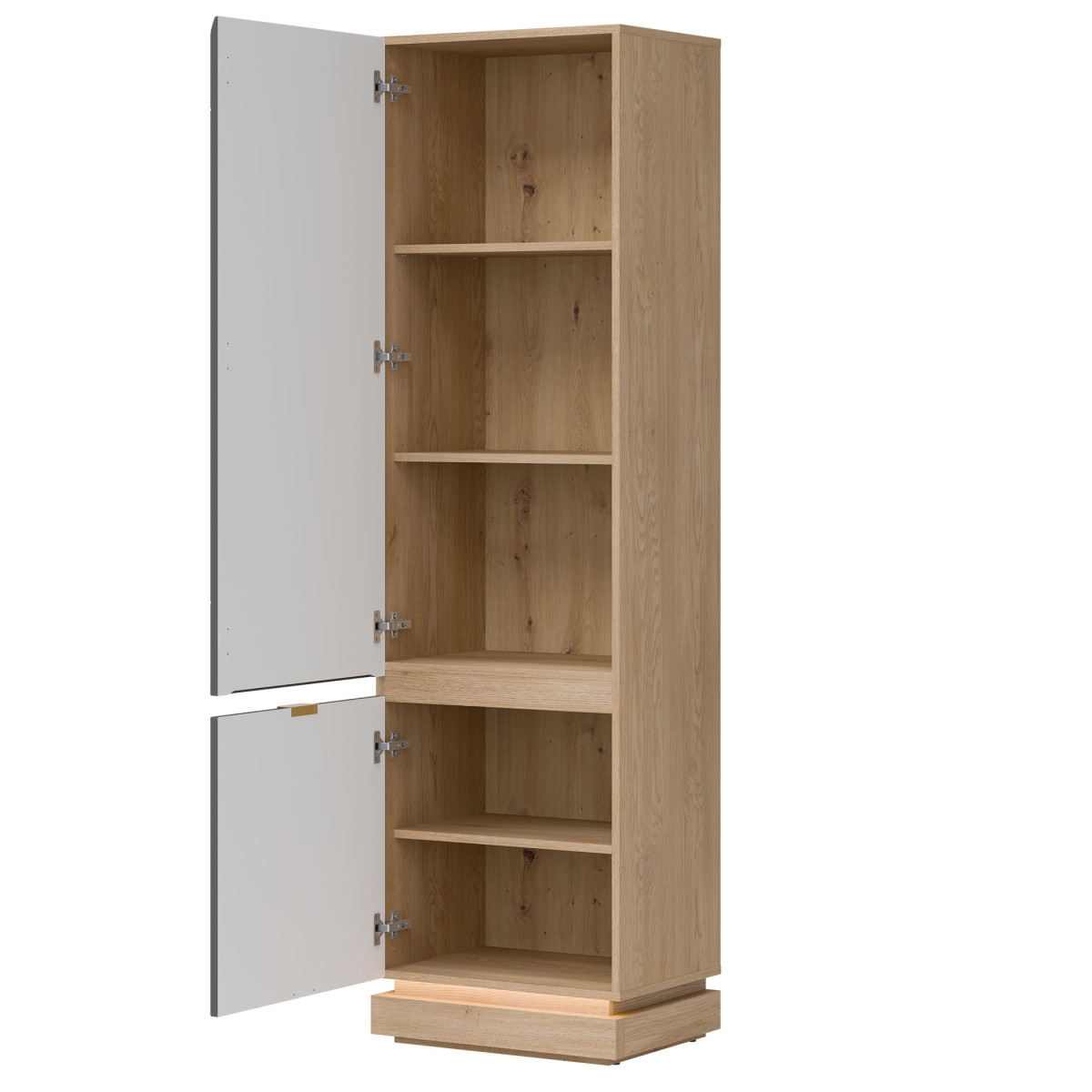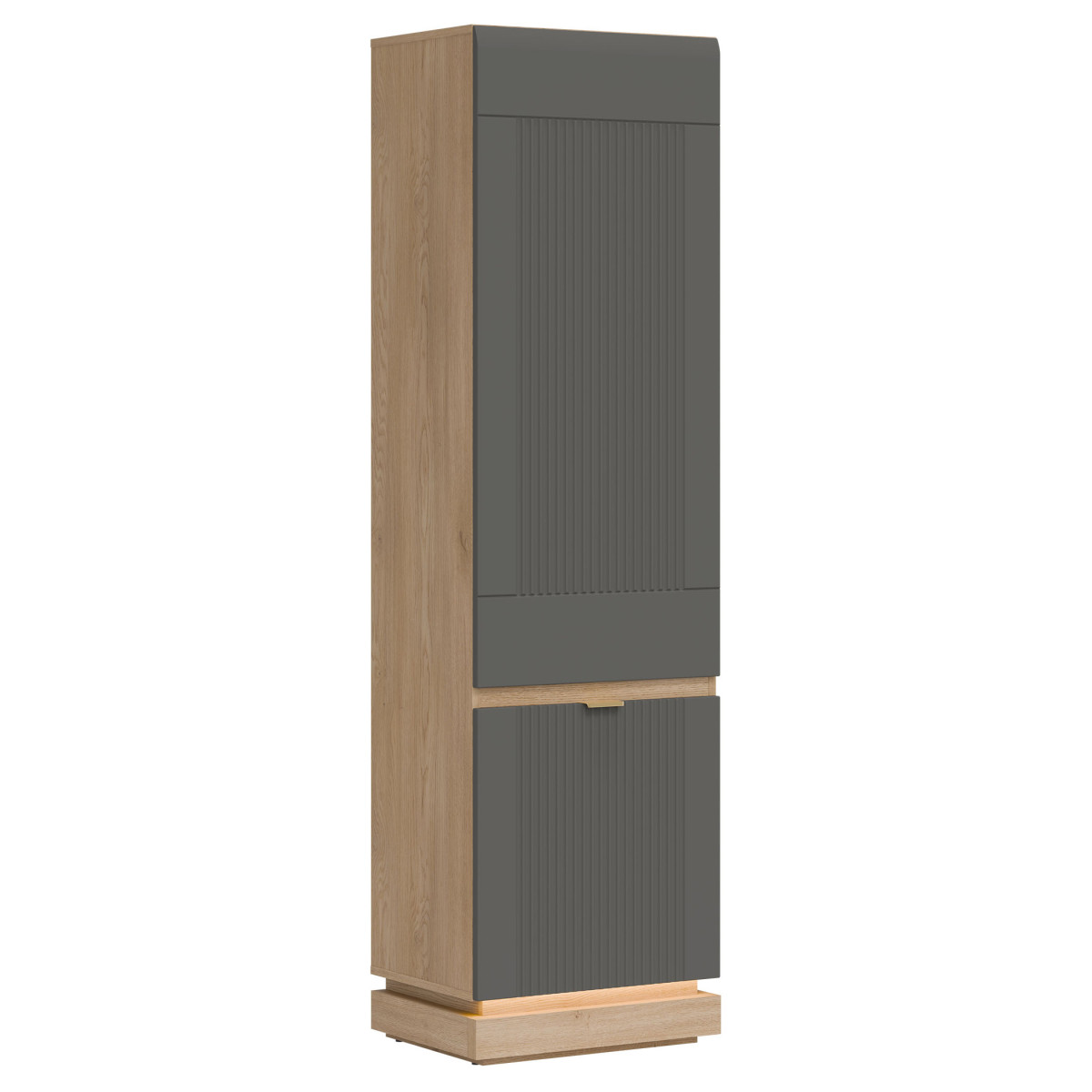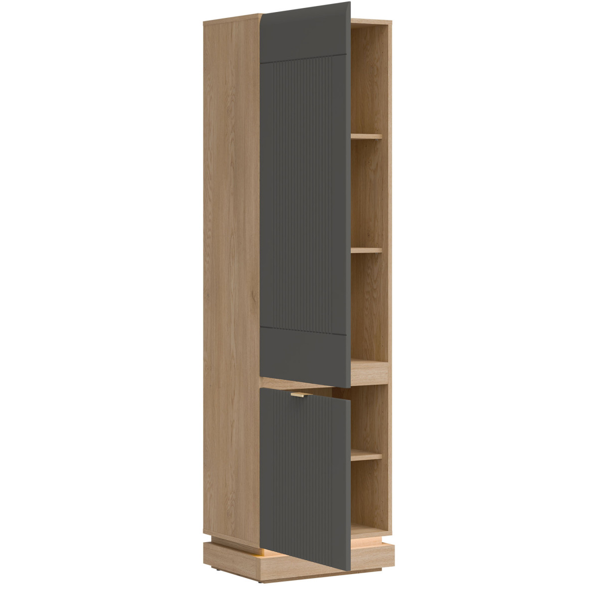 The MILTON ML07 cabinet is an elegant and functional addition to the MILTON collection, perfect for modern interiors where space and aesthetics combine. The tall, lockable structure is designed for maximum capacity – the internal shelves are perfect for storing books, documents, and everyday accessories, ensuring order and easy access to the contents. The matte MDF fronts, available in several subdued colors, feature subtle milling that emphasizes the modern yet timeless character of the piece. Stylish gold handles add an elegant finish. The Cremona Torro Oak body brings natural warmth to the space and harmoniously complements the colors of the fronts, creating a modern yet cozy composition. The cabinet is equipped with a soft-close system, ensuring exceptional comfort. It’s the perfect choice for a living room, office, or hallway – anywhere where style, functionality, and high-quality craftsmanship are paramount.