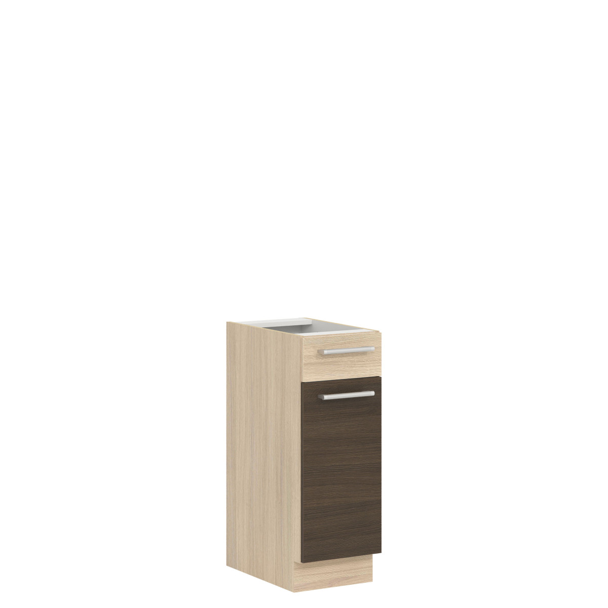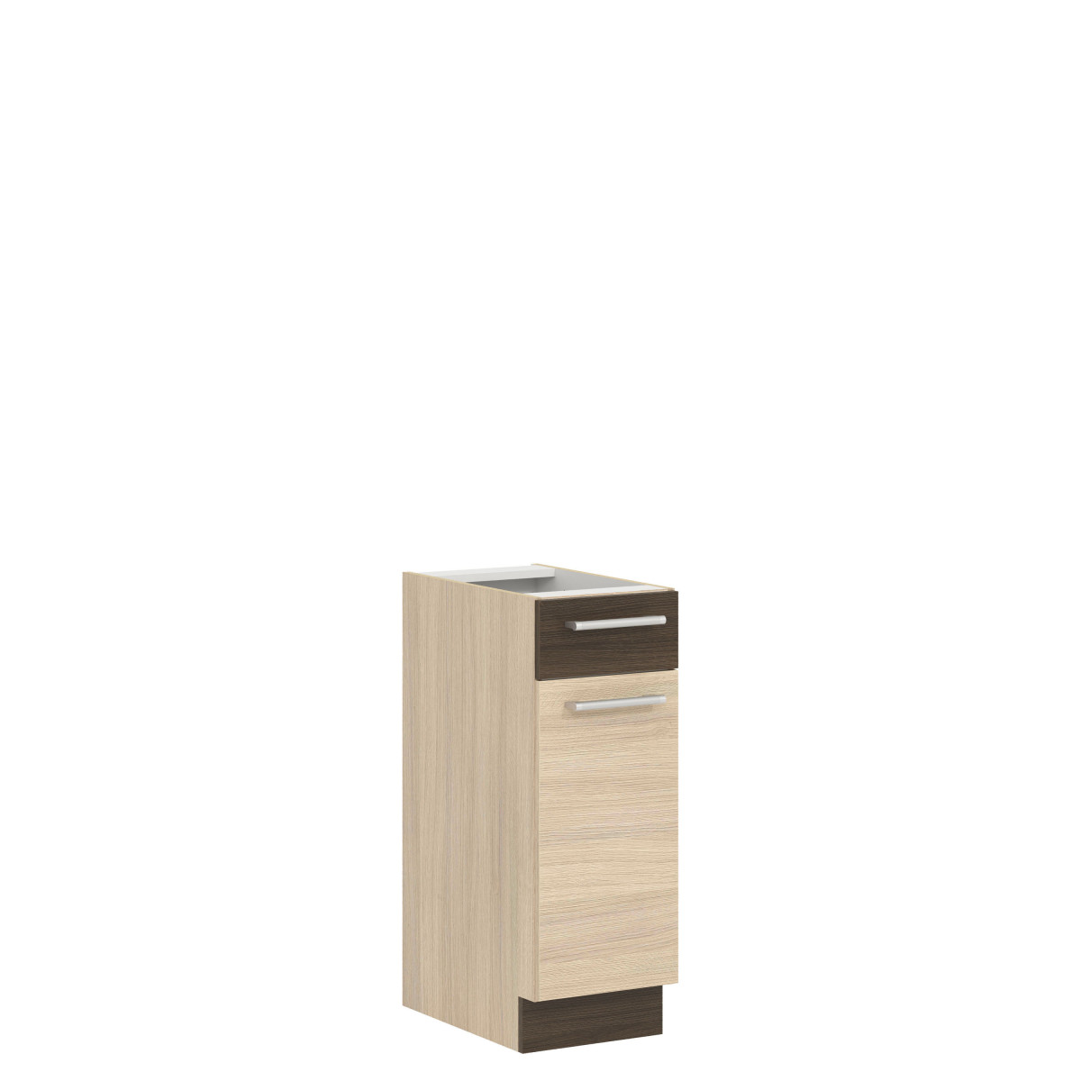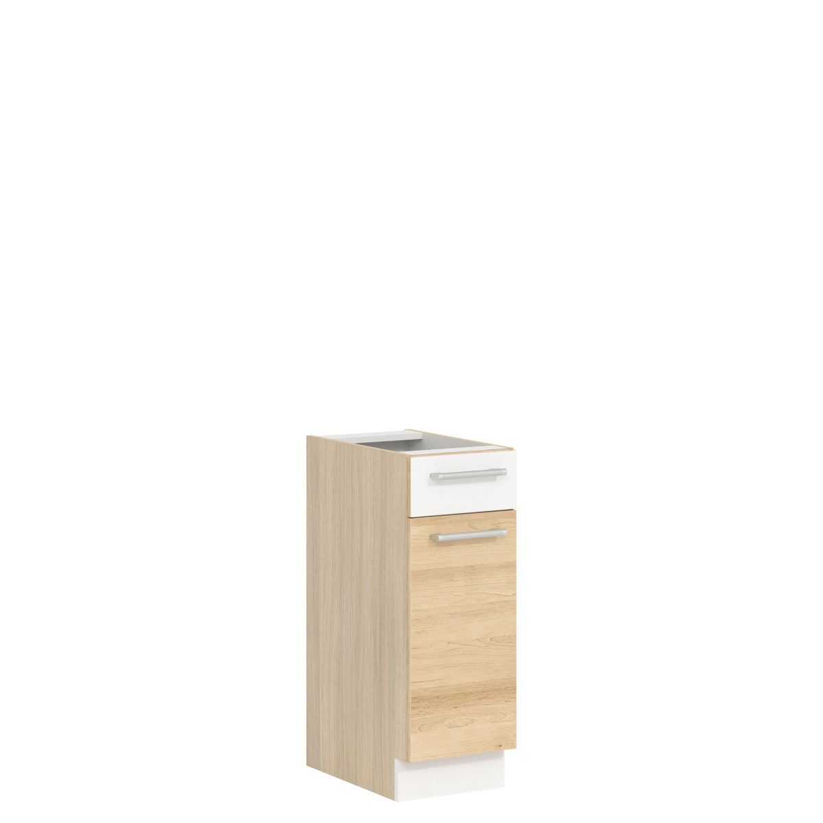 The MD12/D30S1 base cabinet comes from the Modena kitchen collection. This single-front cabinet with a drawer, opening left or right, and featuring two alcoves, is sure to hold small dishes and kitchen utensils, which are good to have within reach. Measuring 30 cm wide and 82 cm high, it perfectly complements the lower kitchen unit. The cabinet must be purchased in two separate parts (front and body). The front is available in light rijeka, dark rijeka, beech/gloss white, and gloss white/matt graphite, while the body is in light rijeka. Available front colors allow you to customize the design to your individual needs. The entire collection consists of individual elements that you can choose and assemble yourself, or choose from several ready-made sets. Additional advantages of the collection include adjustable legs on the base units, three-dimensionally adjustable suspension brackets on the upper units, and high-quality accessories. The cabinet, like the entire Modena furniture collection, has been thoughtfully designed to guarantee large storage space and long-lasting use.
