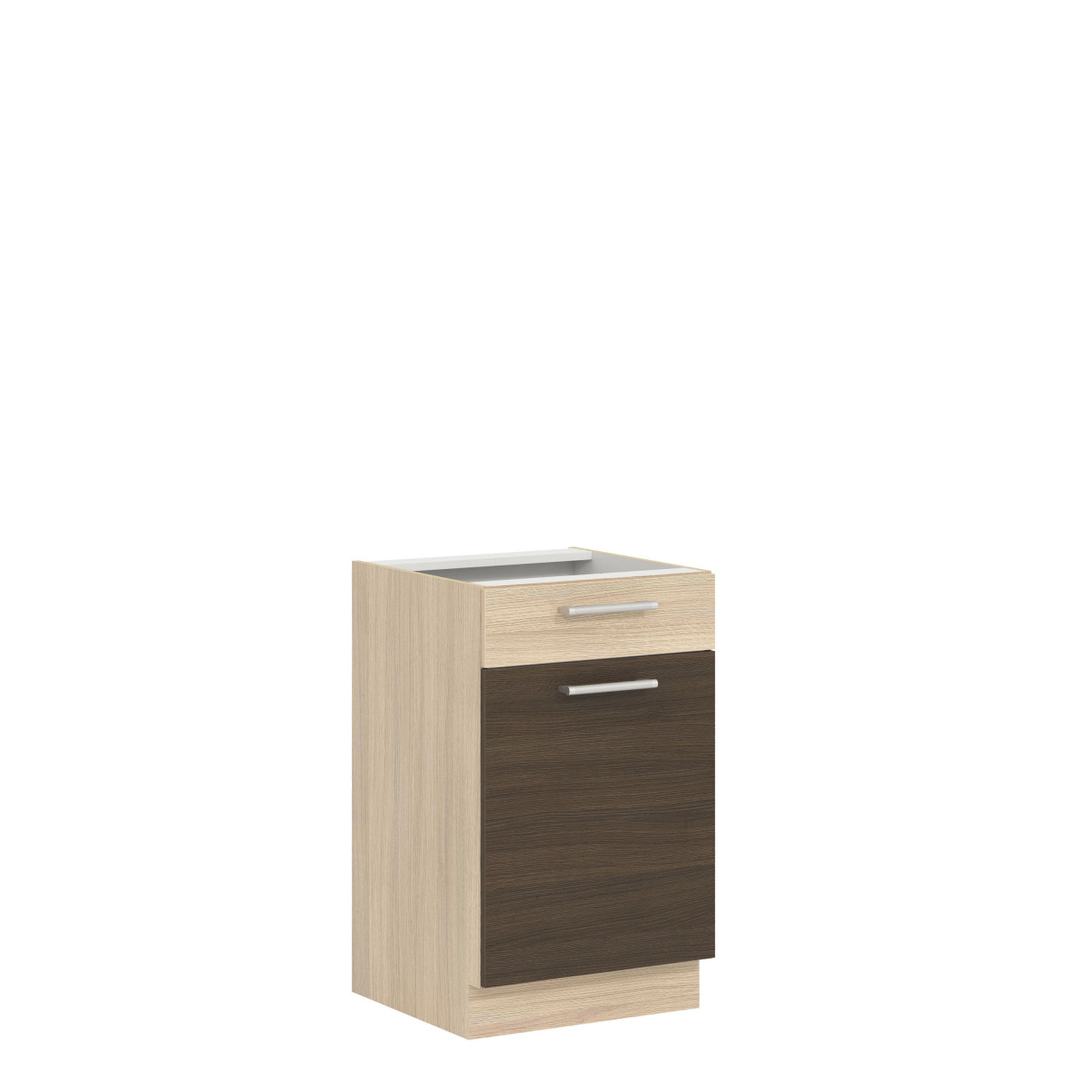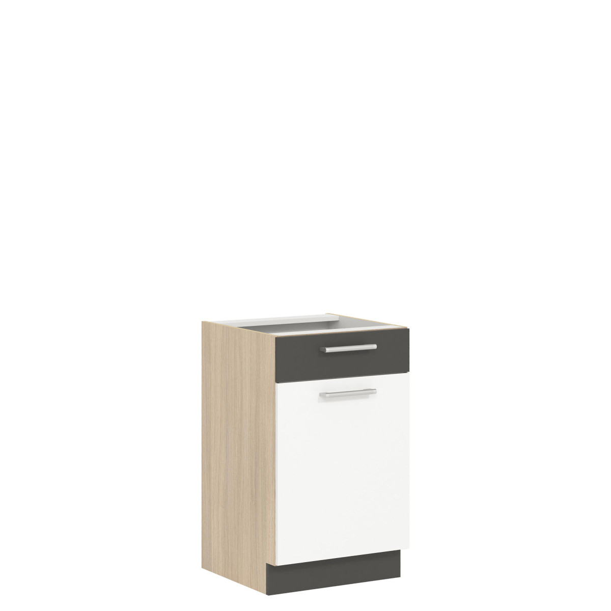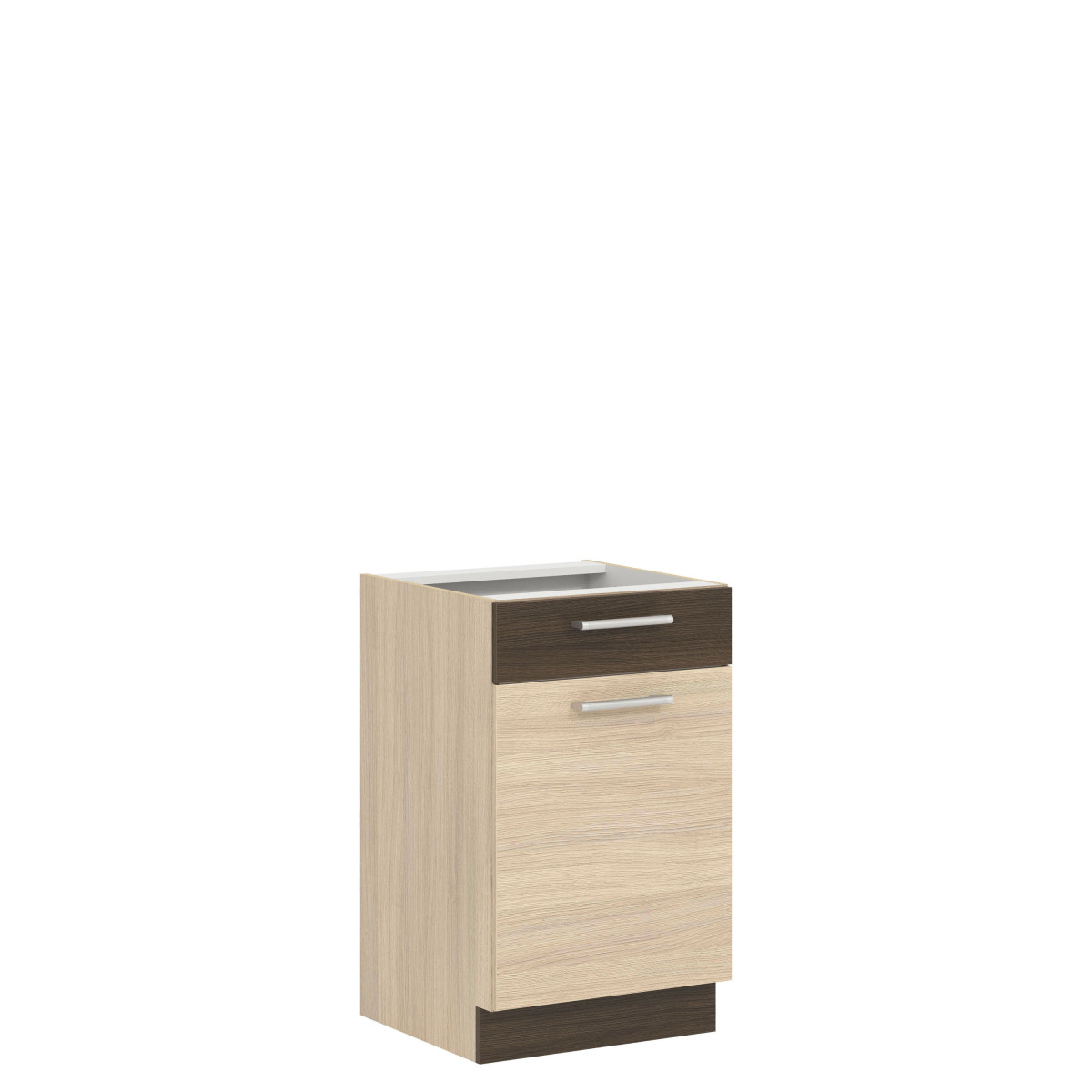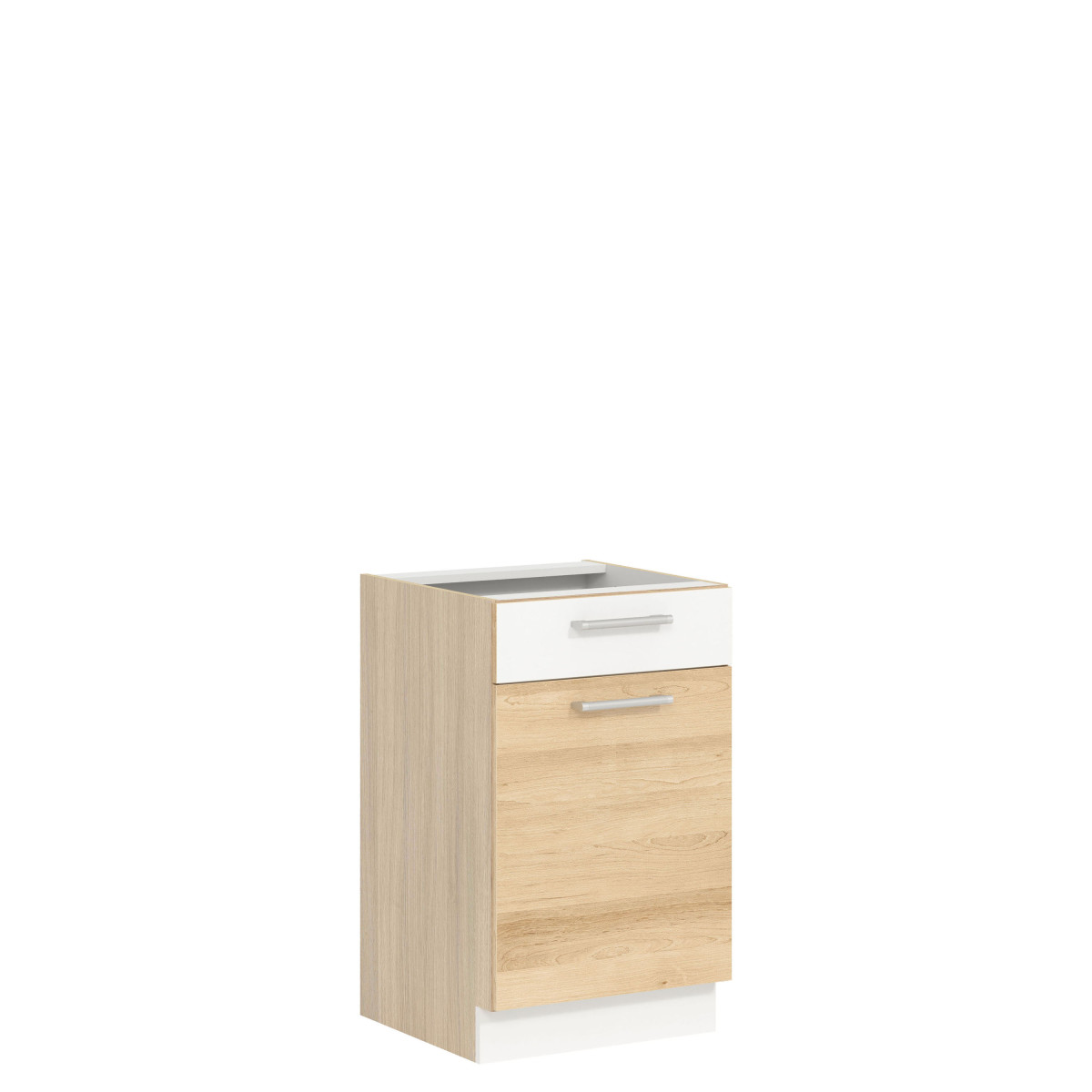 The MD15/D50S1 base cabinet comes from the Modena kitchen collection. This single-front cabinet with a drawer directly above the countertop opens left or right, and features two alcoves that are sure to hold small dishes and kitchen utensils, which are good to have within reach. Measuring 50 cm wide and 82 cm high, it perfectly complements the lower kitchen unit. The cabinet must be purchased in two separate parts (front and body). The front is available in light rijeka, dark rijeka, beech/gloss white, and gloss white/matt graphite, while the body is in light rijeka. Available front colors allow you to customize the design to your individual needs. The entire collection consists of individual elements that you can choose and assemble yourself, or choose from several ready-made sets. Additional advantages of the collection include adjustable legs on the base units, three-dimensionally adjustable suspension brackets on the upper units, and high-quality accessories. The cabinet, like the entire Modena furniture collection, has been thoughtfully designed to guarantee large storage space and long-lasting use.