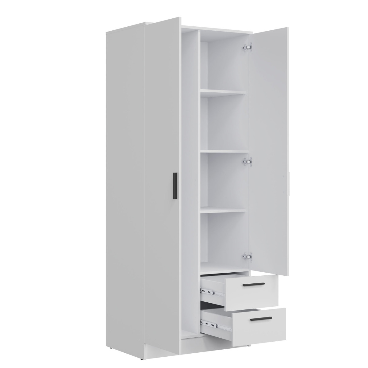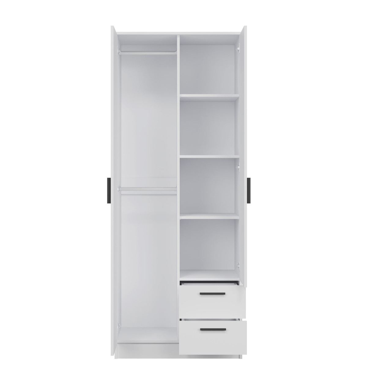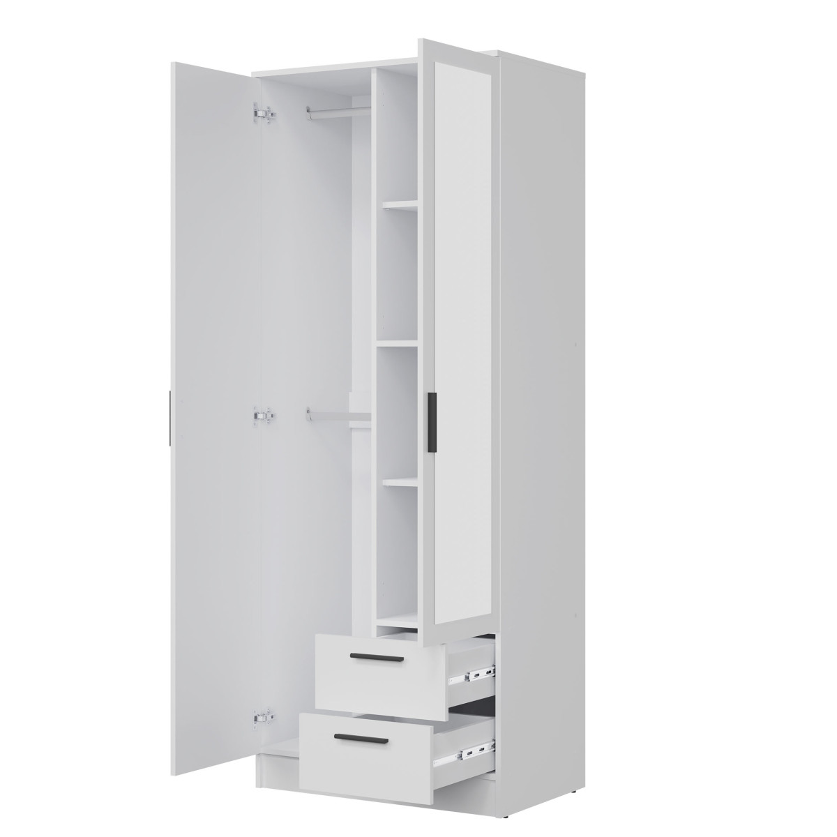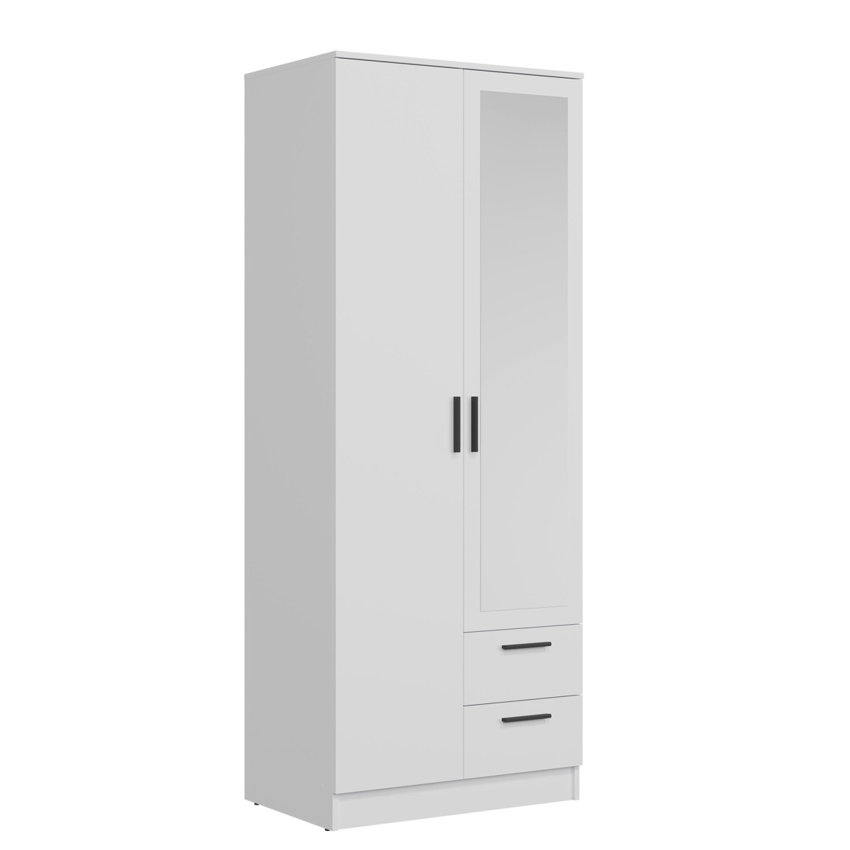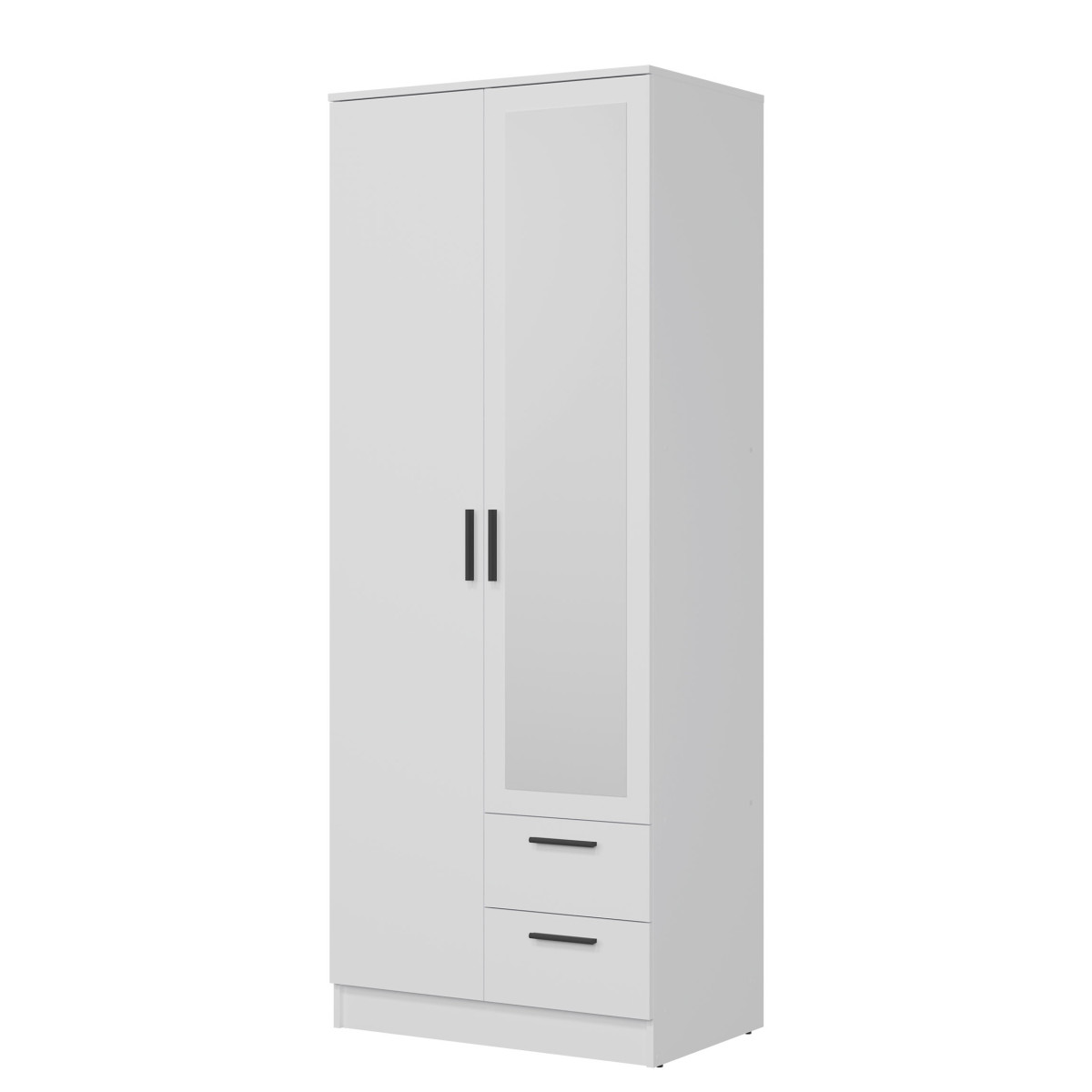Width 80 cm Depth 52 cm Height 204.7 cm Product weight with packaging 79.50 kg Manufacturer’s code / symbol MT02 Collection name MONTANA Name in the b2b system MONTANA MT02 WARDROBE WHITE/WHITE SET Number of product packages 3 Style Modern Equipment Assembly instructions / assembly accessories Assembly For self-assembly Body color White Body finish material / type / thickness 16 mm furniture board Top of body finish / material / type / thickness 16 mm furniture board Bottom crown of body finish / material / type / thickness 16 mm furniture board Shelf color White Shelf finish material / type / thickness 16 mm furniture board Shelf quantity 2 Crown type shelf quantity 1 Back wall finish material / type / thickness 2.5 mm HDF furniture board Back wall – visible part color White Front color White Front finish material / type / thickness 16 mm furniture board Front with mirror YES Front with mirror quantity 1 Front hinge ⌀ 35 mm adjustable in three planes Front handle / finish / color Plastic / black Full extension drawer runners Foot / finish / color Non-adjustable / Furniture glide / plastic / Black Number of doors 2 Number of drawers 2 Number of closed niches 5 Body equipment Standard 2 hanging rails