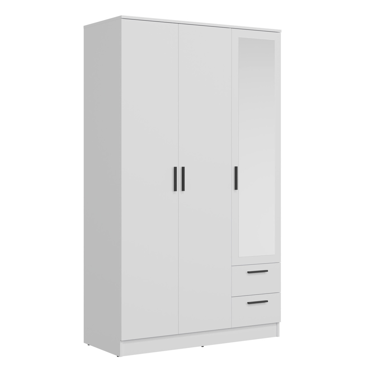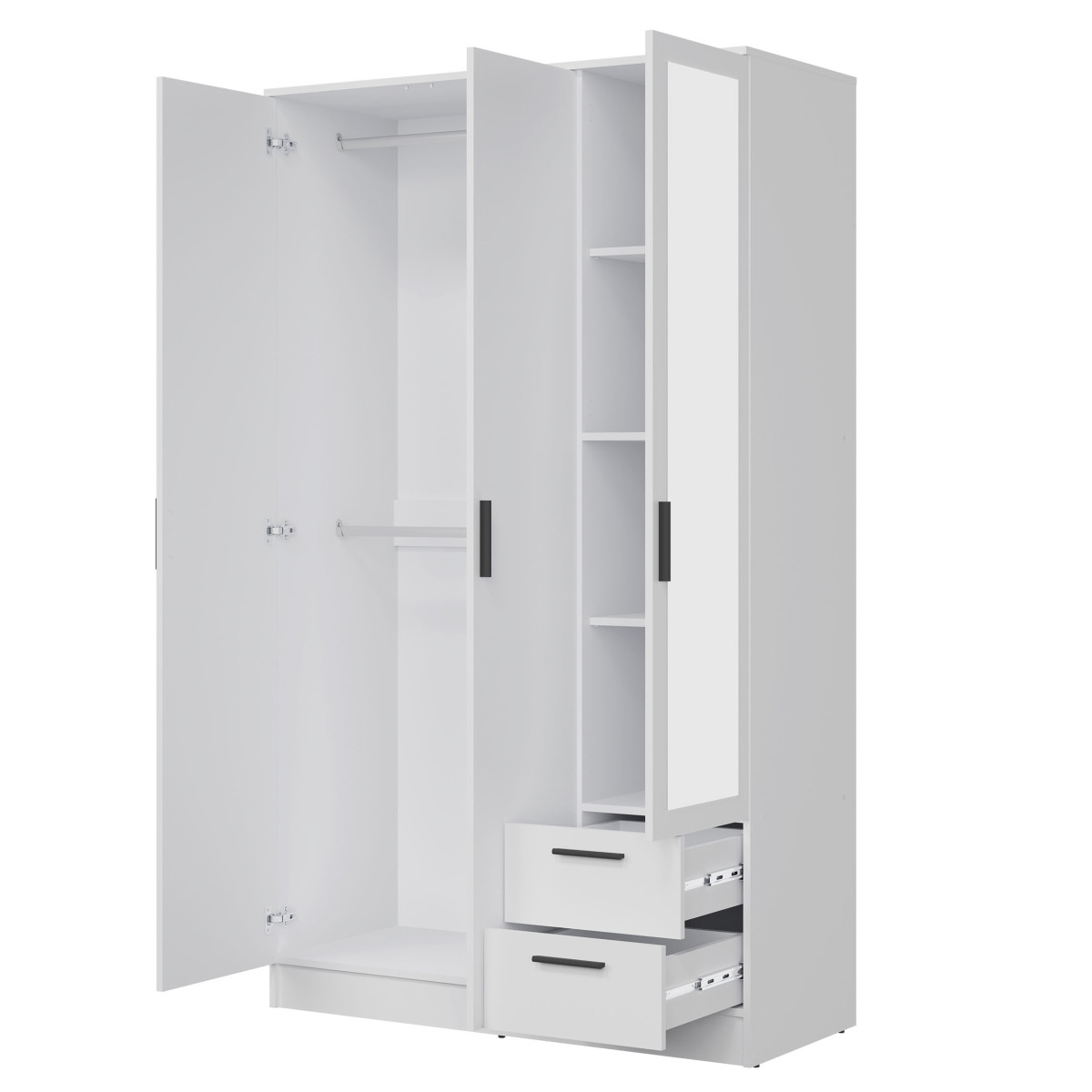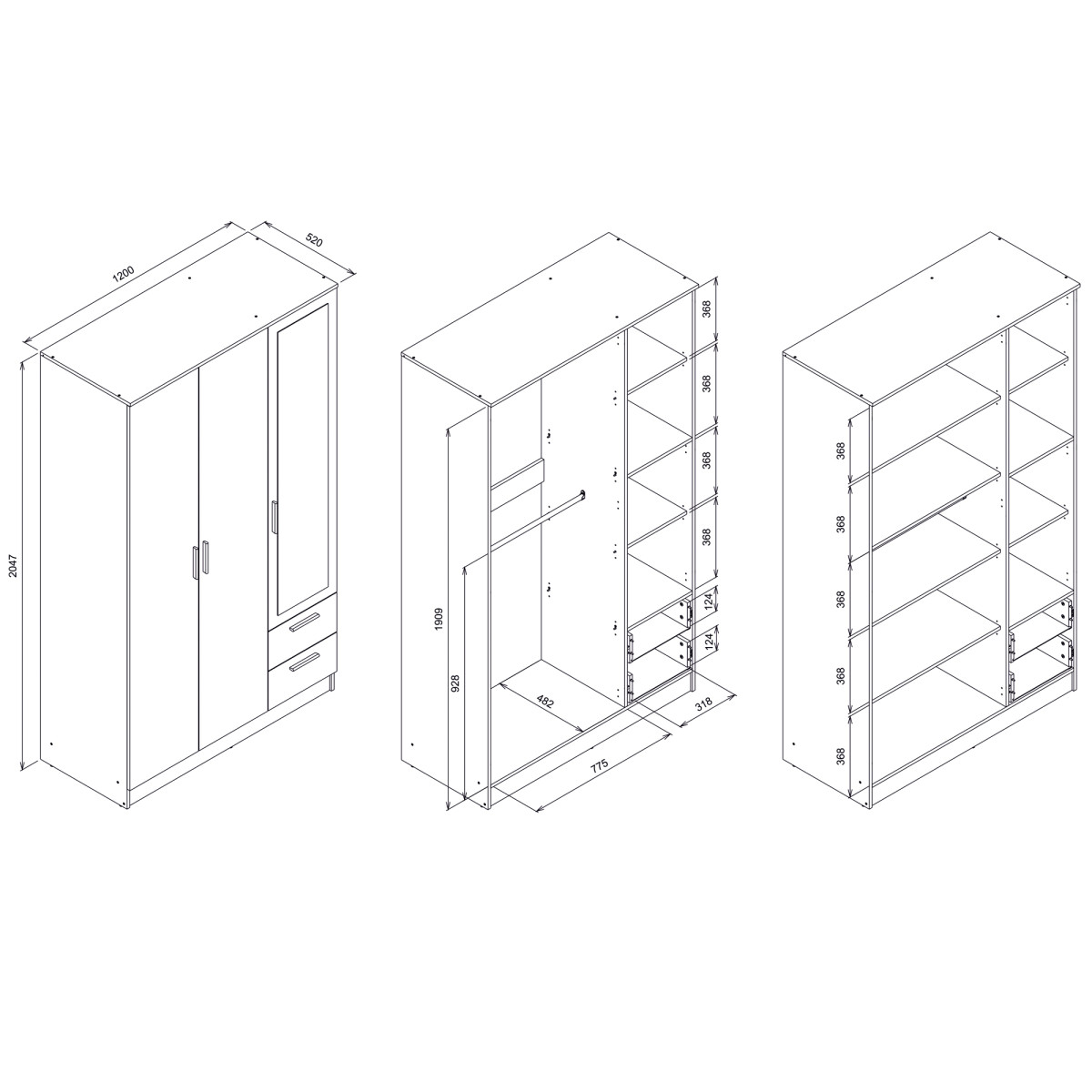 Width 120 cm Depth 52 cm Height 204.7 cm Product weight with packaging 95.85 kg Manufacturer’s code / symbol MT03 Collection name MONTANA Name in the b2b system MONTANA MT03 WARDROBE WHITE/WHITE SET Number of product packages 3 Style Modern Equipment Assembly instructions / assembly accessories Assembly For self-assembly Body color White Body finish material / type / thickness 16 mm furniture board Top of body finish / material / type / thickness 16 mm furniture board Bottom crown of body finish / material / type / thickness 16 mm furniture board Shelf color White Shelf finish material / type / thickness 16 mm furniture board Shelf quantity 2 Crown type shelf quantity 1 Back wall finish material / type / thickness 2.5 mm HDF furniture board Back wall – visible part color White Front color White Front finish material / type / thickness 16 mm furniture board Front with mirror YES Front with mirror quantity 1 Front hinge ⌀ 35 mm adjustable in three planes Front handle / finish / color Plastic / black Full extension drawer runners Foot / finish / color Non-adjustable / Furniture glide / plastic / Black Number of doors 3 Number of drawers 2 Number of closed niches Standard 5 / extendable up to 9 Body equipment Standard 2 hanger bars