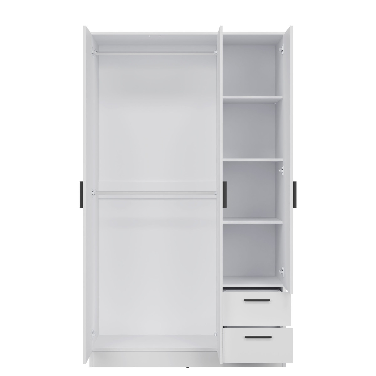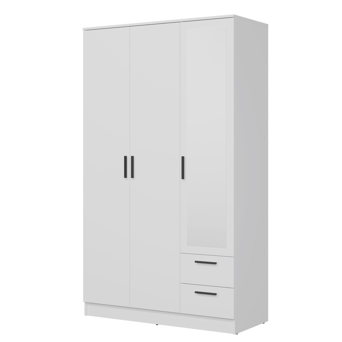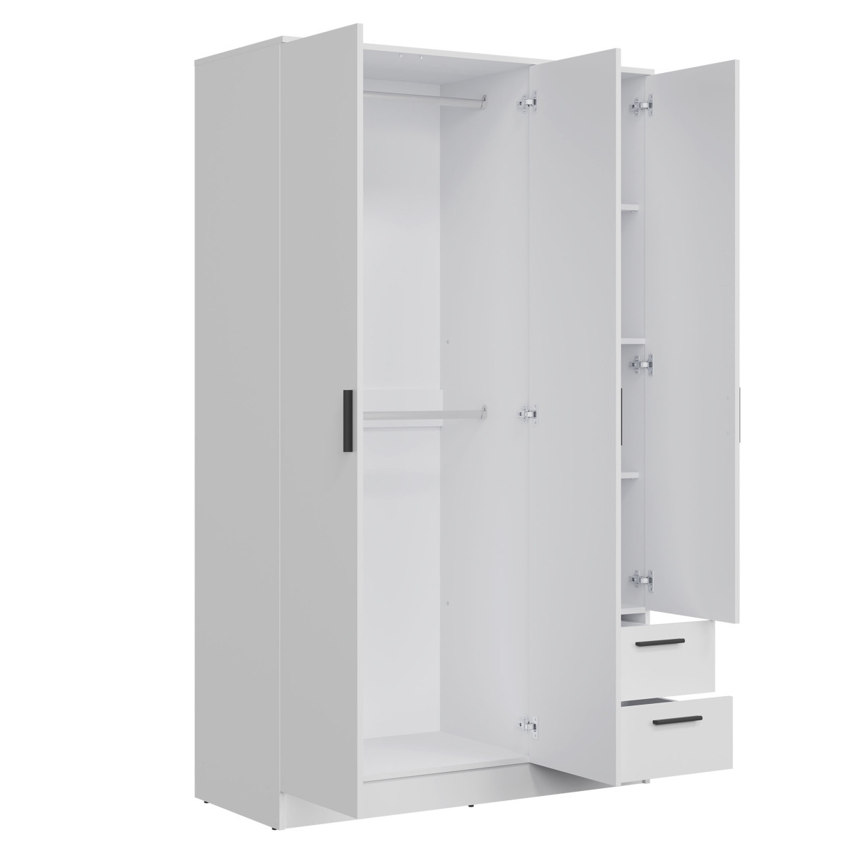 Width 120 cm Depth 52 cm Height 204.7 cm Product weight with packaging 95.85 kg Manufacturer’s code / symbol MT03 Collection name MONTANA Name in the b2b system MONTANA MT03 WARDROBE WHITE/WHITE SET Number of product packages 3 Style Modern Equipment Assembly instructions / assembly accessories Assembly For self-assembly Body color White Body finish material / type / thickness 16 mm furniture board Top of body finish / material / type / thickness 16 mm furniture board Bottom crown of body finish / material / type / thickness 16 mm furniture board Shelf color White Shelf finish material / type / thickness 16 mm furniture board Shelf quantity 2 Crown type shelf quantity 1 Back wall finish material / type / thickness 2.5 mm HDF furniture board Back wall – visible part color White Front color White Front finish material / type / thickness 16 mm furniture board Front with mirror YES Front with mirror quantity 1 Front hinge ⌀ 35 mm adjustable in three planes Front handle / finish / color Plastic / black Full extension drawer runners Foot / finish / color Non-adjustable / Furniture glide / plastic / Black Number of doors 3 Number of drawers 2 Number of closed niches Standard 5 / extendable up to 9 Body equipment Standard 2 hanger bars