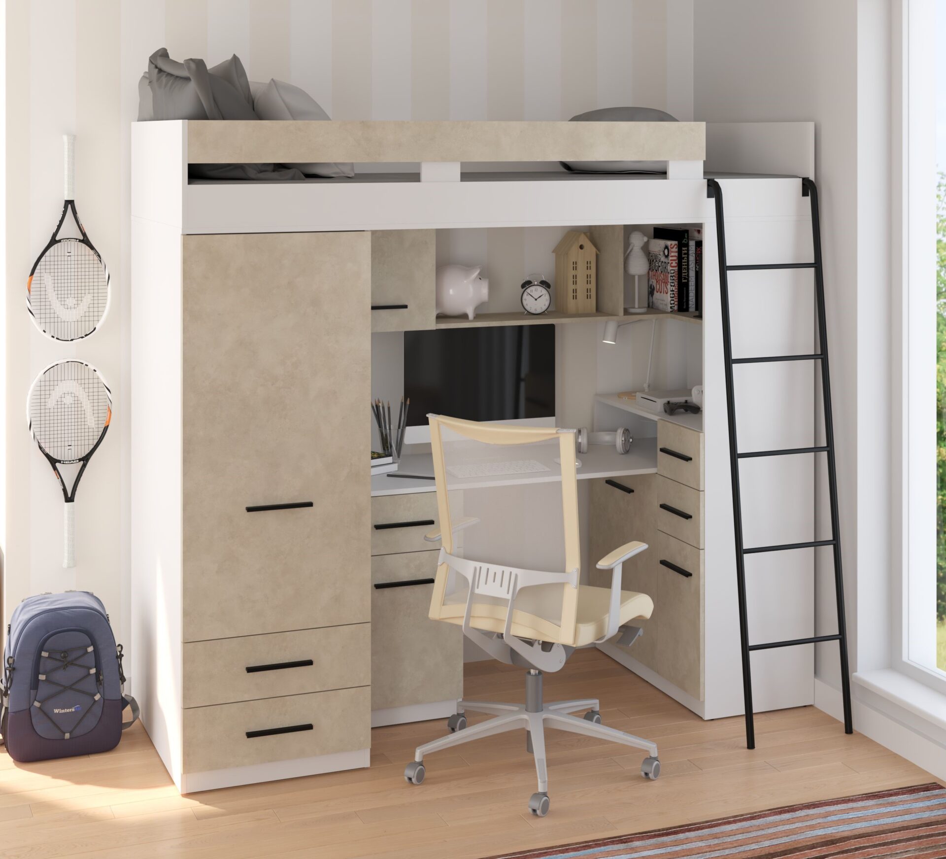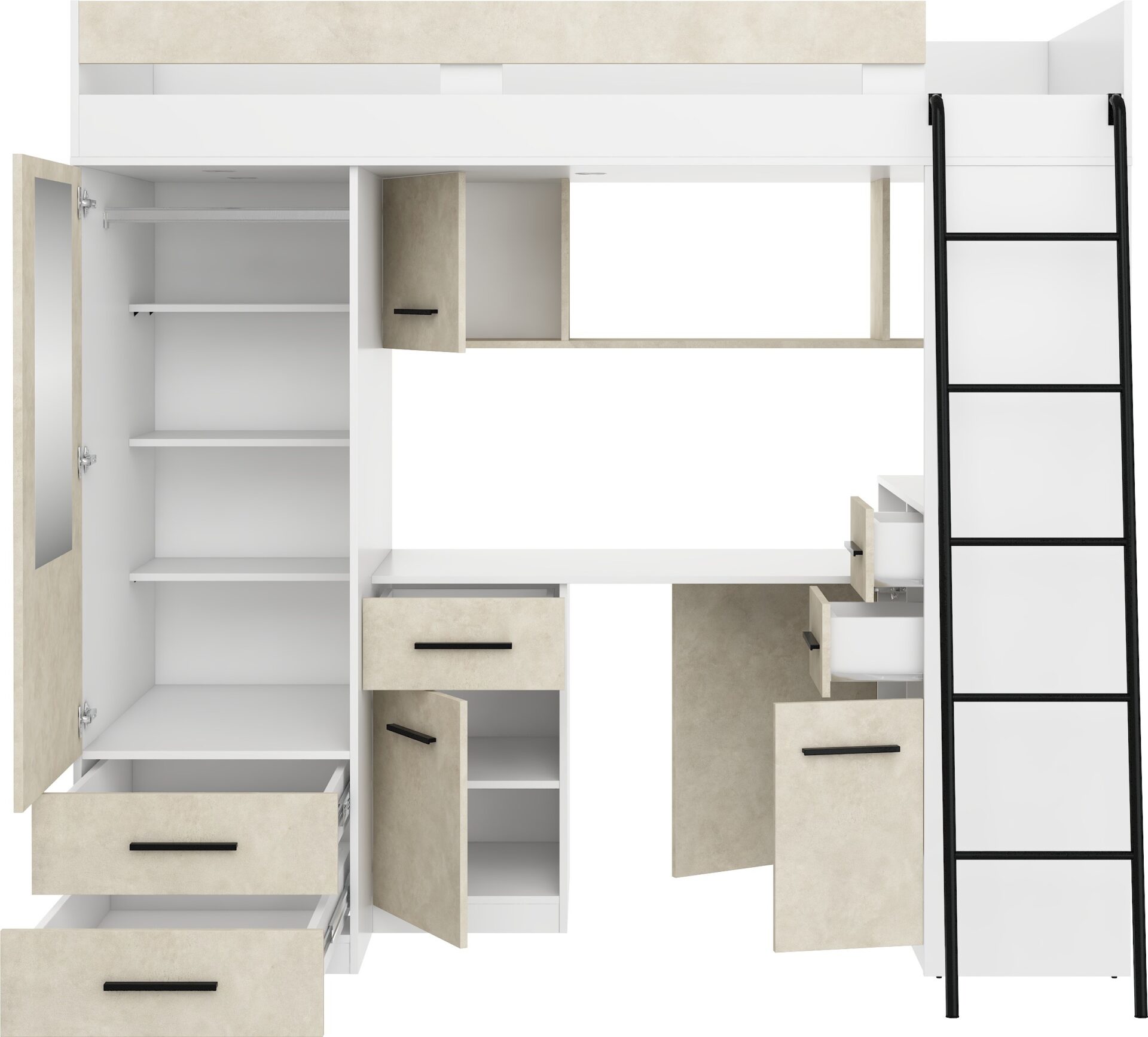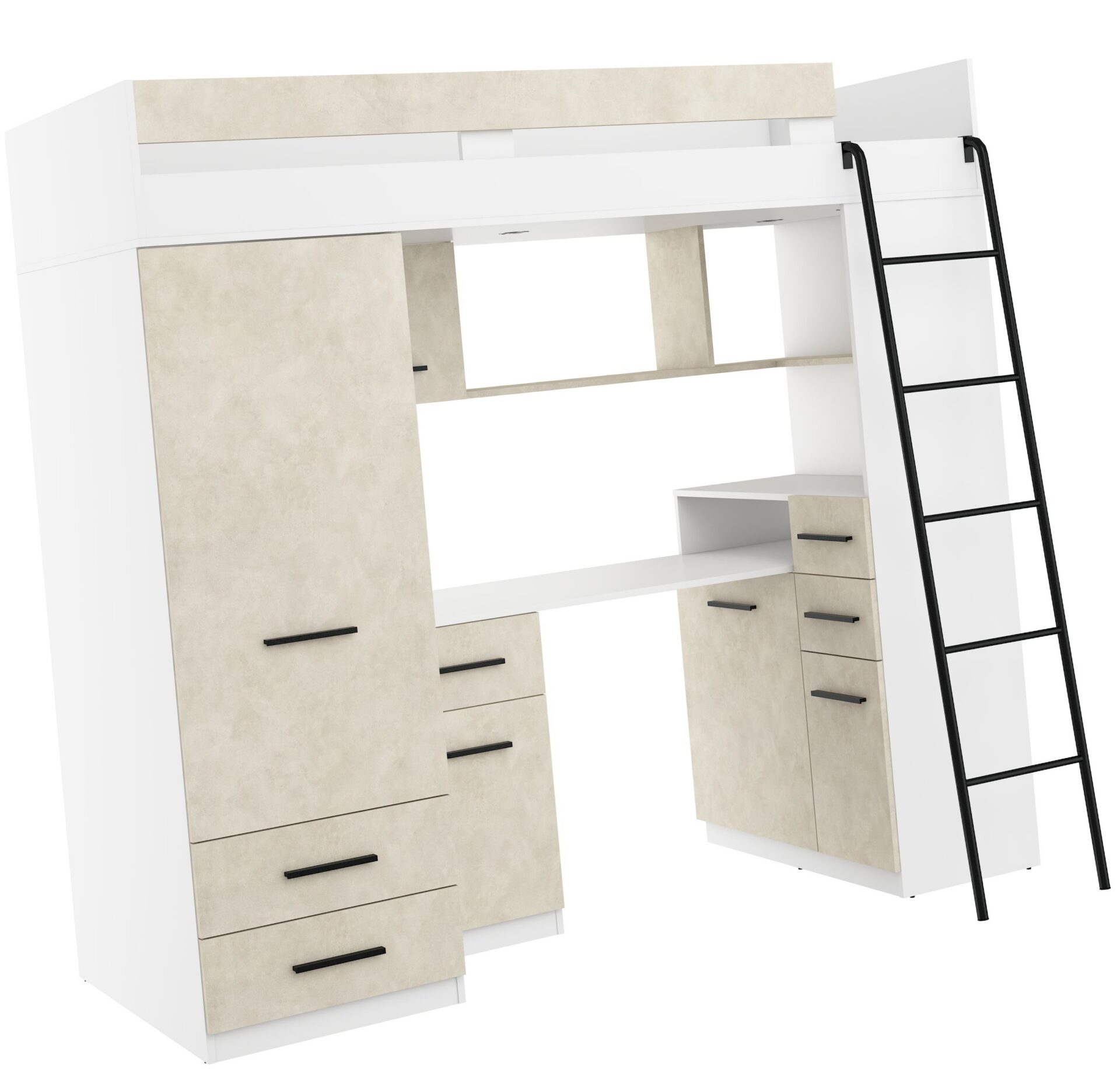 MYKS P mezzanine without mattress. 16 mm board, ABS edge, soft-close drawers and cabinets. Color: white / granada almond