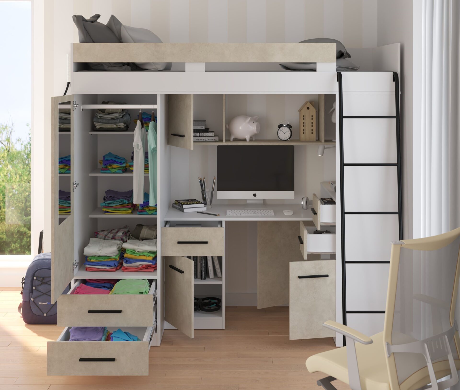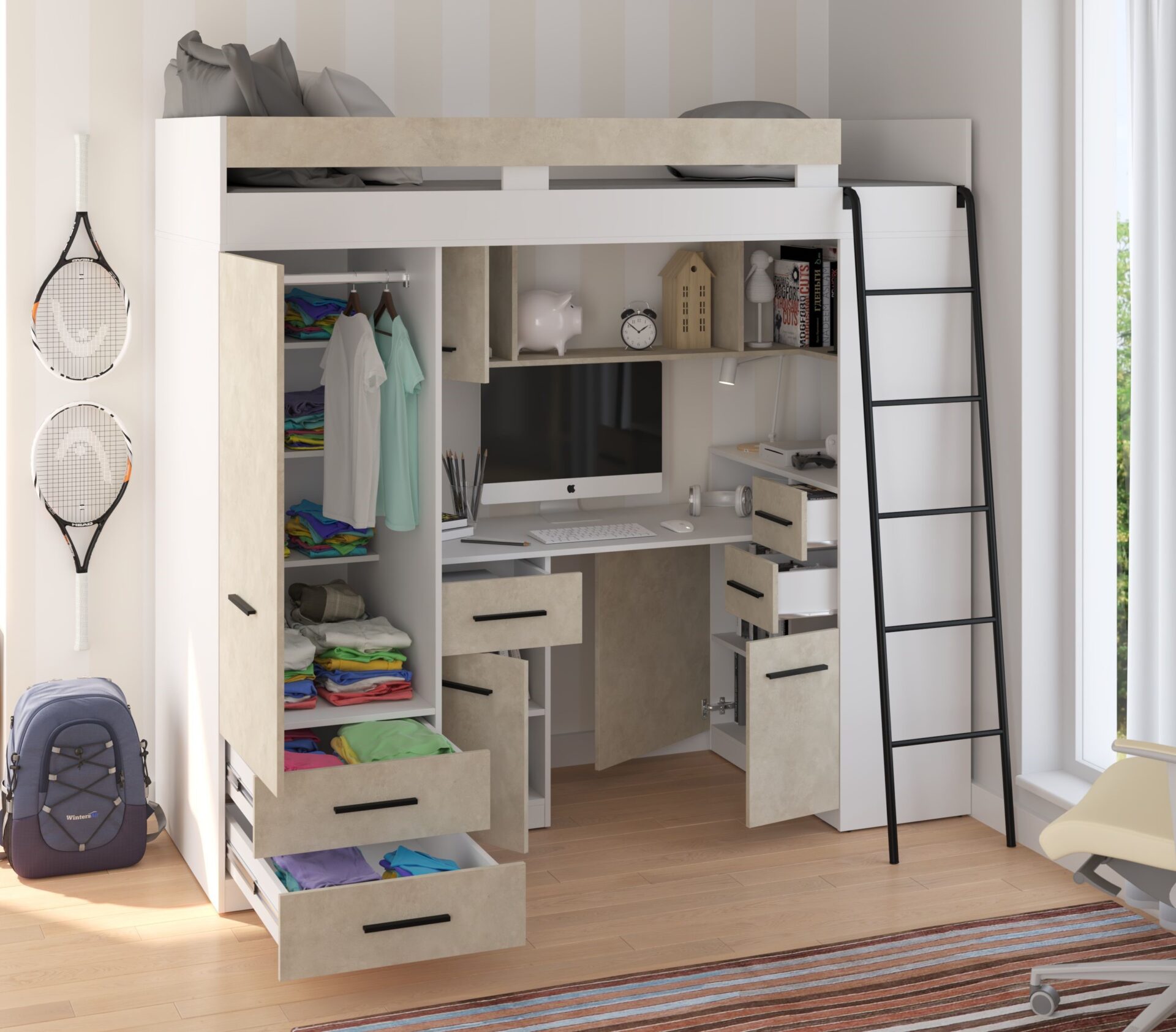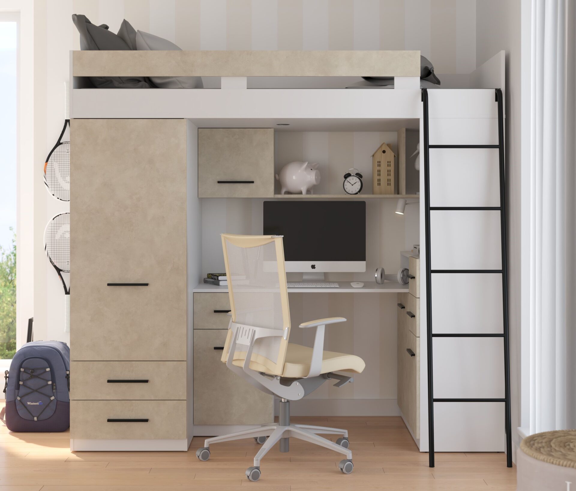 MYKS P mezzanine without mattress. 16 mm board, ABS edge, soft-close drawers and cabinets. Color: white / granada almond