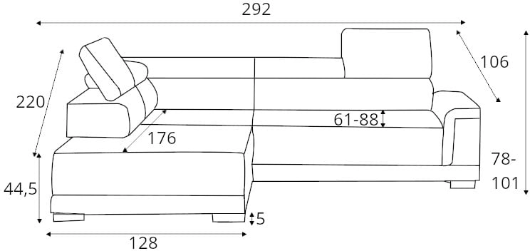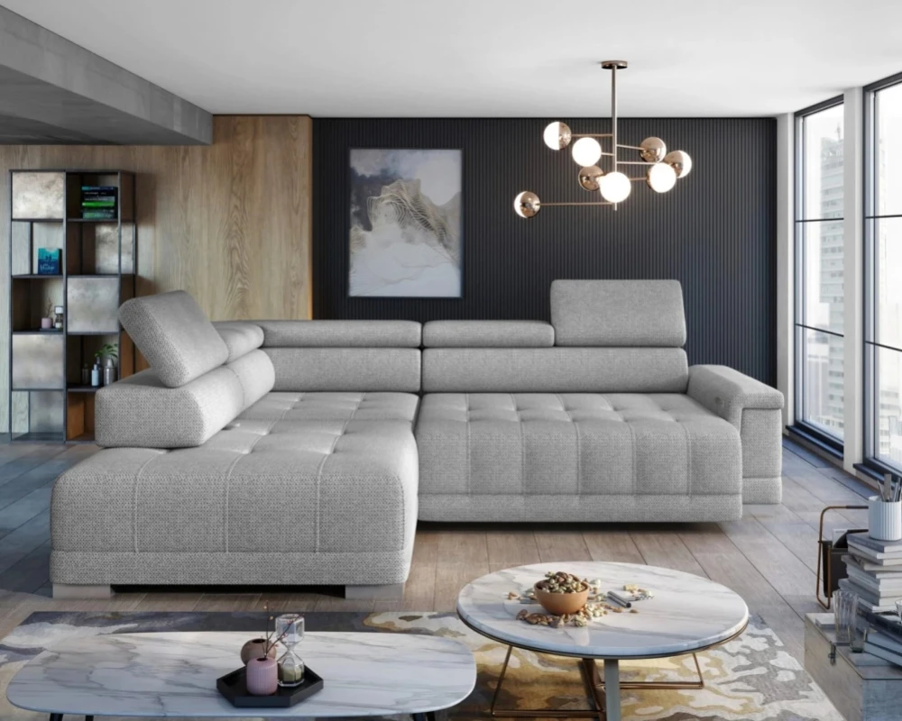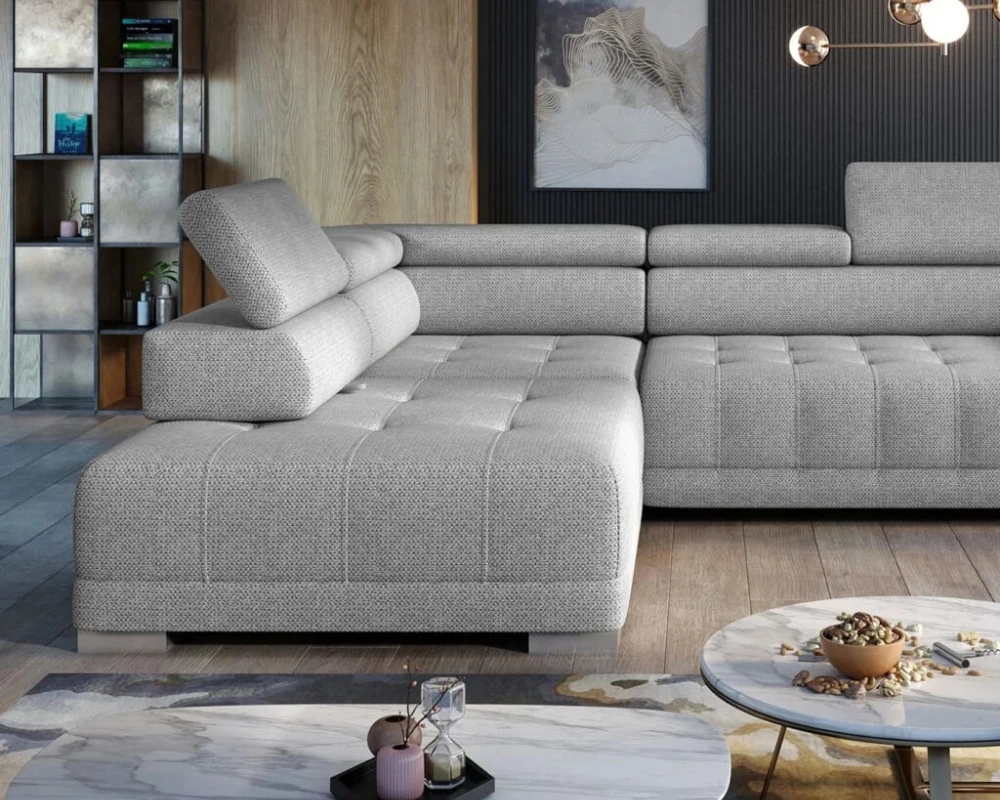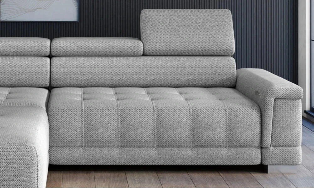 The Campo model from the Avangarde collection is an interesting proposition for both modern and classic interiors. It features a wide and spacious seat with decorative stitching, a sliding backrest with adjustable headrests, and electric seat depth adjustment instead of the typical sleeping function or bedding storage. The seat is filled with type A wave springs and N30 polyurethane foam. The backrest is filled with T1818 polyurethane foam. The back is upholstered. The black plastic legs are 5 cm high. The corner sofa is available in left- and right-hand versions. The model is available in Mini, L, and XL sizes.