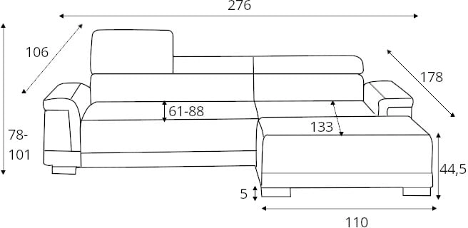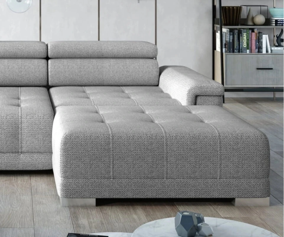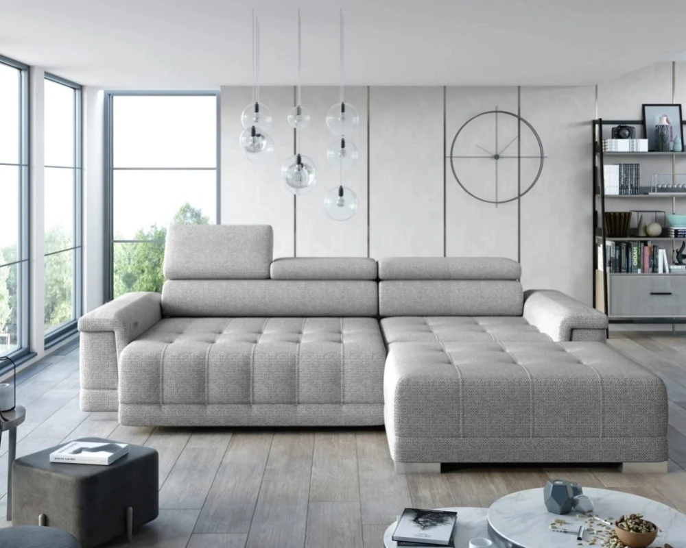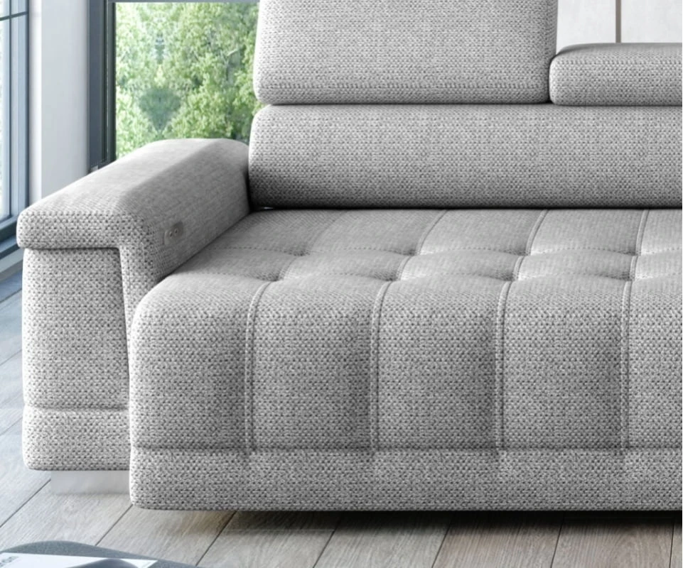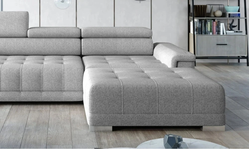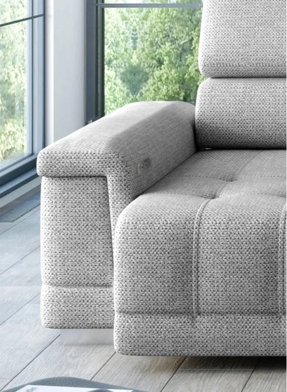 The Campo model from the Avangarde collection is an interesting proposition for both modern and classic interiors. It features a wide and spacious seat with decorative stitching, a sliding backrest with adjustable headrests, and electric seat depth adjustment instead of the typical sleeping function or bedding storage. The seat is filled with type A wave springs and N30 polyurethane foam. The backrest is filled with T1818 polyurethane foam. The back is upholstered. The black plastic legs are 5 cm high. The corner sofa is available in left- and right-hand versions. The model is available in Mini, L, and XL sizes.